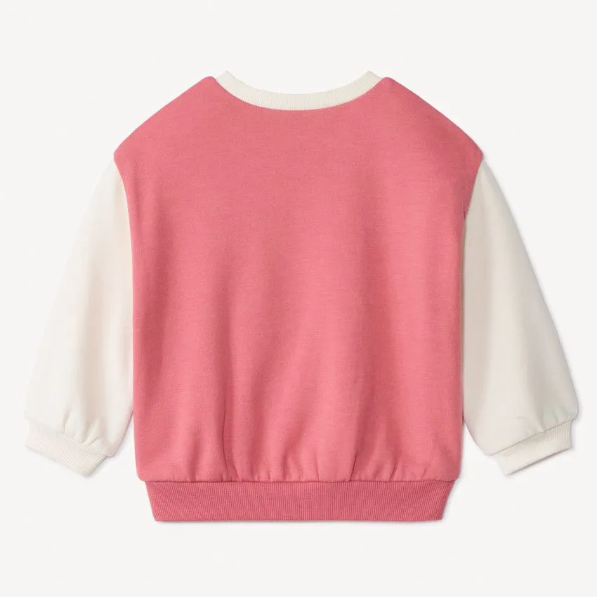 Спереди — блестящий принт и нежный рисунок единорога, а также вышитая надпись с эффектом петель и золотым контуром, которые добавляют образу волшебства и игривости.