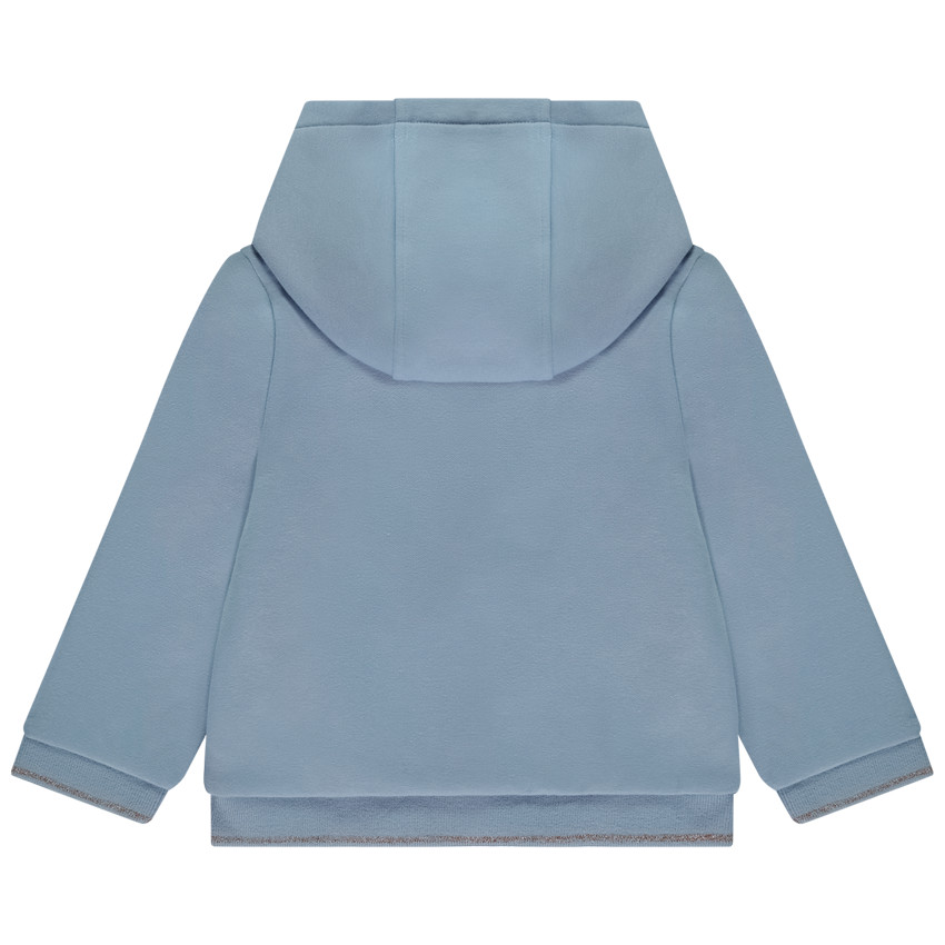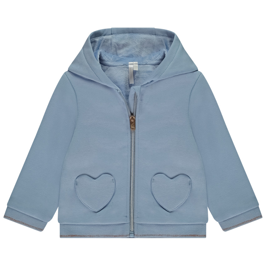 Мягкая и уютная толстовка с длинными рукавами из флиса. Внутри — тёплый подклад из шёрпы для максимального комфорта. Однотонный дизайн дополнен капюшоном и застёжкой-молнией на всю длину. Спереди — два накладных кармана в форме сердечек, придающие модели особое очарование. Манжеты и нижний край украшены блестящей отделкой из люрекса, которая добавляет стильный акцент. Спинка гладкая, без декора — практичное и универсальное решение для повседневных образов.