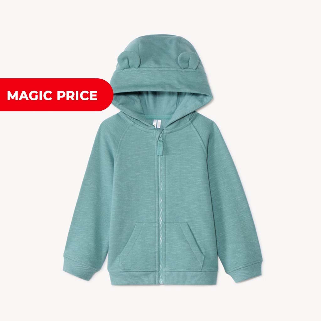 Толстовка из мягкого начёсанного трикотажа. Капюшон с объёмными 3D-ушками мишки придаёт модели игривый акцент. Спереди — застёжка-молния с защитой от защемления и два накладных кармана с эффектом «кенгуру». Рукава покроя реглан, манжеты и нижний край выполнены из эластичного трикотажа в рубчик для удобной посадки.