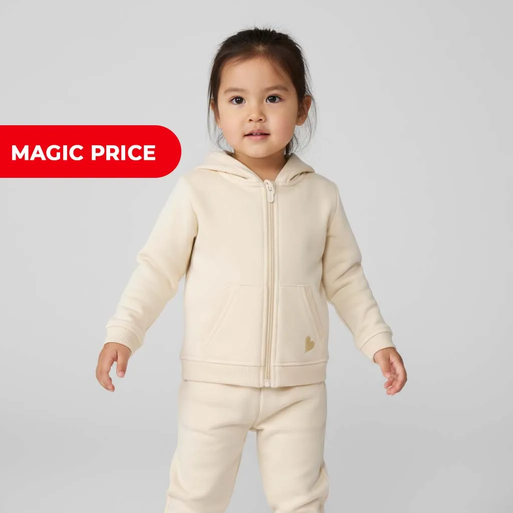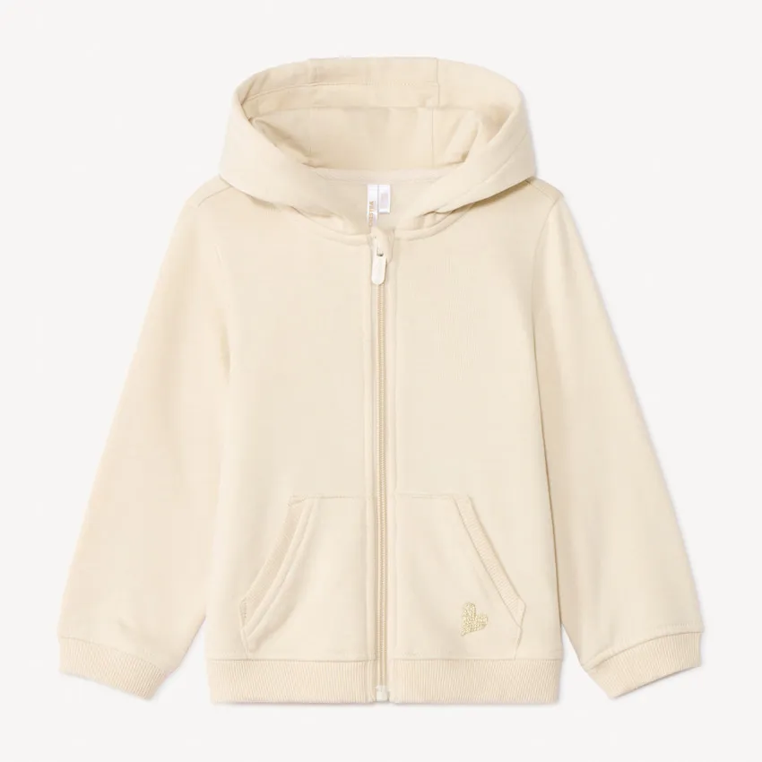 Толстовка с капюшоном из мягкого футера для малышек для повседневного комфорта. Удобная застёжка-молния с защитой подбородка делает модель практичной и безопасной. Толстовка дополнена накладными карманами-кенгуру, украшенными милым вышитым сердечком из золотого люрекса.