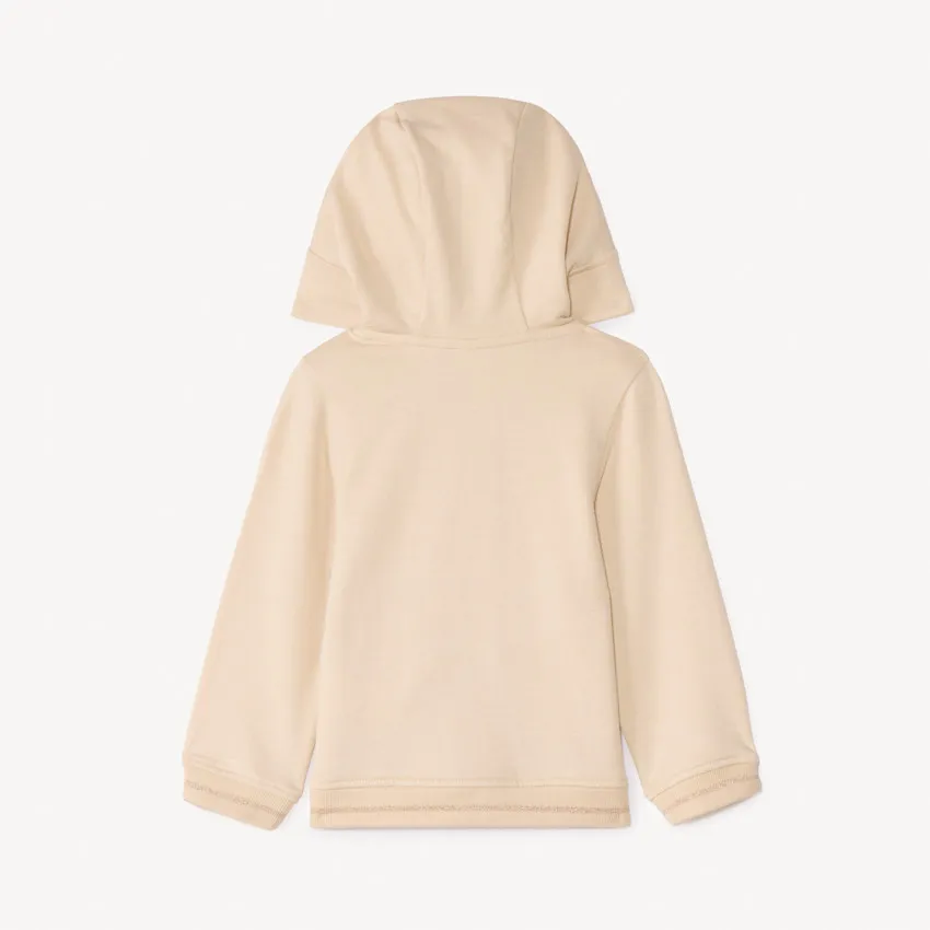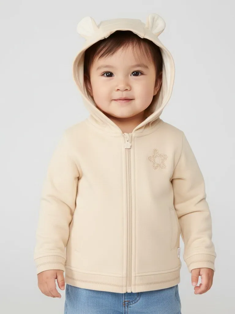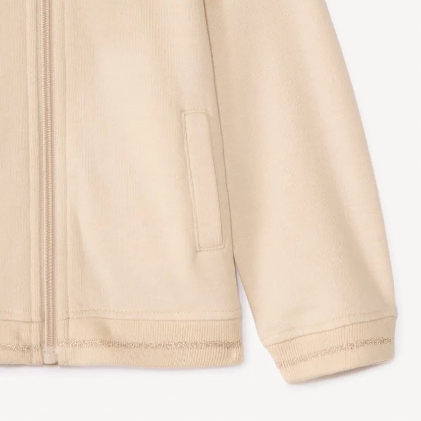 Мягкая толстовка для девочки выполнена из приятного флисового материала, который сохраняет тепло и обеспечивает комфорт в прохладную погоду. Нежный бежевый оттенок делает модель универсальной и легко сочетаемой с разными элементами гардероба.