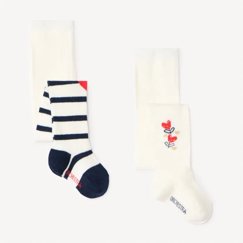 Набор из двух пар плотных трикотажных колготок цвета экрю. В комплект входят: однотонная модель с жаккардовым сердечком у основания и модель с синими полосками и красным сердечком внизу. Эластичный пояс обеспечивает комфортную посадку.