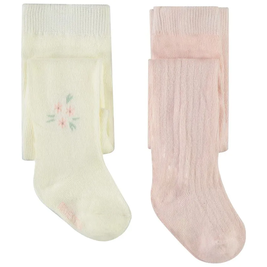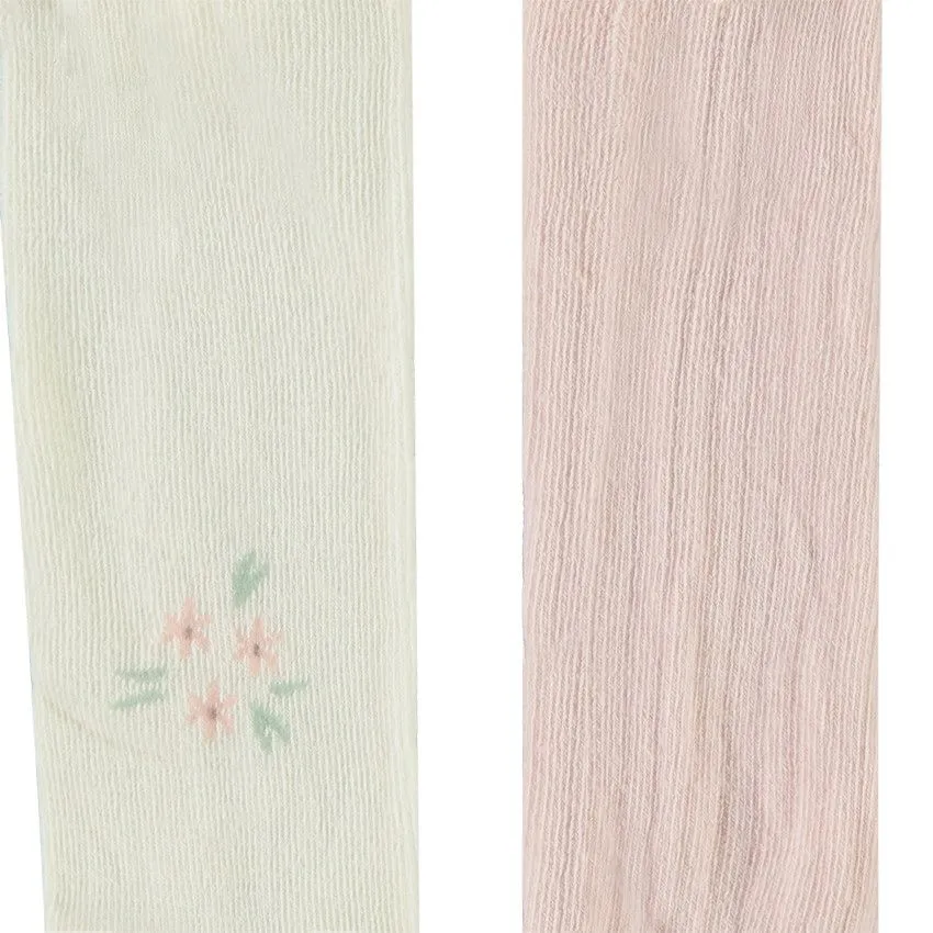 Этот комплект из двух пар плотных колготок — стильный и практичный выбор для девочек! Обе пары имеют эластичные ребристые пояса, которые обеспечивают комфортную посадку. Первая пара выполнена в нежном однотонном молочном цвете и украшена изысканным цветочным жаккардовым узором на щиколотках, добавляя утончённости и элегантности. Вторая пара в бледно-розовом цвете отличается ребристым эффектом вдоль ног, придавая дополнительную текстуру и стиль. На подошвах каждой пары колготок — контрастный брендинг, который подчеркивает их уникальность.