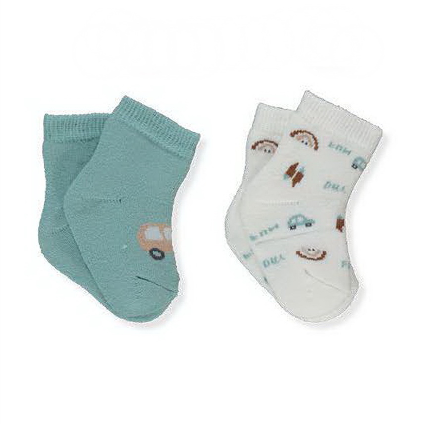 | Набор из 2 пар детских носков. Одна пара — однотонная с рисунком машинки, вторая — с принтом машинки, радуги и надписи. Мягкие, эластичные и комфортные — идеально подойдут для малышей на каждый день. |