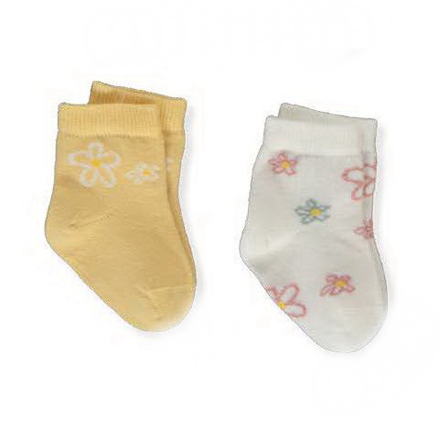 Набор из 2 пар носков для малышей. Одна пара однотонная, украшена небольшим цветочным рисунком чуть ниже резинки. Вторая пара оформлена нежным цветочным принтом по всей длине. Носочки мягкие и комфортные, хорошо держатся на ножке и подойдут для повседневной носки.