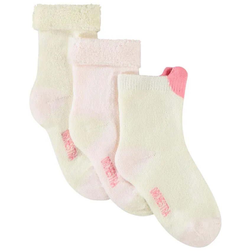 Набор комфортных, мягких носков для девочек. В упаковке три пары, каждая из которых отличается друг от друга. Две пары выполнены в нежных однотонных оттенках — экрю и бледно-розовом, с яркими контрастными пятками и носками. Двое носков с отваротом,  придавая модели легкую игривость. Третья пара нежно молочного цвета дополнена ушками, украшенным контрастным тиснением в виде милого сердца, что добавляет оригинальности и уюта. Каждый шаг будет как маленький модный подвиг с такими носочками!