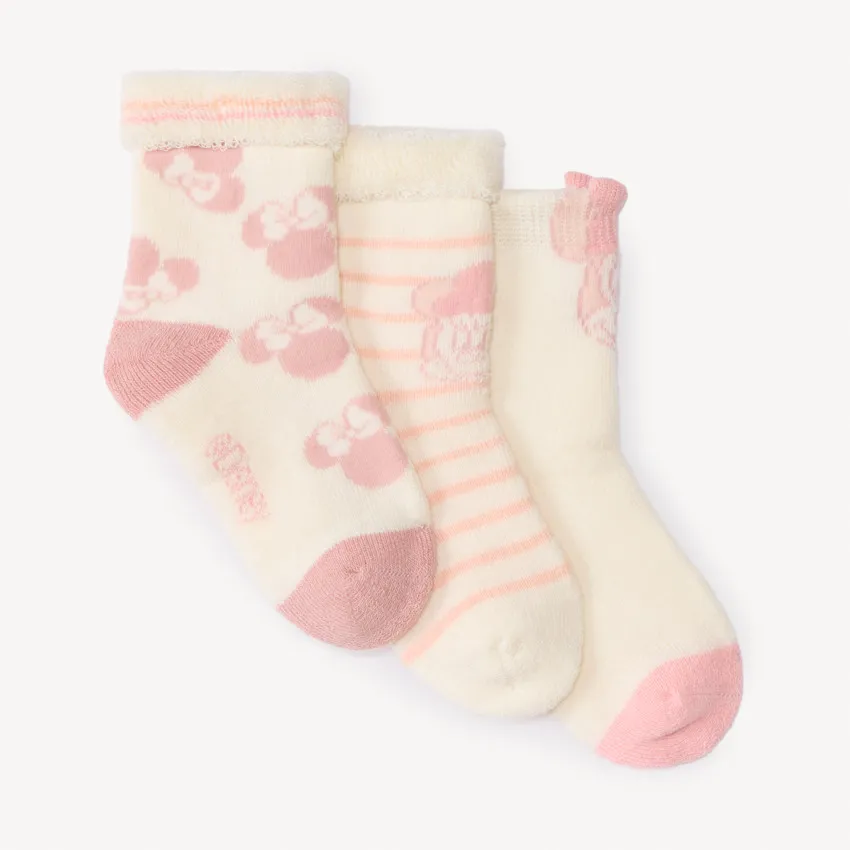 Набор из трёх пар мягких и уютных носочков, созданных с акцентом на комфорт и нежный дизайн. Трикотаж с петлевой изнанкой обеспечивает тепло и приятные ощущения при носке, а разнообразные мотивы делают комплект универсальным и стильным. В набор входят три варианта: пара с принтом персонажа по всей поверхности и контрастными розовыми мысками и пяткой; пара в тонкую полоску с изображением персонажа спереди; а также однотонная пара с эластичными манжетами в рубчик и объёмным 3D-элементом. Каждый рисунок уникален — три разных образа в одном комплекте для ярких и уютных дней.