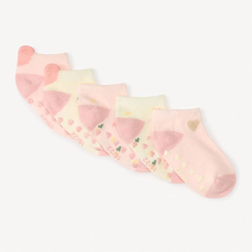 Набор из 5 коротких носков для малышки — удобный и практичный вариант для повседневной носки. Носки выполнены из мягкого и приятного к телу материала (71% хлопок, 22% полиамид, 4% полиэстер, 2% эластан), который обеспечивает хорошую воздухопроницаемость, комфорт и эластичную посадку. Модели представлены в разных цветах и с милыми рисунками. На подошве предусмотрены нескользящие элементы, которые помогают малышу увереннее делать первые шаги. Отличный вариант для дома и повседневного использования.