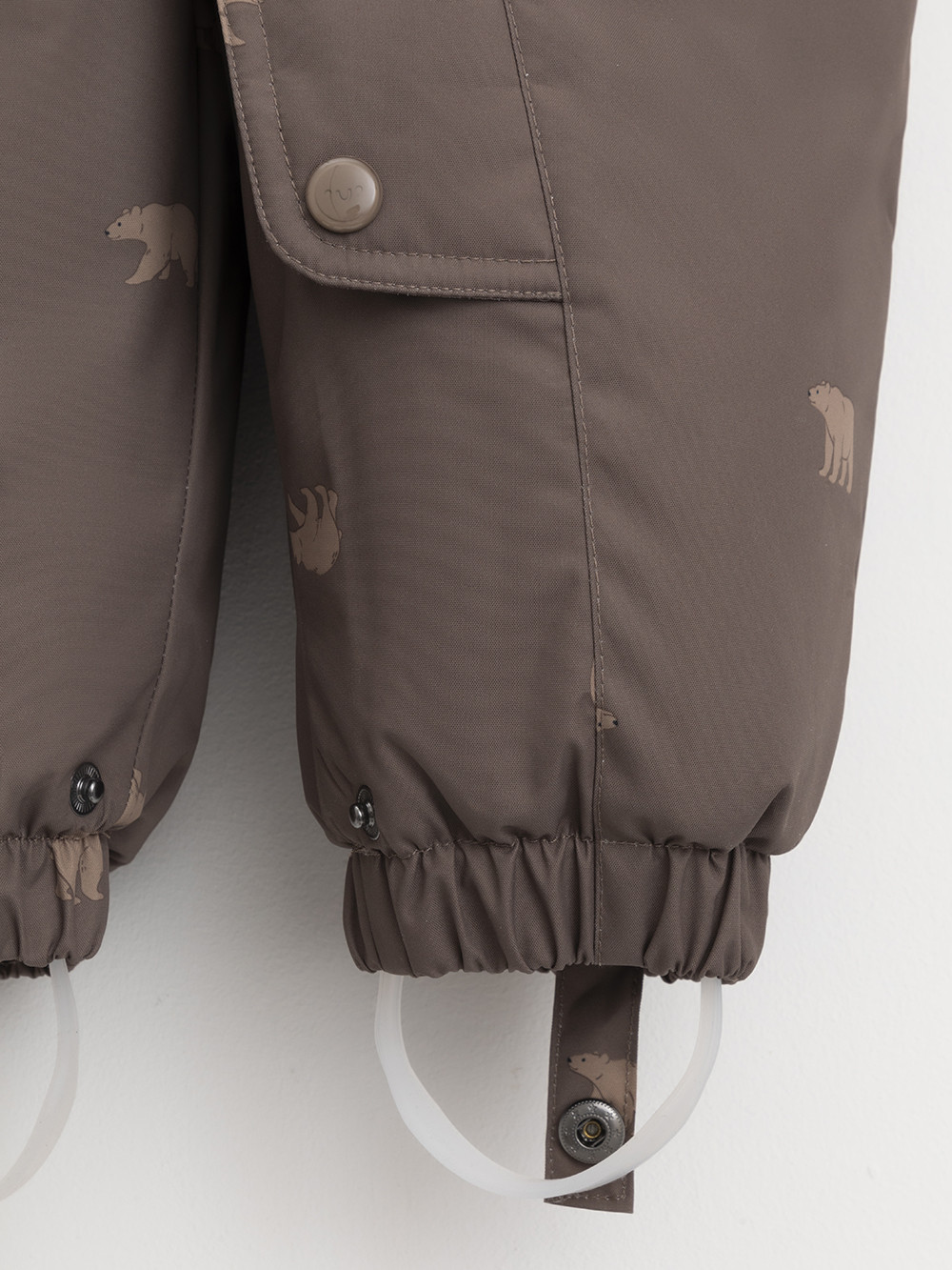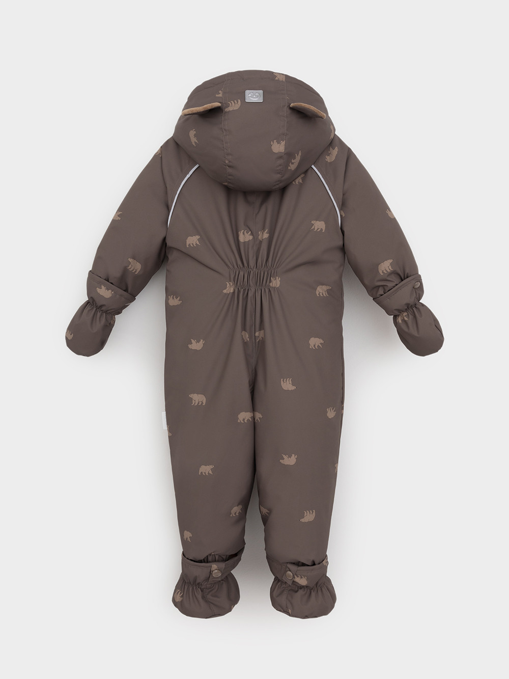 Комбинезон застёгивается на молнию и планку на липучках, оснащён защитой подбородка. Несъёмный капюшон регулируется эластичной утяжкой со стопперами. Для лучшей посадки предусмотрена резинка по спинке.