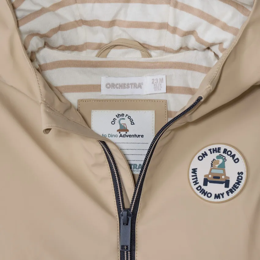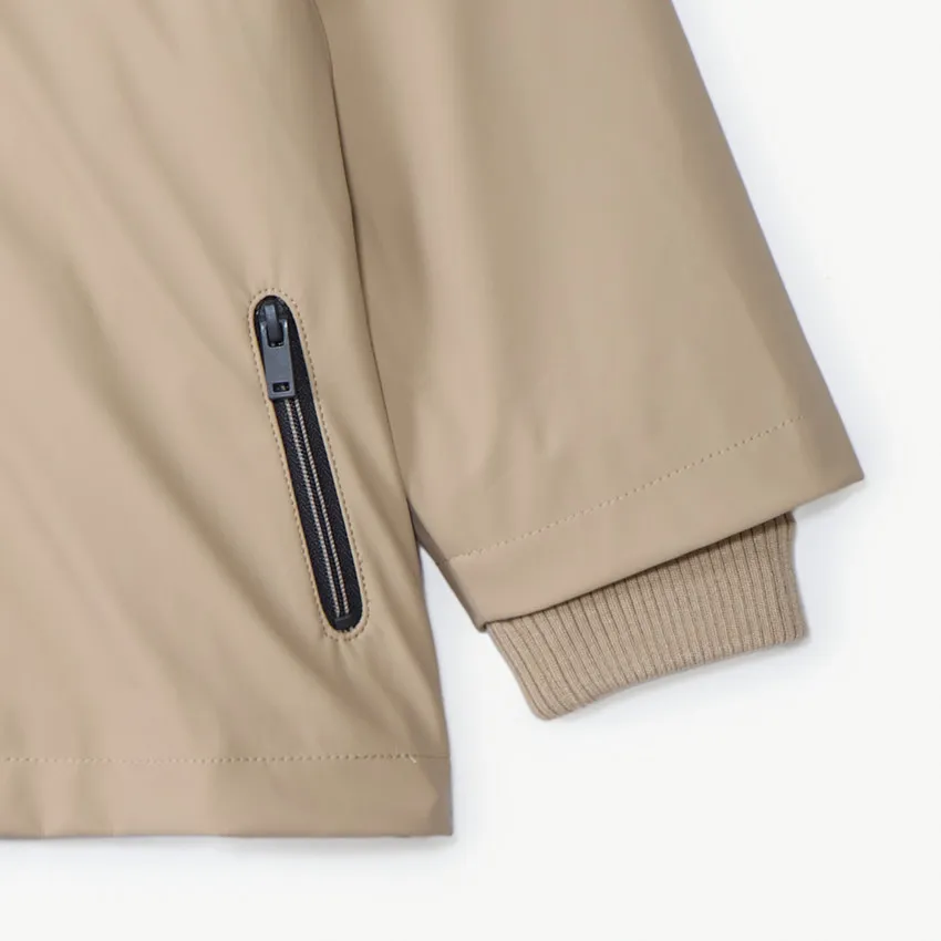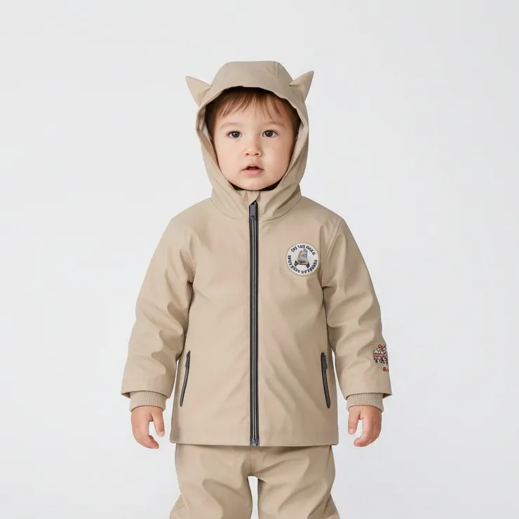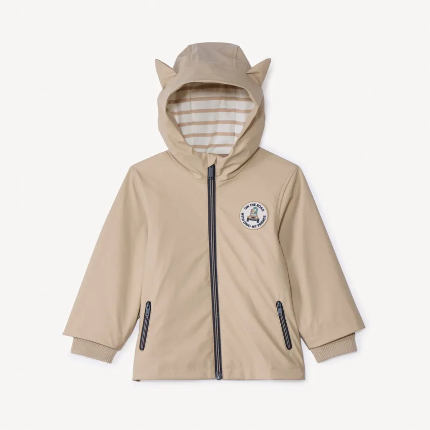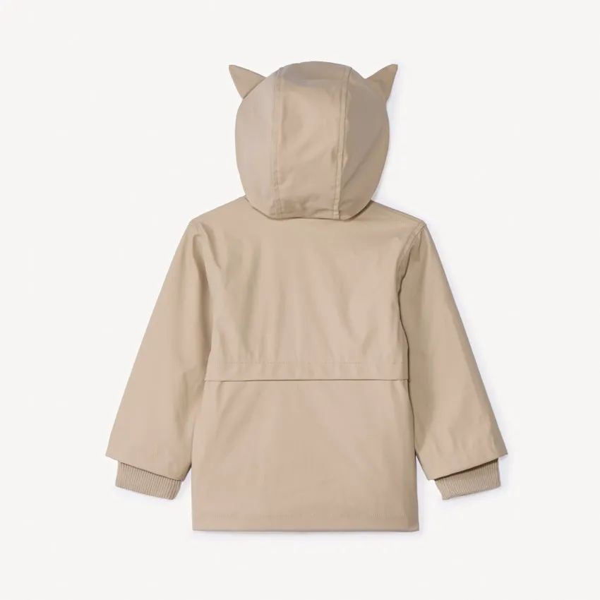 Водоотталкивающая парка для мальчиков без утепления с высоким капюшоном, украшенным 3D-ушками на макушке. Водонепроницаемая застёжка-молния спереди надёжно защищает от влаги. Спереди расположены два водонепроницаемых кармана на молнии. Рукава дополнены внутренними манжетами из эластичного трикотажа, обеспечивающими комфортную посадку.
