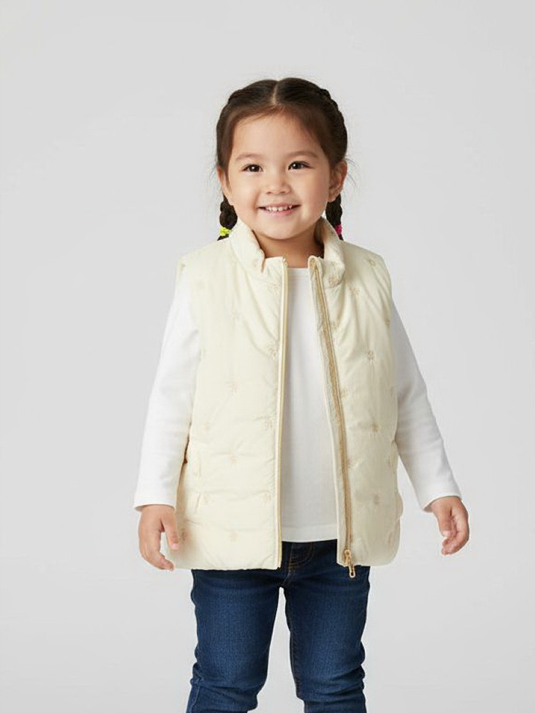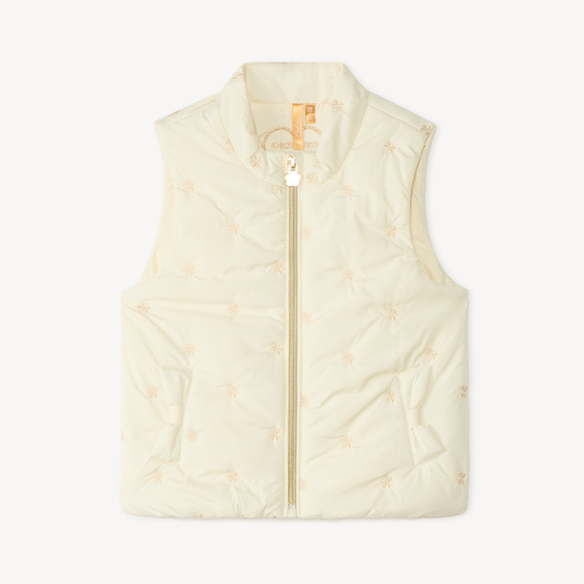 Жилет имеет высокий воротник и застёжку на двухцветную молнию с защитой подбородка. Бегунок молнии выполнен в форме золотистого цветка, добавляя милую деталь в дизайн. Спереди расположены два оригинальных кармана в форме бантиков. Внутри жилет имеет мягкую трикотажную подкладку для комфорта, а наполнитель из переработанных материалов помогает сохранять тепло. Внутри воротника предусмотрена фирменная именная бирка с лёгким блеском.