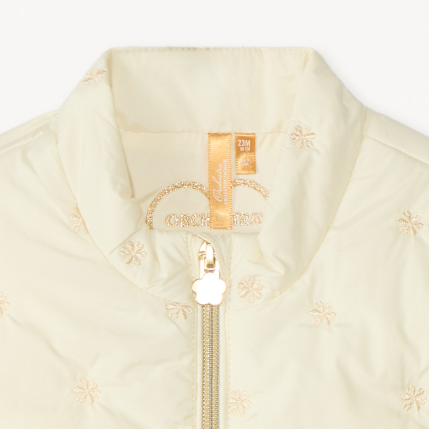 Красивый жилет ORCHESTRA в нежном кремовом цвете станет стильным дополнением к гардеробу ребёнка. Модель украшена изящной вышивкой с золотыми цветами по всей поверхности, что придаёт ей особый и нарядный вид.