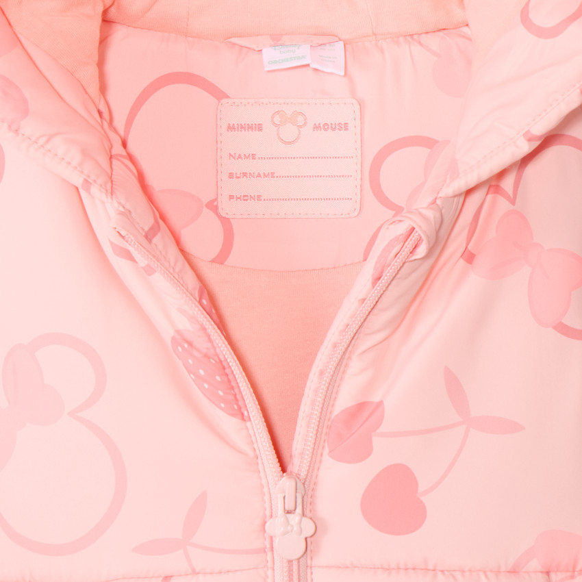 Жилет дополнен капюшоном с ушками и объёмным бантом, что придаёт образу особое очарование. Модель застёгивается на молнию с защитой подбородка, а бегунок выполнен в форме Минни. Спереди расположены два оригинальных кармана в форме бантиков. Внутри жилет имеет мягкую трикотажную подкладку для комфорта, а наполнитель из переработанных материалов помогает сохранять тепло. Внутри воротника предусмотрена именная бирка для подписи.