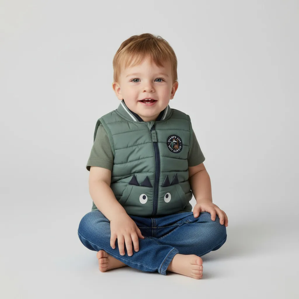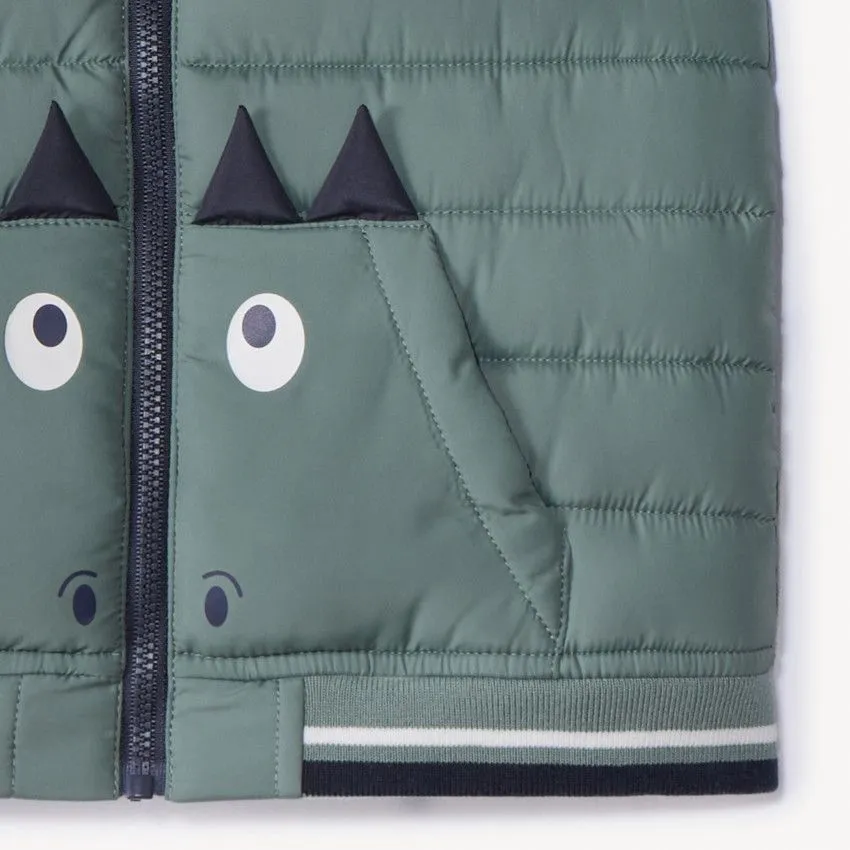 Модель дополнена удобным карманом-кенгуру с милой рожицей динозавра, который делает жилетку яркой и привлекательной для ребёнка. Такой декоративный элемент добавляет образу игривости и оригинальности.
