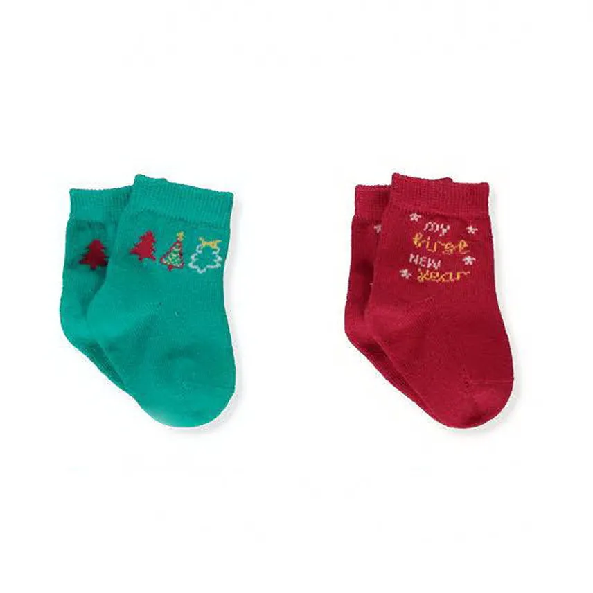 Набор из двух пар мягких детских носочков с новогодними мотивами. Выполнены в праздничных цветах — красном и зеленом. Украшены милыми вышивками: ёлочками, звездочками и декоративными элементами. Идеально подойдут для создания уютного и праздничного образа малыша.