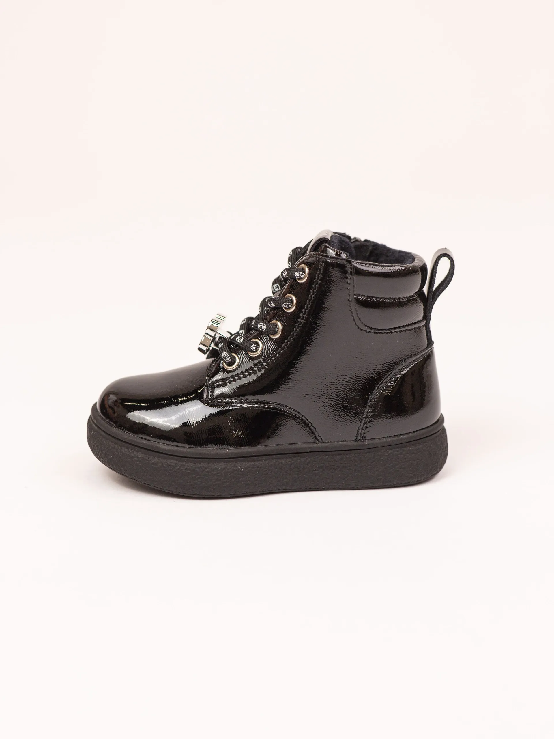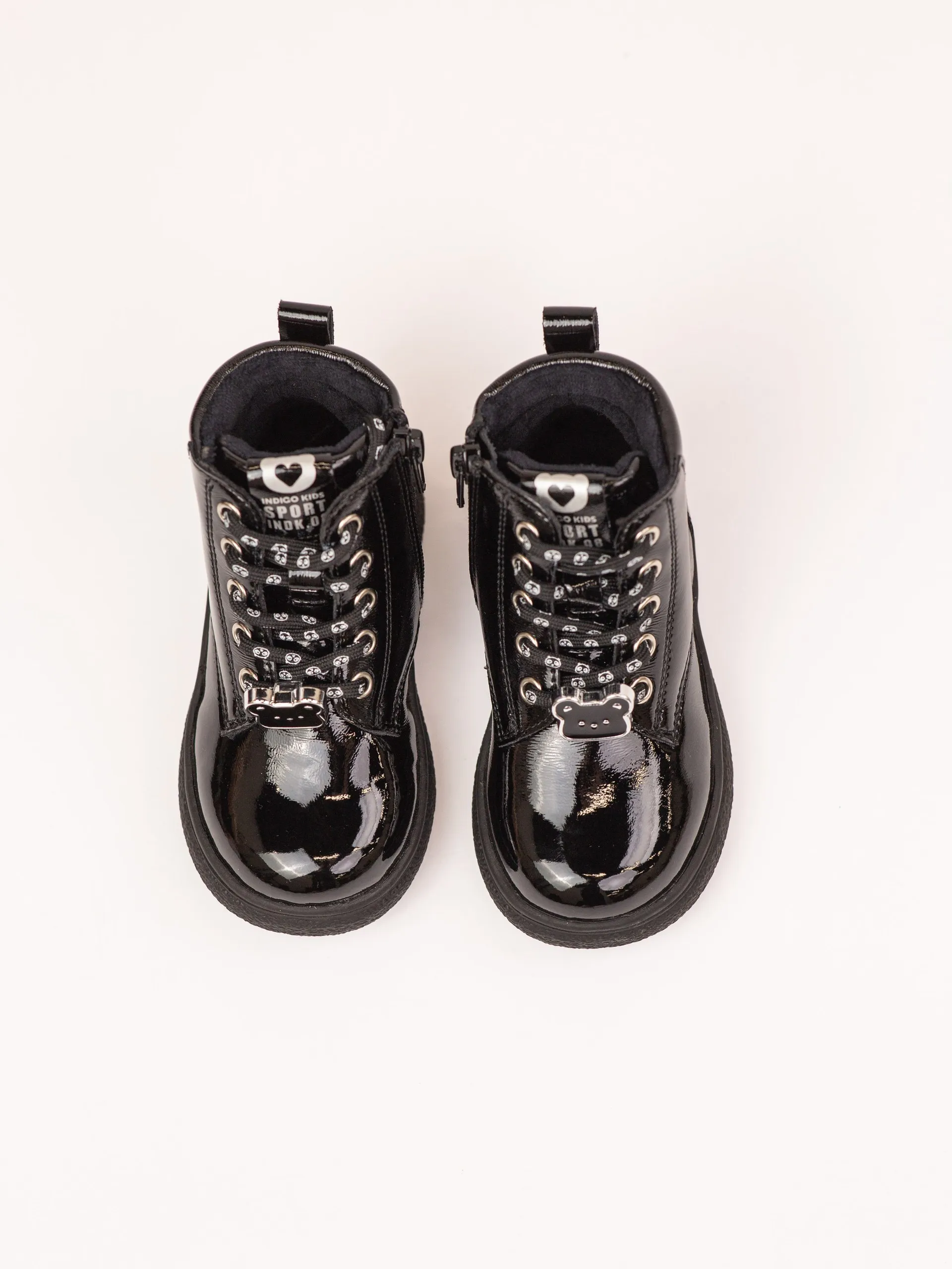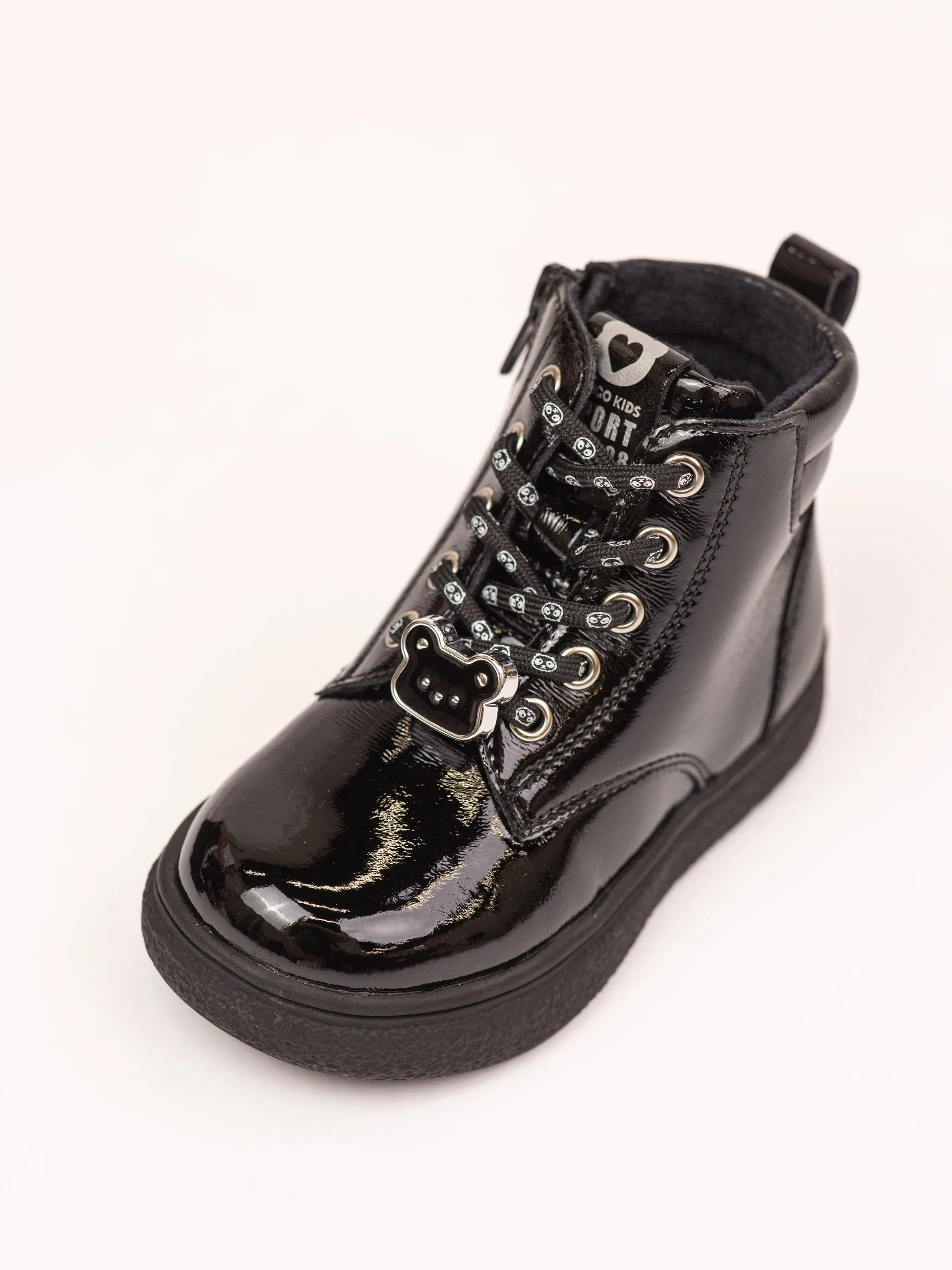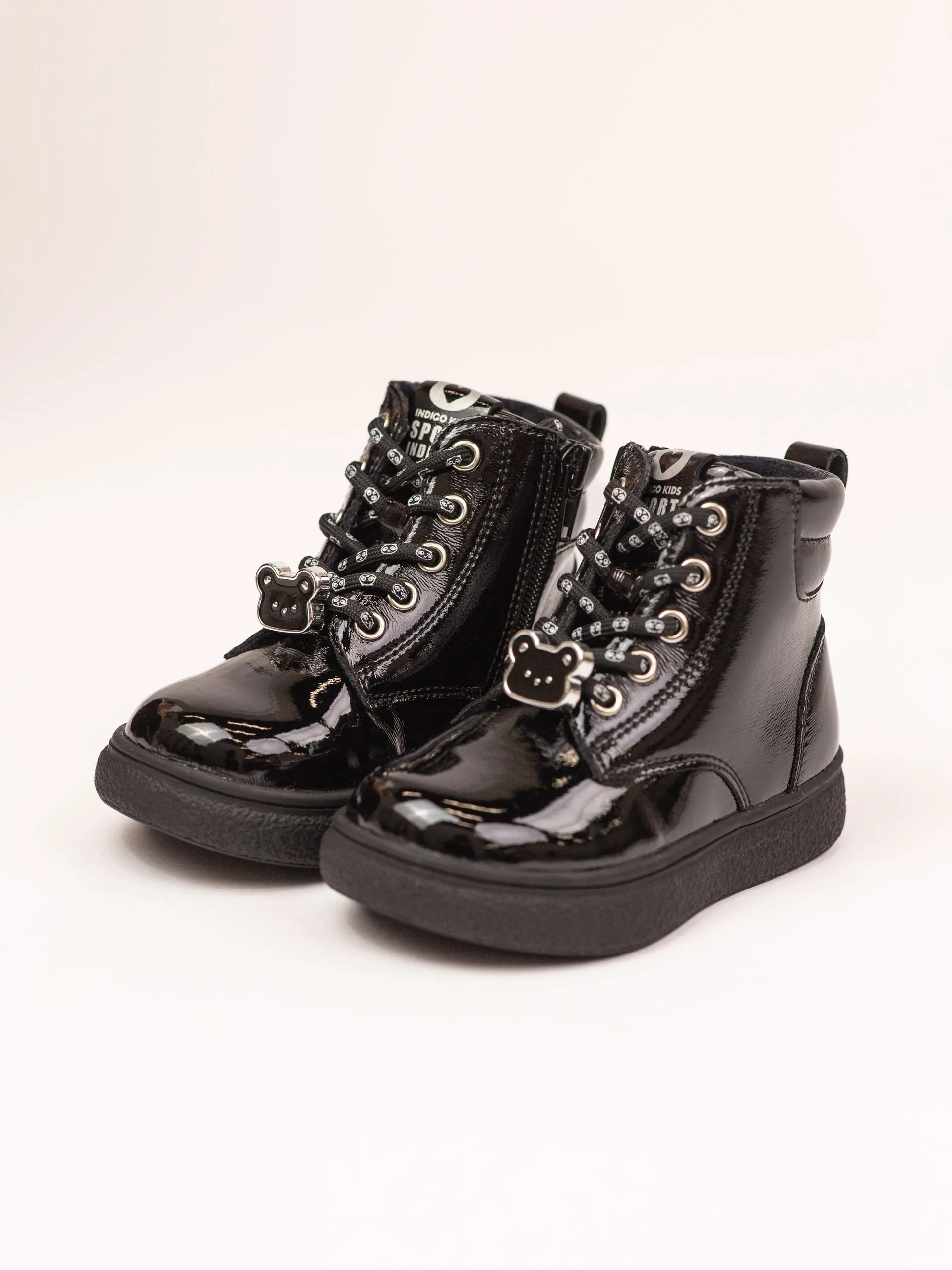 Ботинки INDIGO KIDS выполнены из натуральной лакированной кожи наплак, которая обеспечивает воздухопроницаемость и комфорт. Мягкий хлопковый подклад сохраняет тепло и сухость, а подошва SUPER FLEX из ТЭП прочная, гибкая, устойчивая к низким температурам и не скользит. Удобная колодка и ортопедическая стелька способствуют правильному формированию стопы. Для удобства ботинки оснащены боковой молнией и шнуровкой с декоративным элементом.