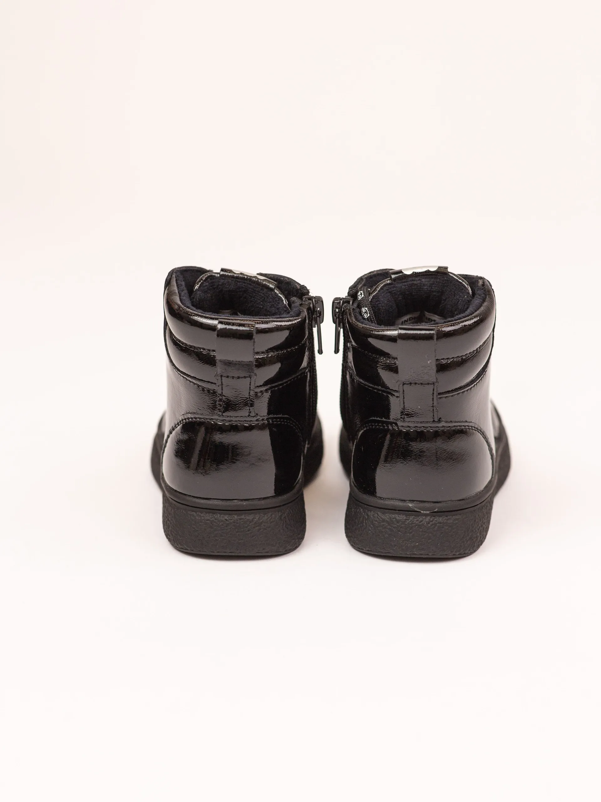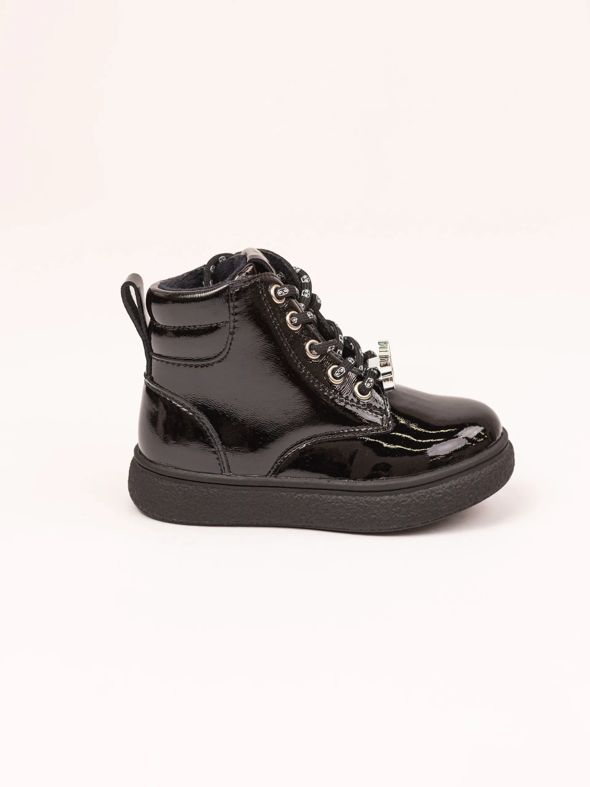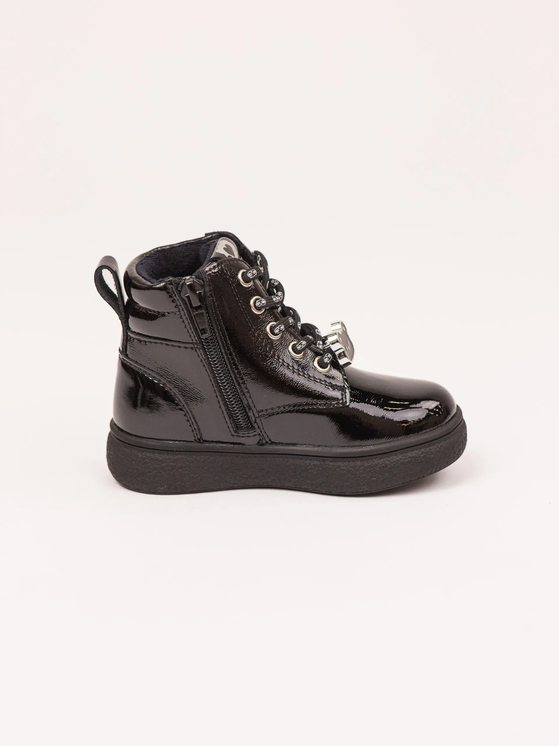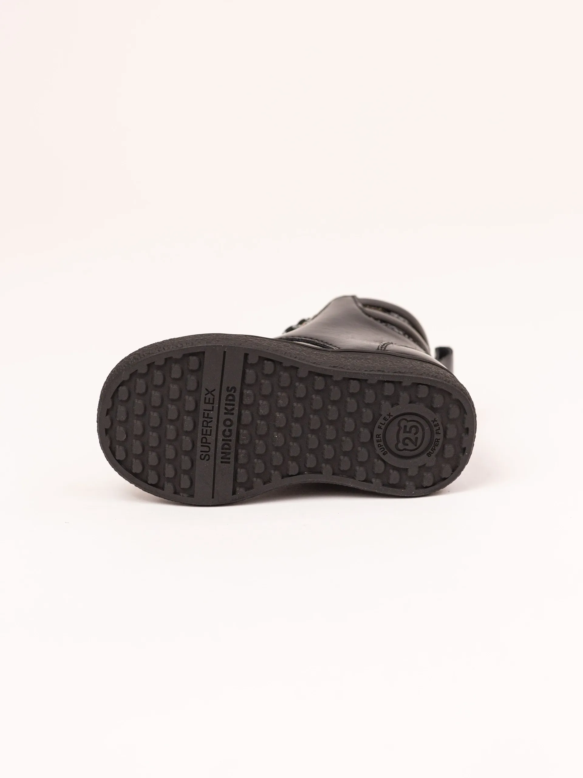 Ботинки INDIGO KIDS выполнены из натуральной лакированной кожи наплак, которая обеспечивает воздухопроницаемость и комфорт. Мягкий хлопковый подклад сохраняет тепло и сухость, а подошва SUPER FLEX из ТЭП прочная, гибкая, устойчивая к низким температурам и не скользит. Удобная колодка и ортопедическая стелька способствуют правильному формированию стопы. Для удобства ботинки оснащены боковой молнией и шнуровкой с декоративным элементом.