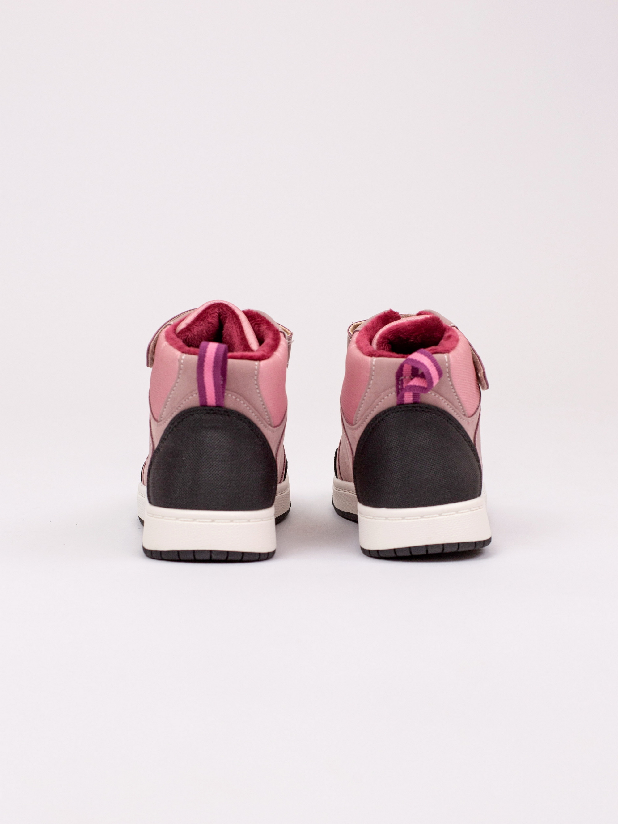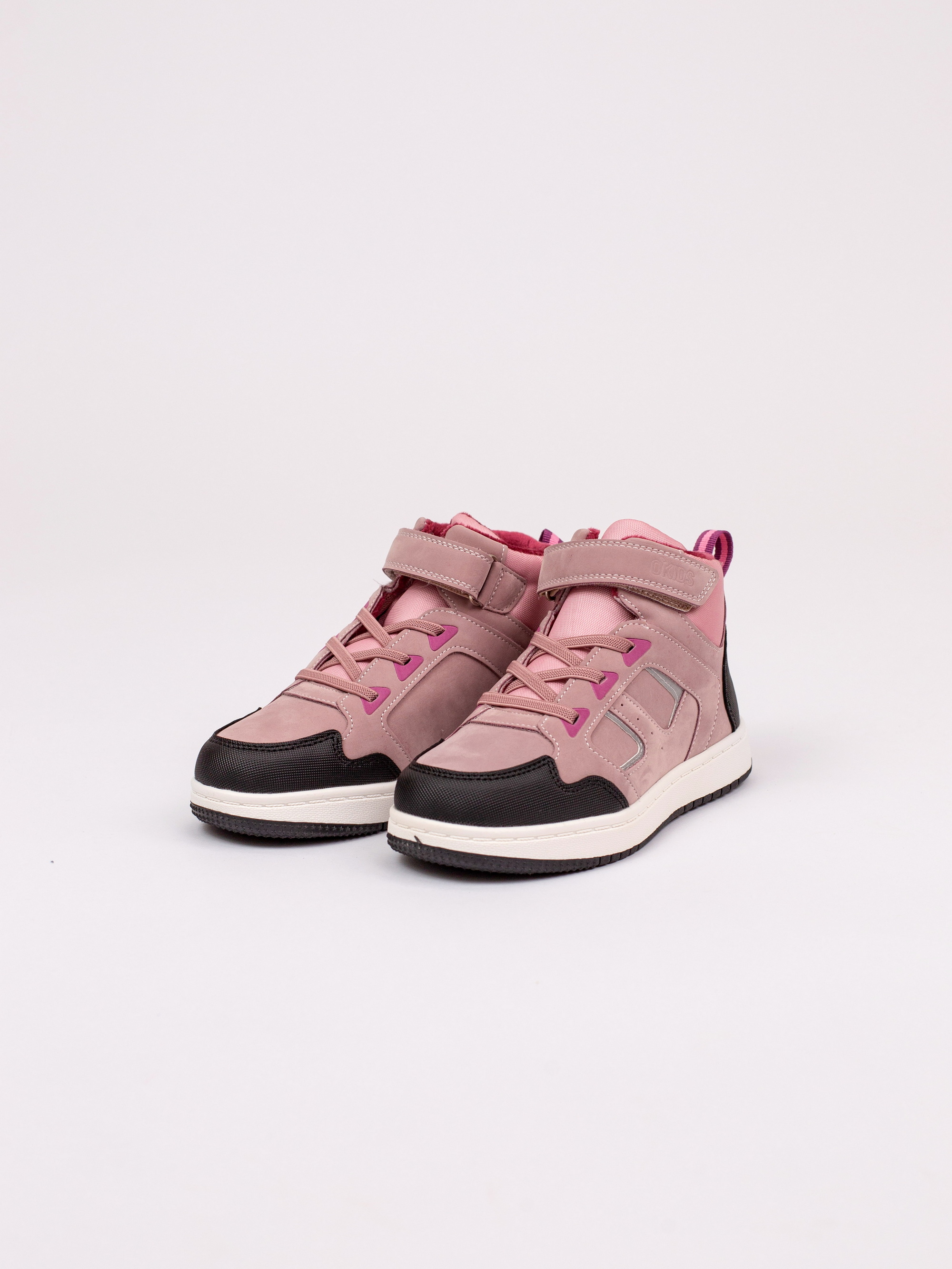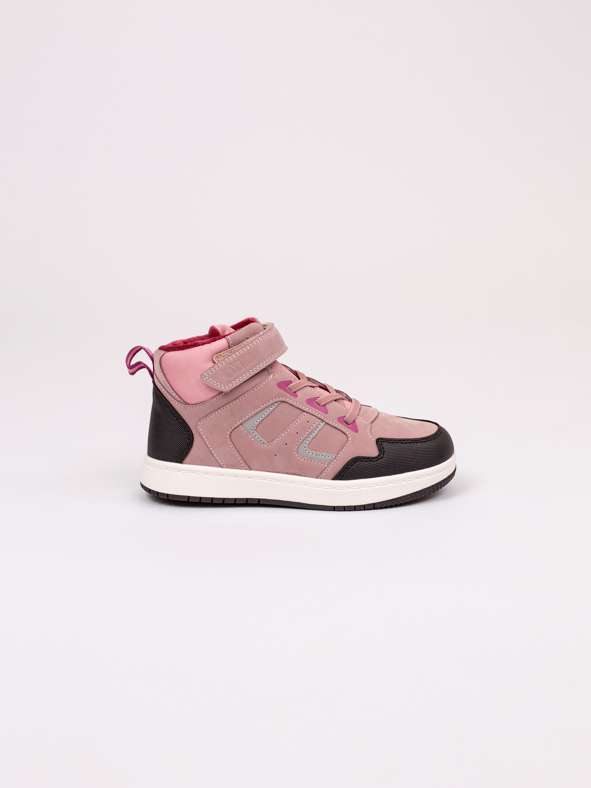 Модель фиксируется с помощью липучки и эластичных шнурков-резинок, что позволяет быстро надевать и снимать обувь. Защитный носок предотвращает повреждения и продлевает срок службы ботинок. Светоотражающие полоски на боковой части повышают видимость ребёнка в тёмное время суток, обеспечивая дополнительную безопасность.