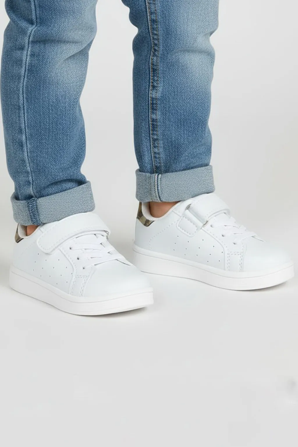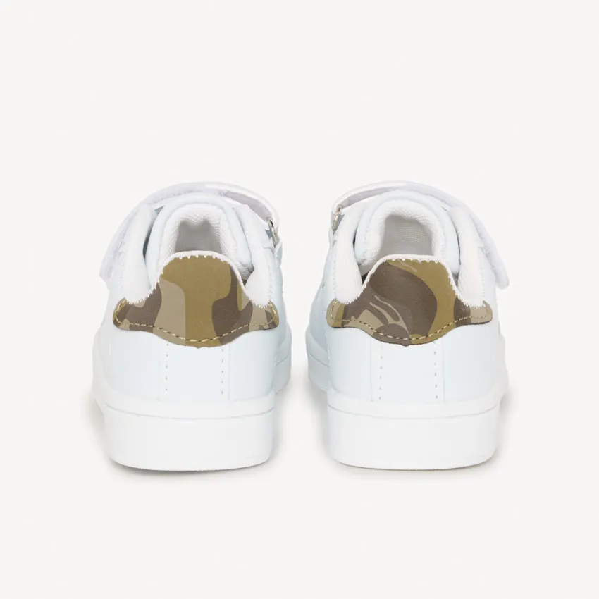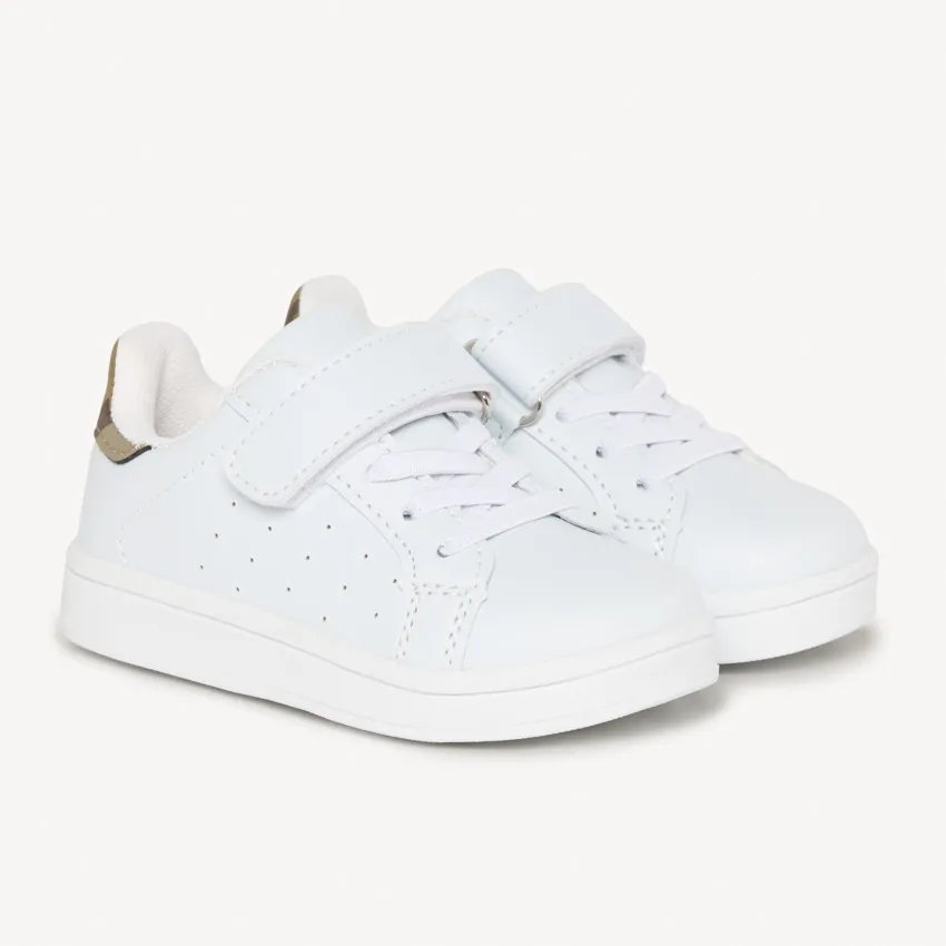 Эти кеды для малышей — удобная и практичная модель для первых активных прогулок и повседневной носки. Лаконичный белый дизайн с аккуратным контрастным акцентом на пятке делает обувь универсальной и легко сочетаемой с любой детской одеждой.