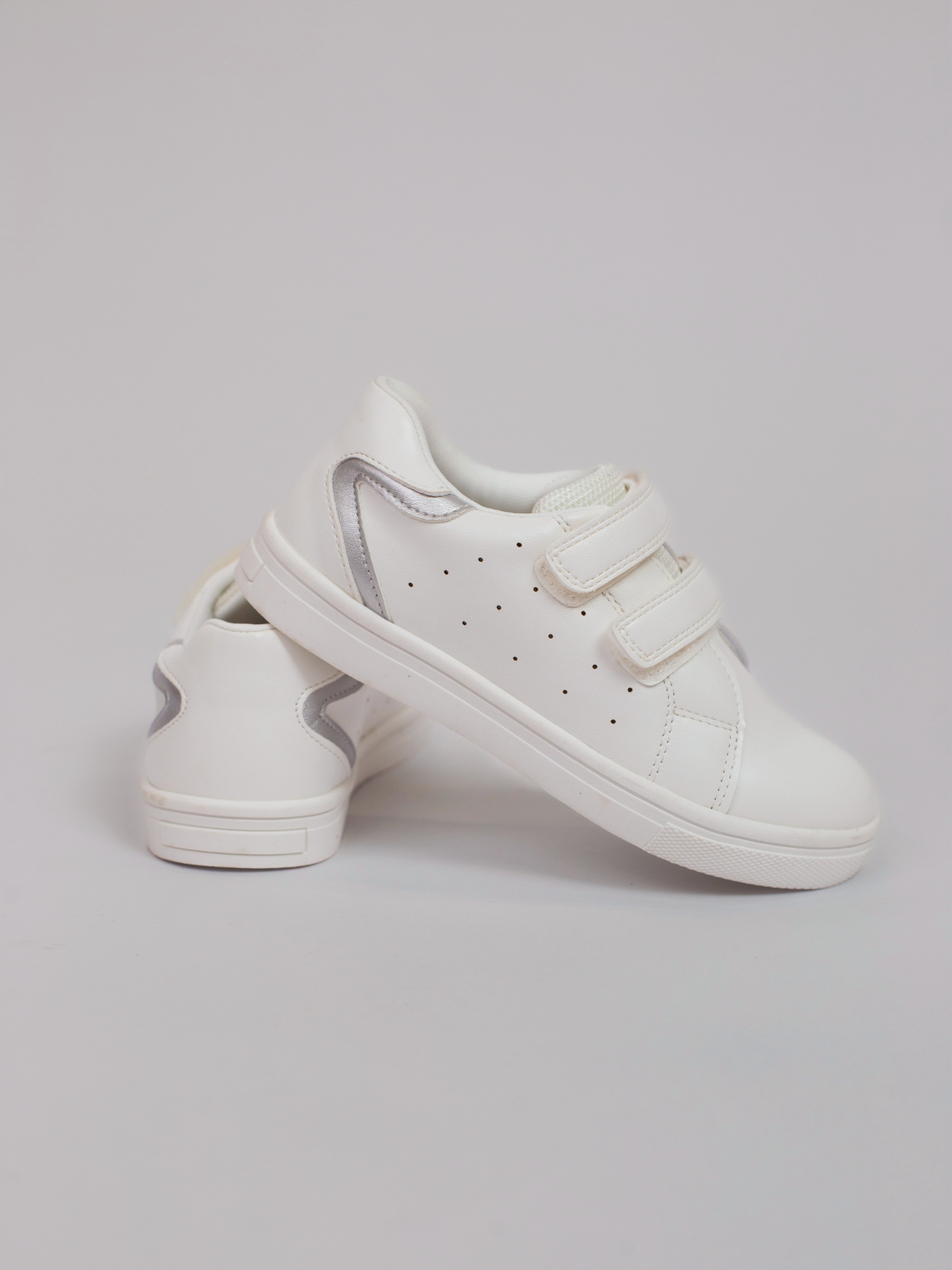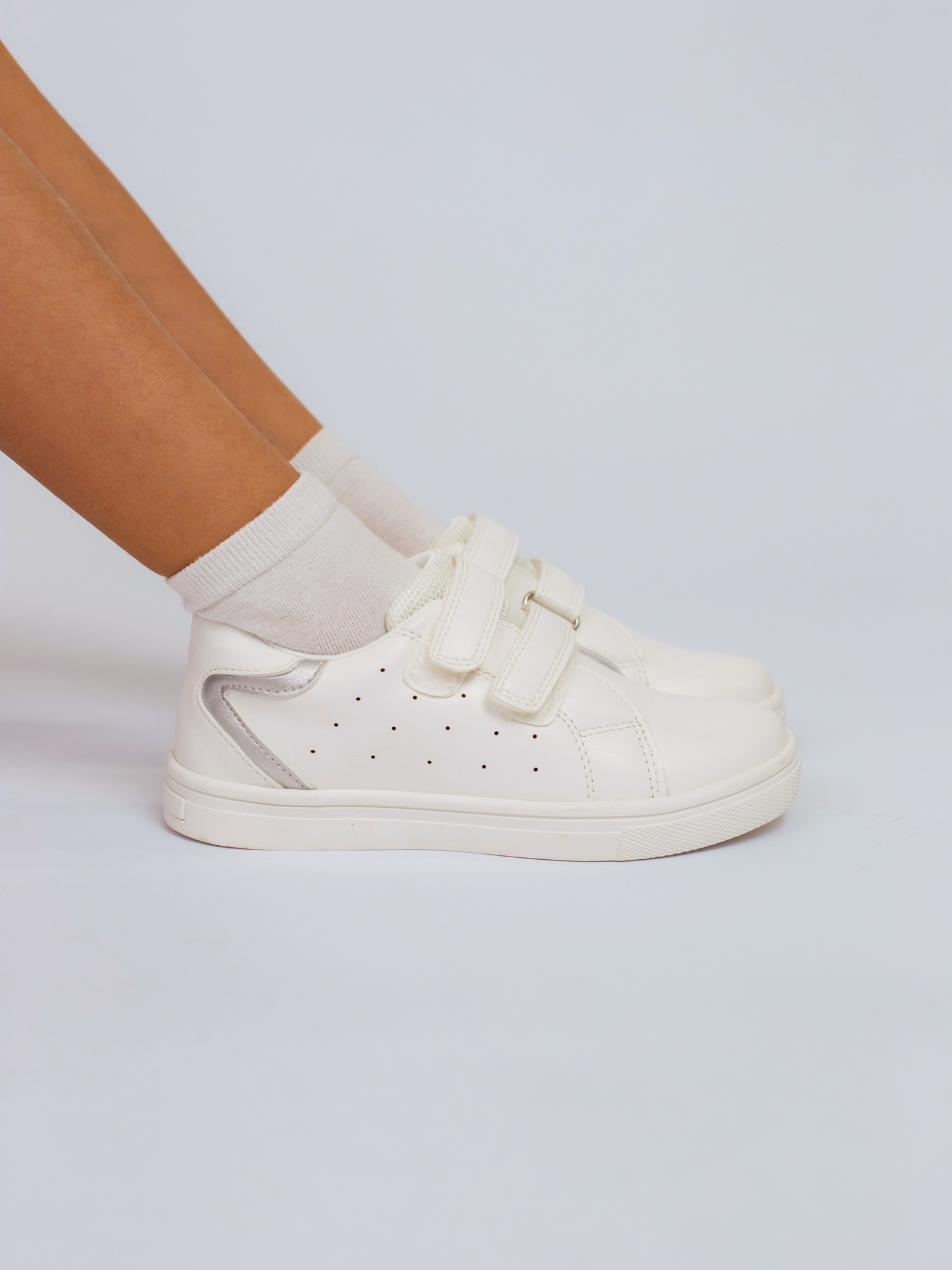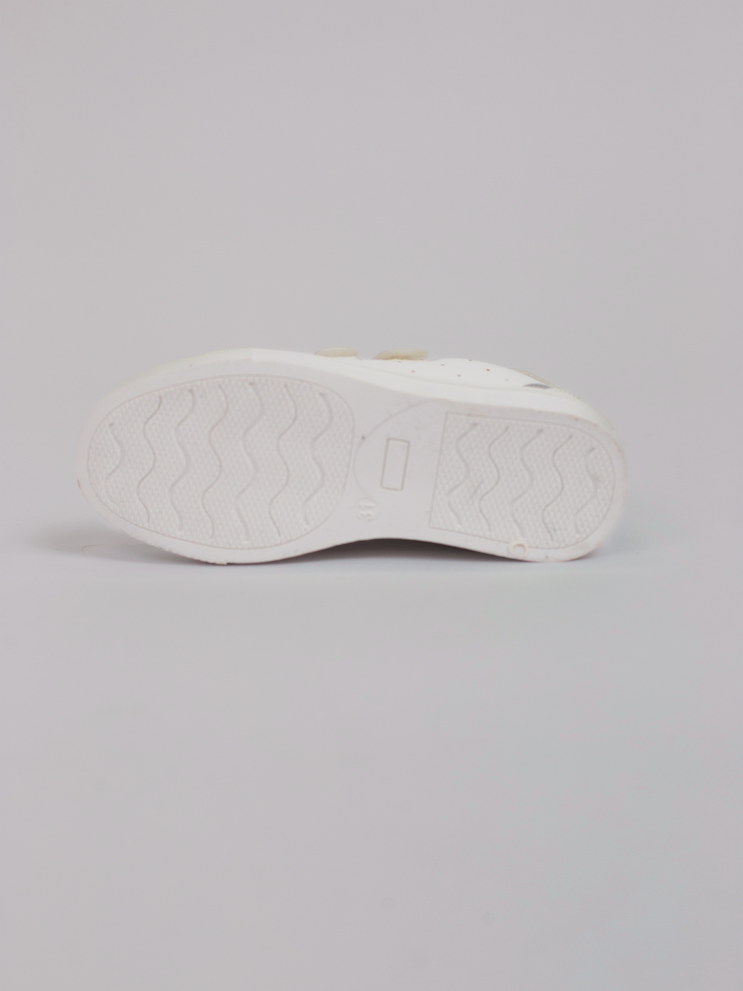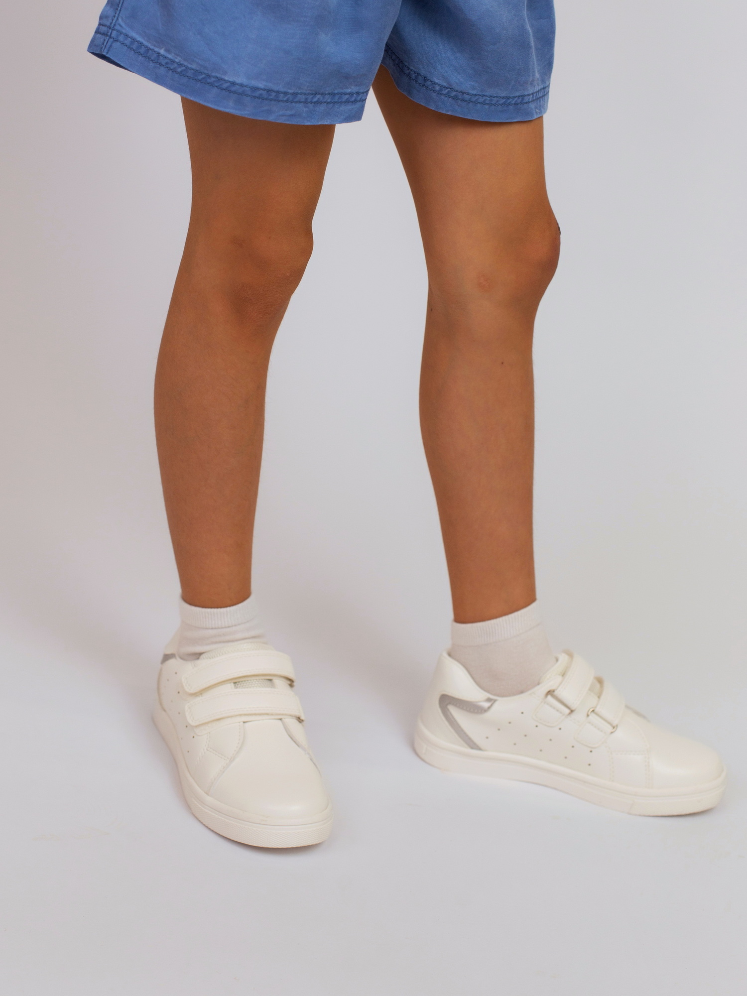 Белые кеды для детей. Универсальные белые кеды — идеальный вариант для активных прогулок и повседневного образа. Выполнены из прочных и дышащих материалов, они обеспечивают комфорт на весь день. Удобная липучка гарантирует хорошую фиксацию, а гибкая подошва поддерживает естественное движение стопы.
