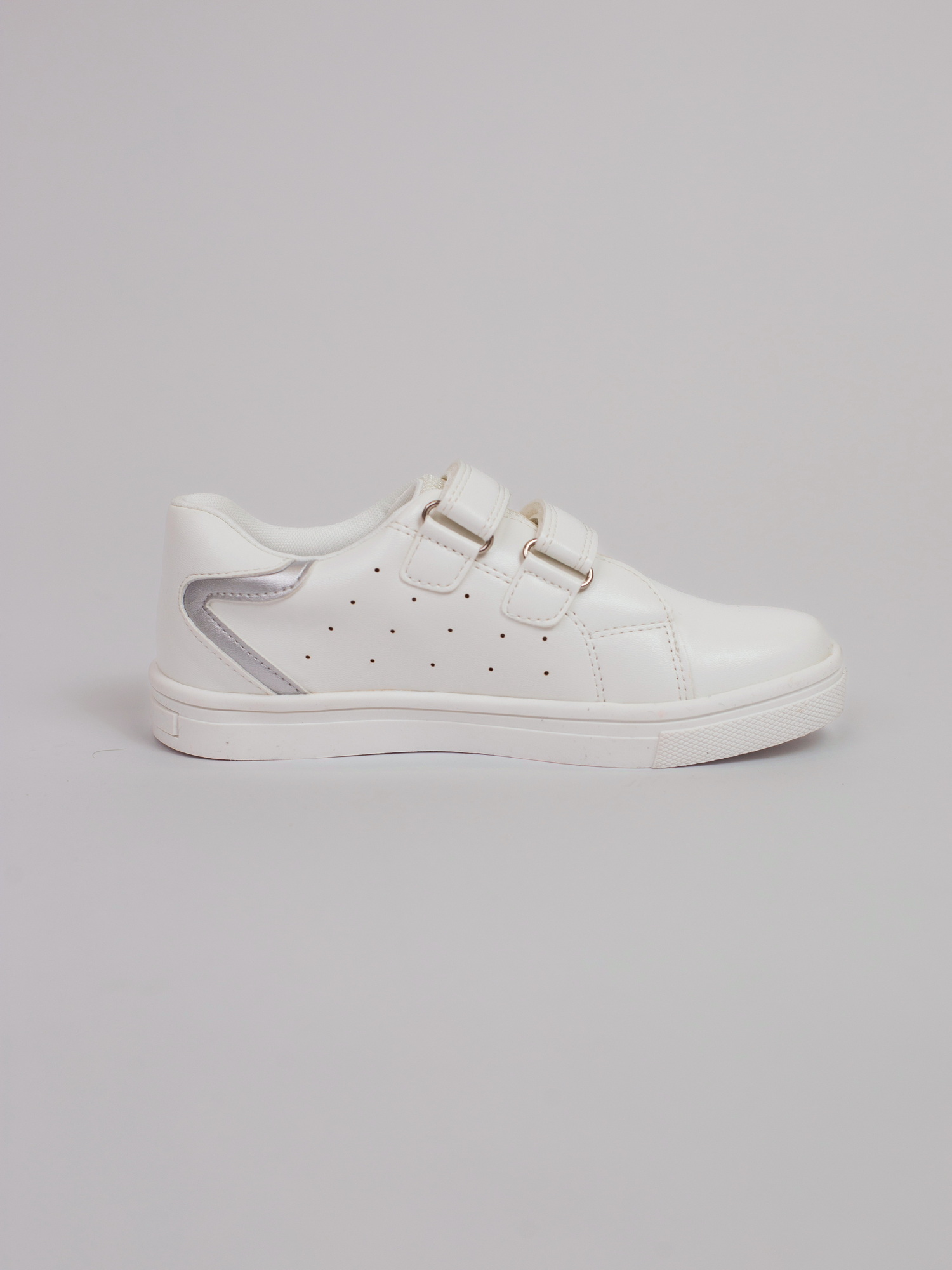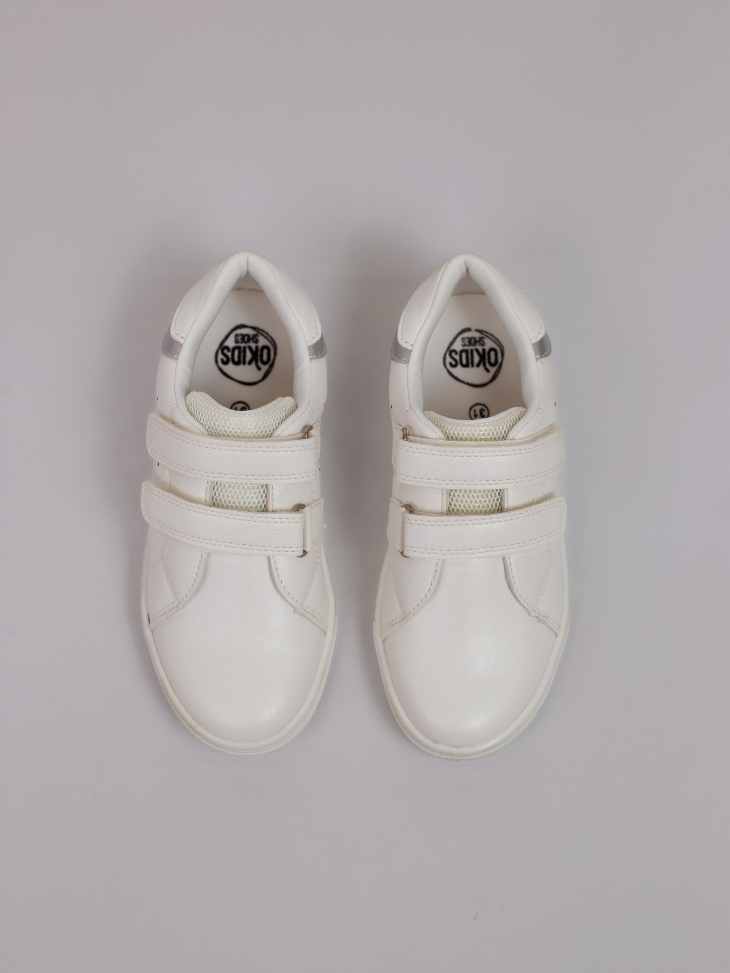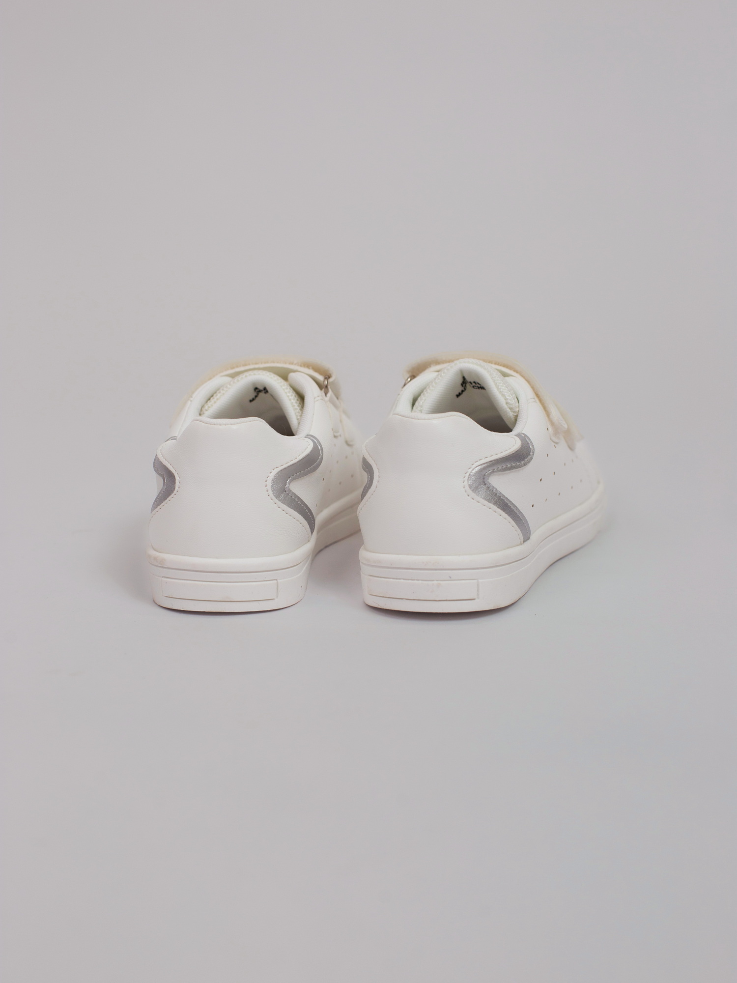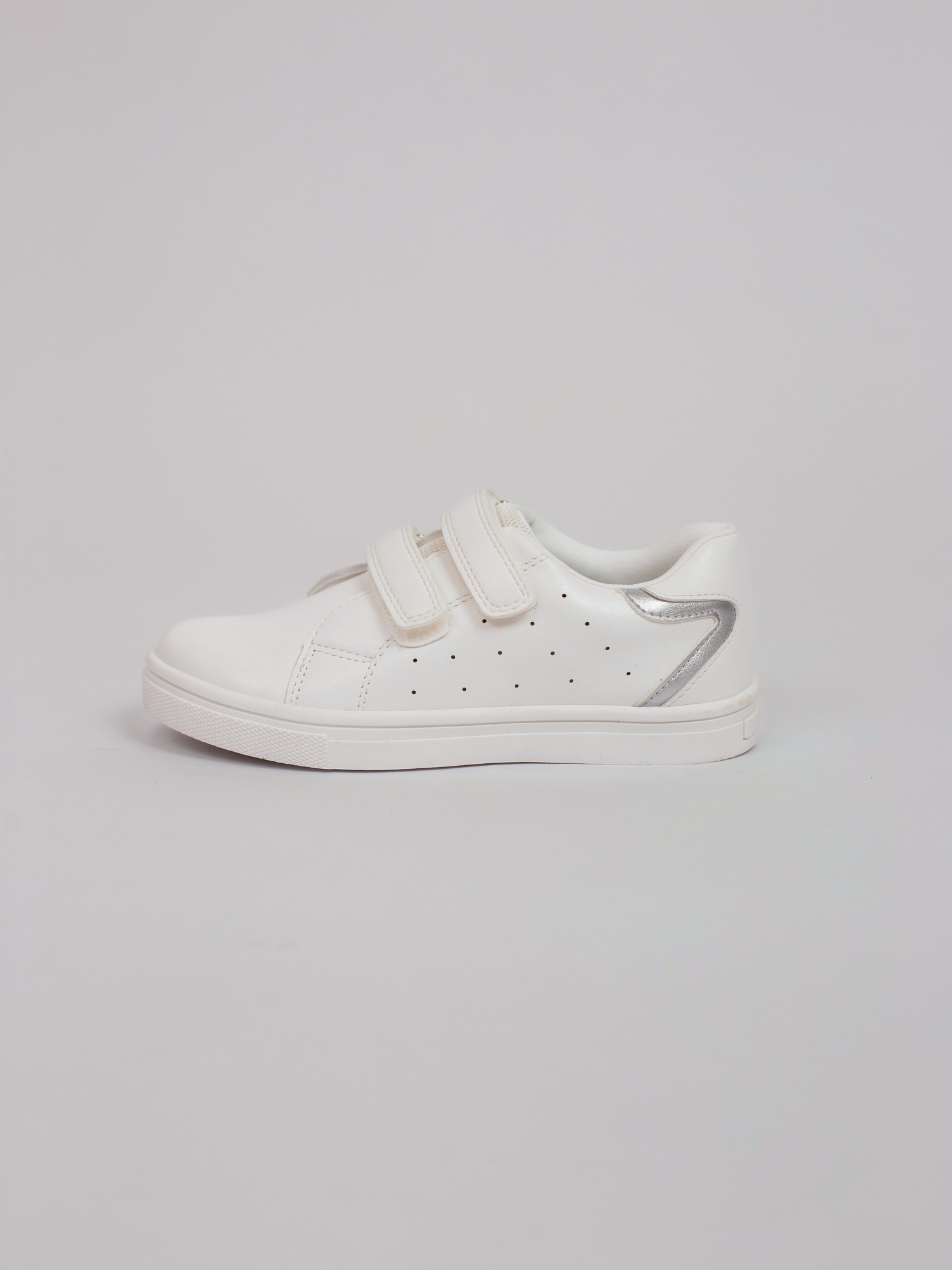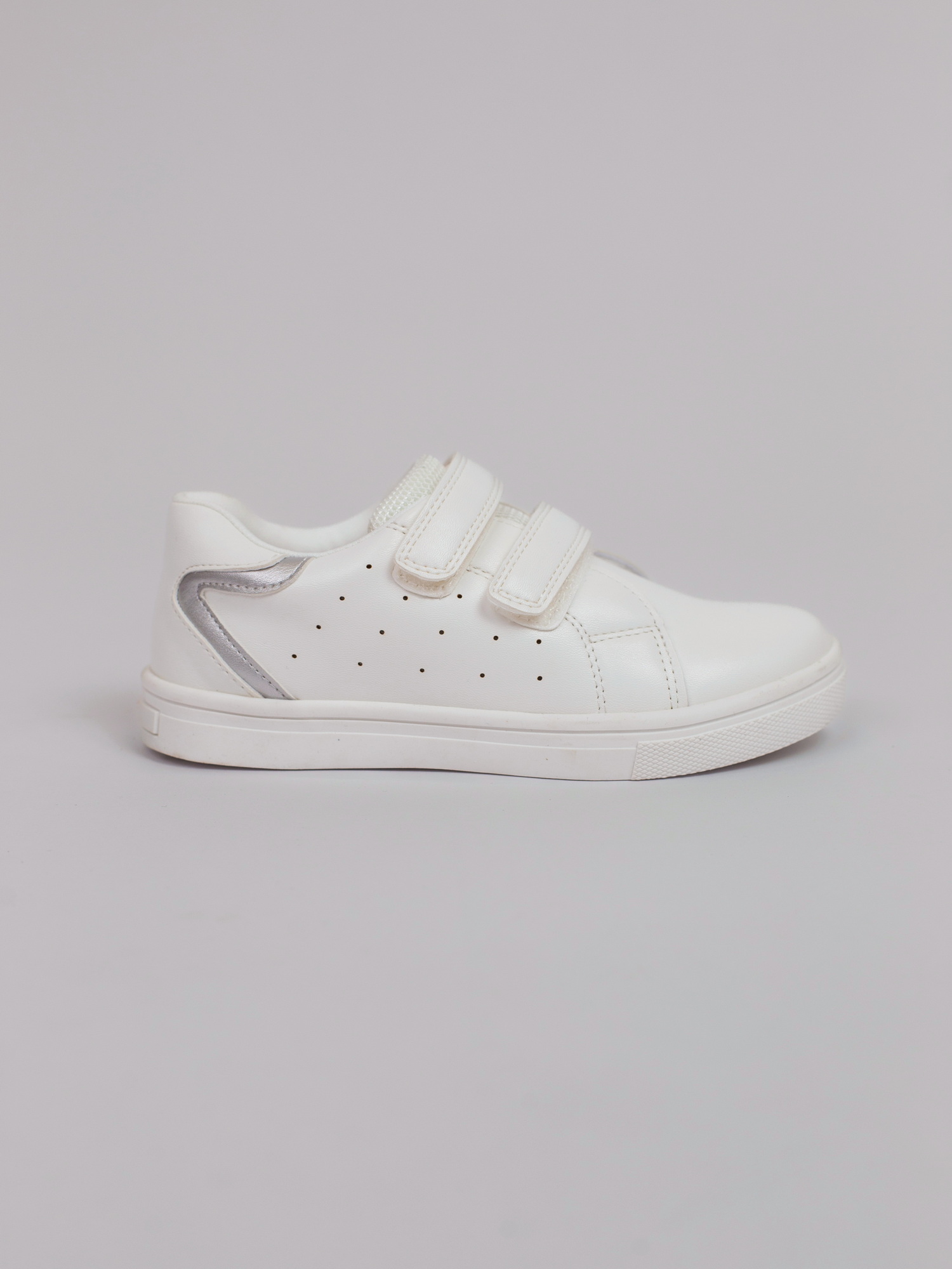 Белые кеды для детей. Универсальные белые кеды — идеальный вариант для активных прогулок и повседневного образа. Выполнены из прочных и дышащих материалов, они обеспечивают комфорт на весь день. Удобная липучка гарантирует хорошую фиксацию, а гибкая подошва поддерживает естественное движение стопы.