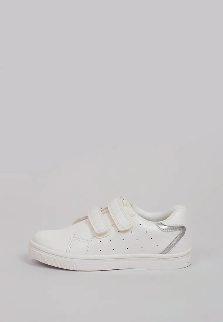 Белые кеды для детей. Универсальные белые кеды — идеальный вариант для активных прогулок и повседневного образа. Выполнены из прочных и дышащих материалов, они обеспечивают комфорт на весь день. Удобная липучка гарантирует хорошую фиксацию, а гибкая подошва поддерживает естественное движение стопы.