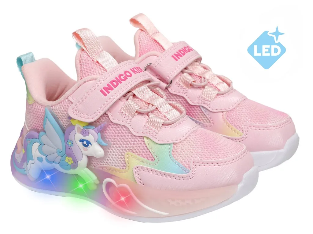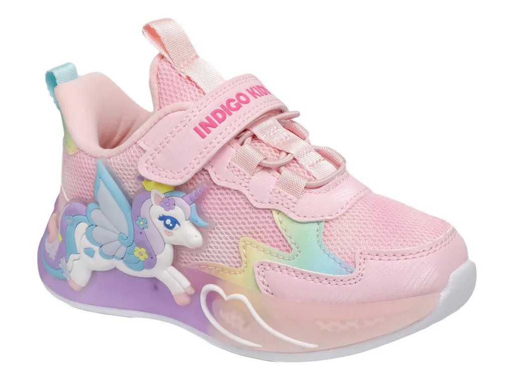 Детские летние кроссовки INDIGO KIDS с единорогом — лёгкая и стильная обувь для активных девочек для прогулок и игр в тёплое время года. Яркие светодиоды в декоре с единорогом загораются при каждом шаге, создавая эффектный образ.
