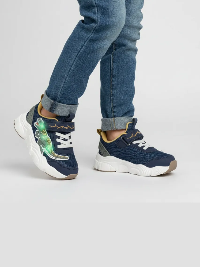 Детские летние кроссовки INDIGO KIDS с динозавром — лёгкая и удобная обувь для активных мальчиков для прогулок, игр и спорта в тёплое время года. Светодиоды в декоре с динозавром загораются при каждом шаге, делая каждую прогулку яркой и увлекательной.