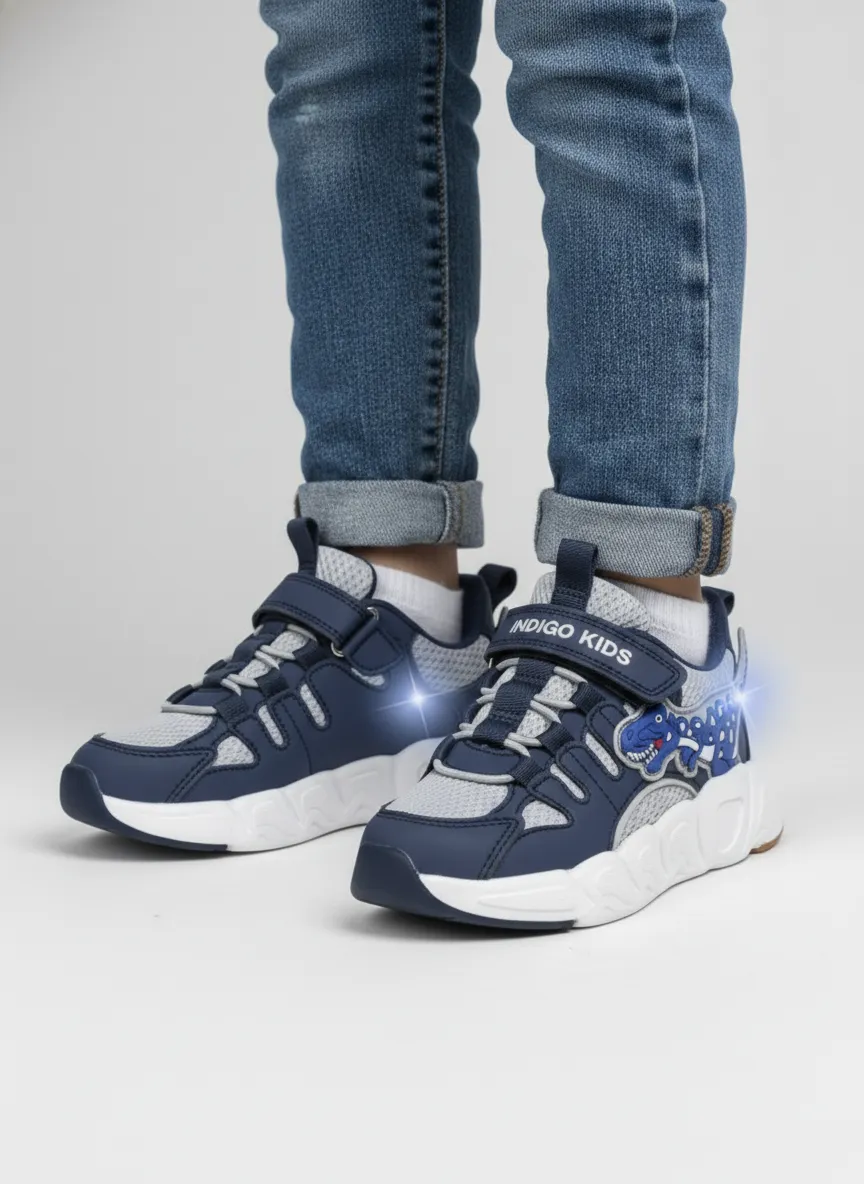 Детские летние кроссовки INDIGO KIDS с динозавром — лёгкая и удобная обувь для активных мальчиков для прогулок, игр и спорта в тёплое время года. Светодиоды в декоре с динозавром загораются при каждом шаге, делая каждую прогулку яркой и увлекательной. Верх выполнен из текстиля и экокожи, что обеспечивает хорошую воздухопроницаемость и износостойкость.