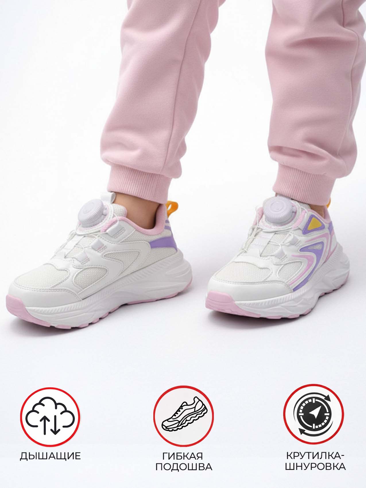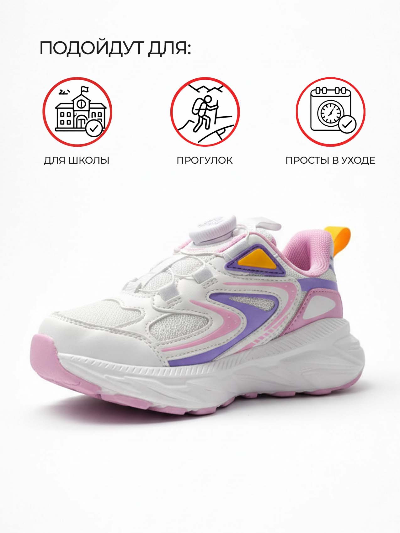Мягкая текстильная подкладка обеспечивает комфорт в течение всего дня, а лёгкая подошва из филона с элементами ТПР отлично амортизирует шаги, оставаясь устойчивой и нескользящей. Удобная система быстрой фиксации позволяет легко надевать и снимать кроссовки, обеспечивая надёжную посадку на ноге ребёнка.