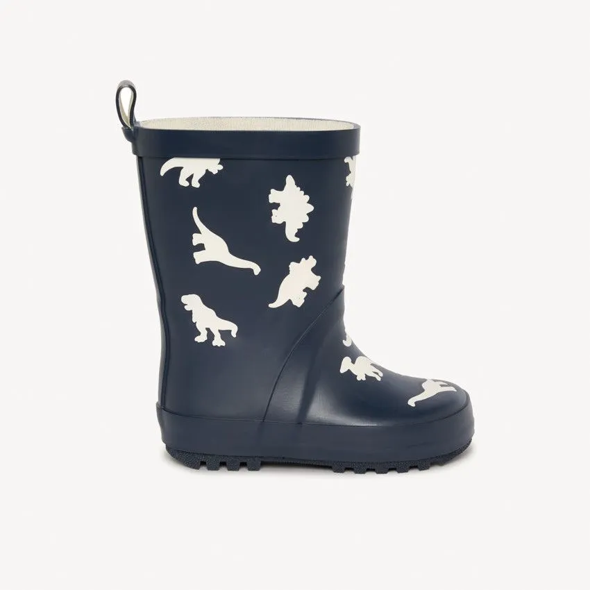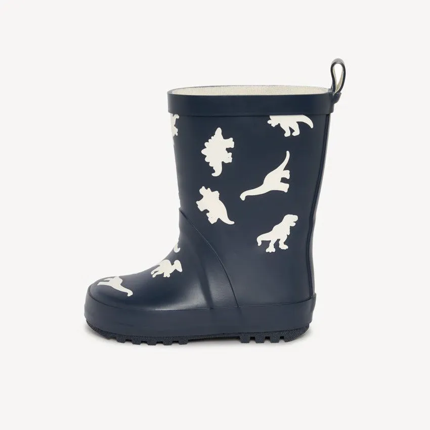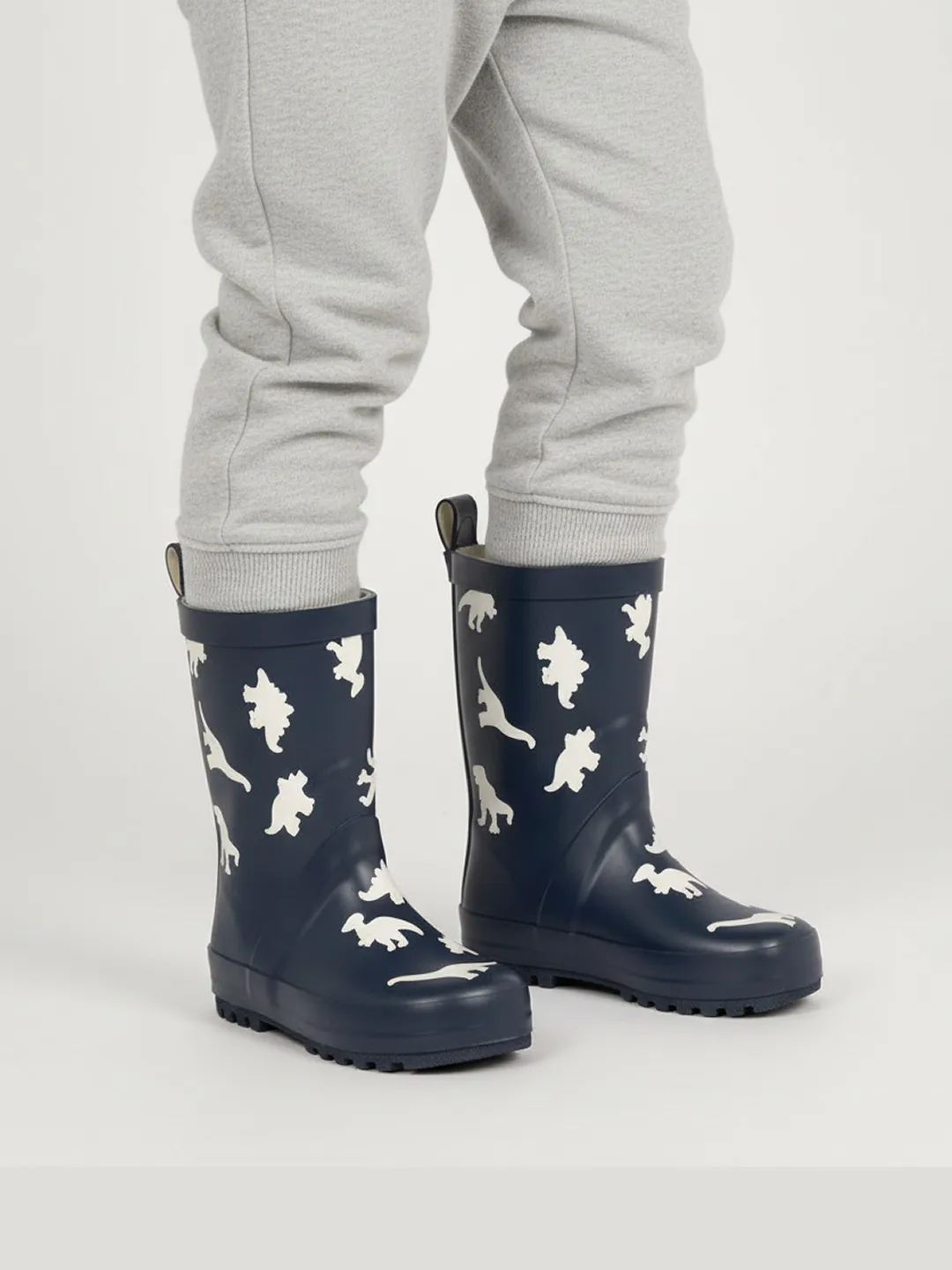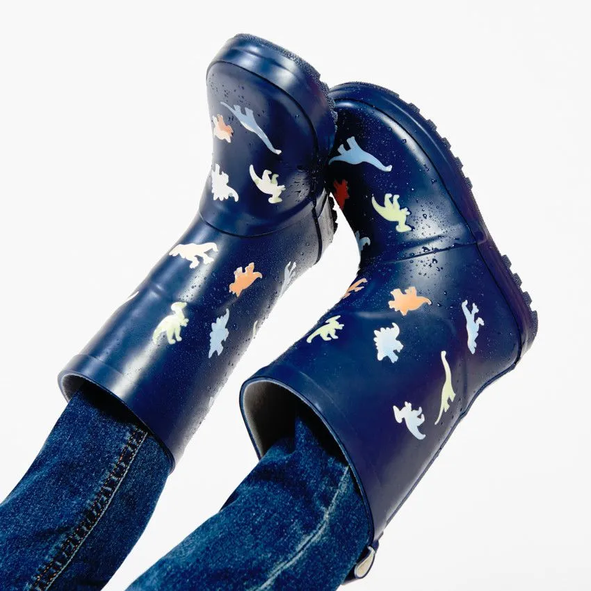 Яркие и удобные резиновые сапожки станут любимой обувью для дождливой погоды. Особенность модели — игривые динозавры, которые меняют цвет при контакте с водой, превращая каждый шаг в маленькое чудо. Мягкая текстильная подкладка с добавлением хлопка обеспечивает комфорт во время носки, а прочная рифленая подошва из резины гарантирует надежное сцепление с поверхностью.