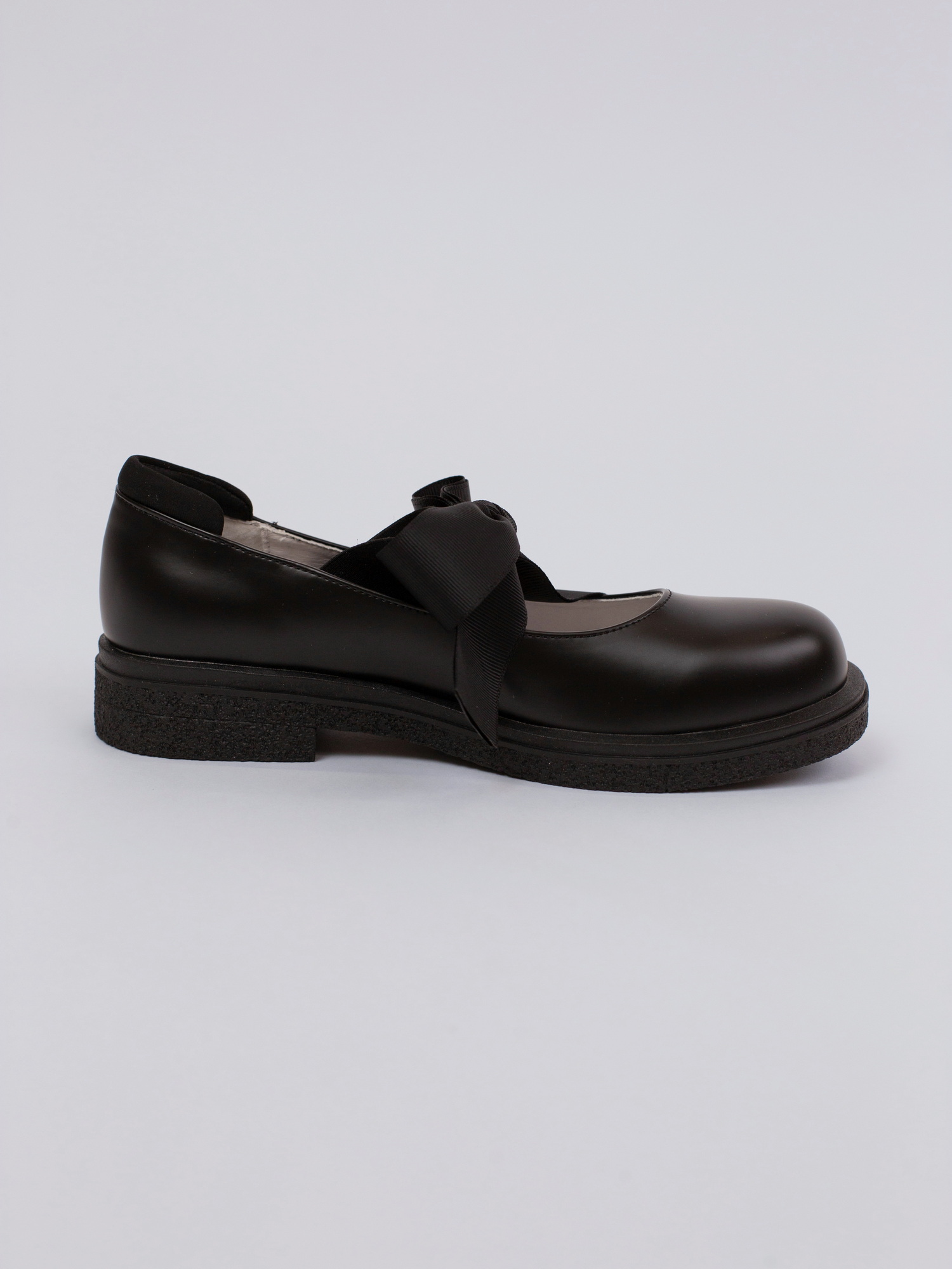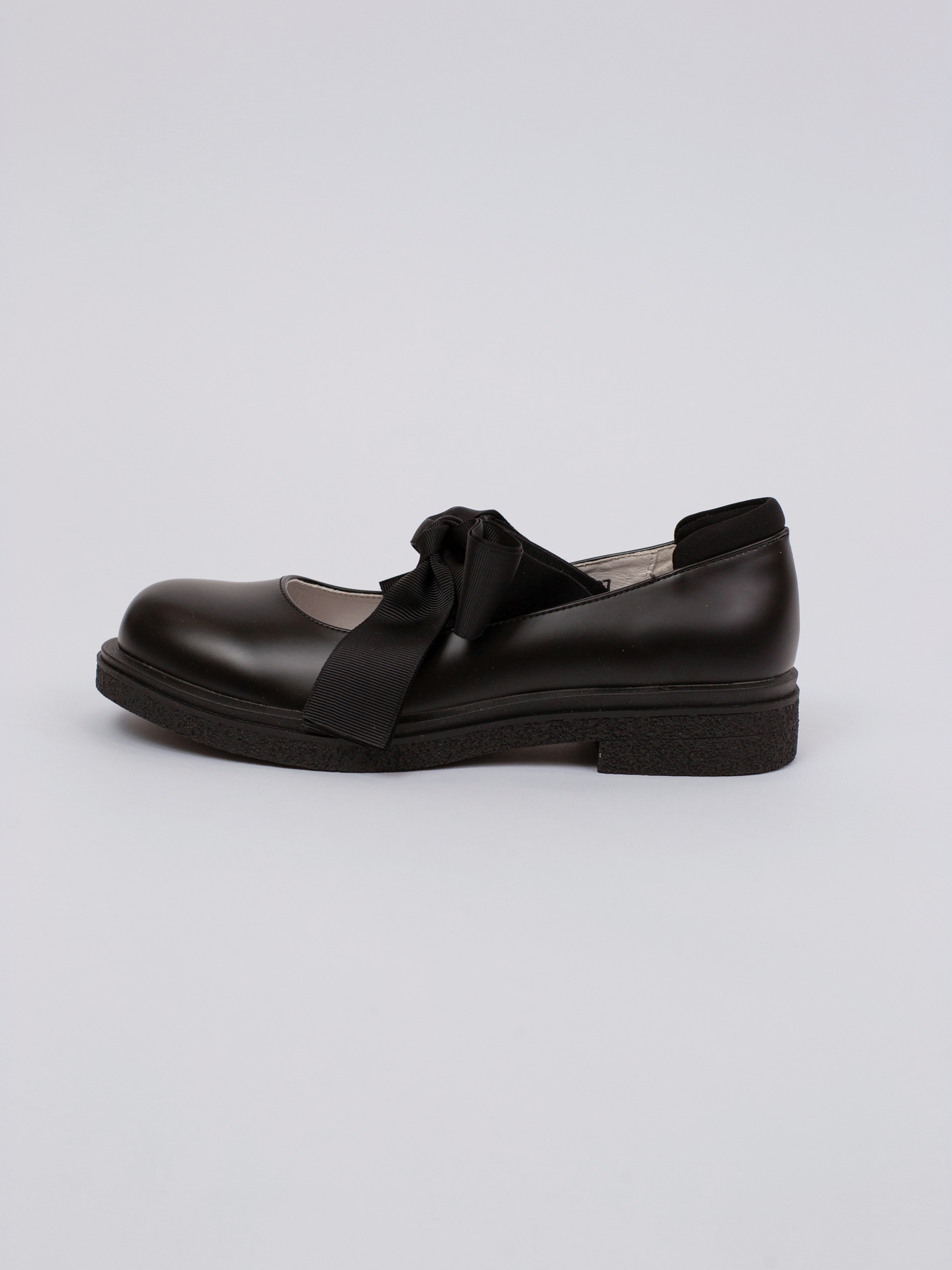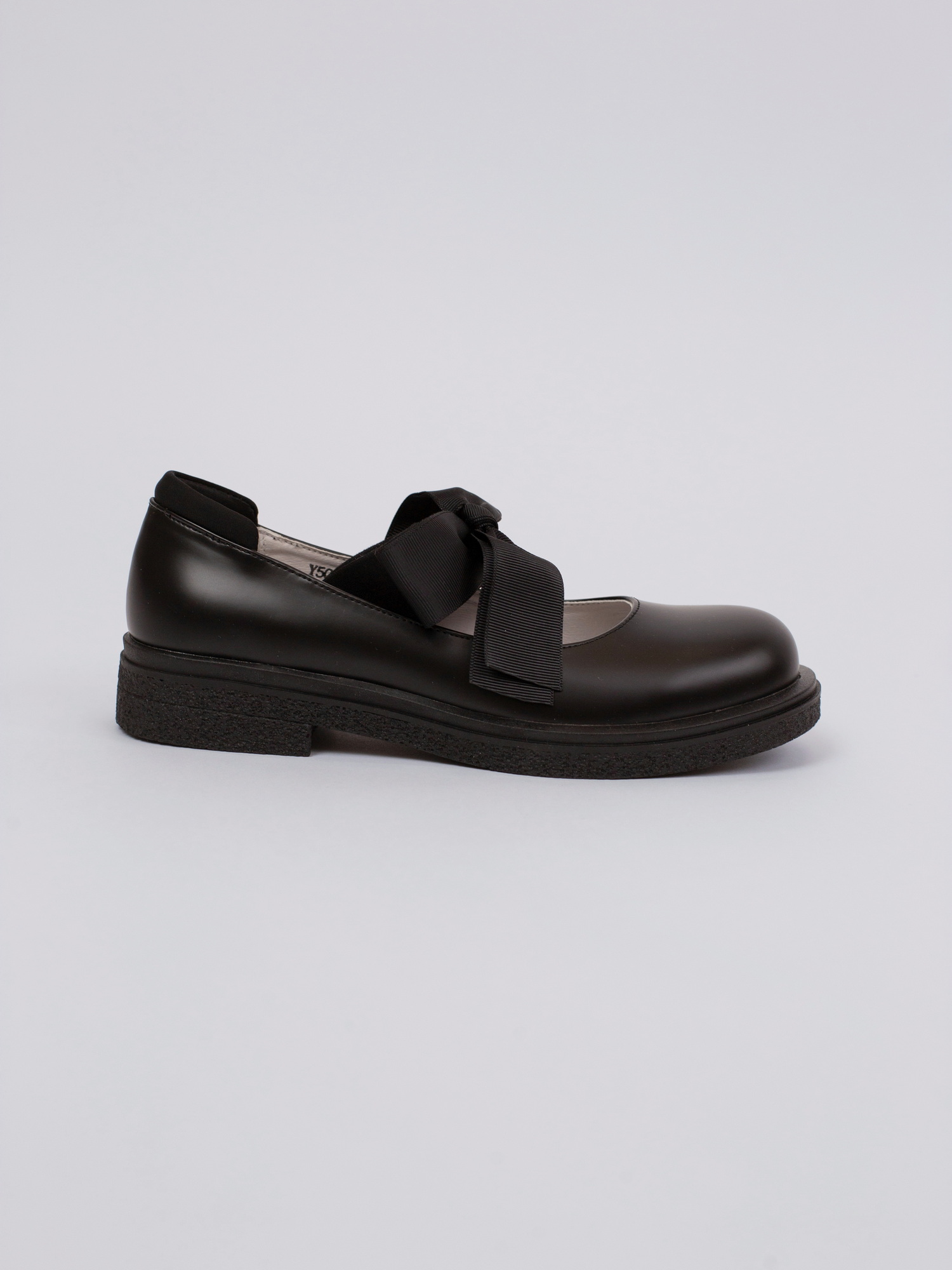 Туфли оснащены эластичной резинкой, расположенной по центру, которая облегчает надевание и обеспечивает хорошую фиксацию на ноге. Эластичная вставка дополнена аккуратным бантом, придающим обуви нежный и нарядный вид, оставаясь в рамках школьного стиля.