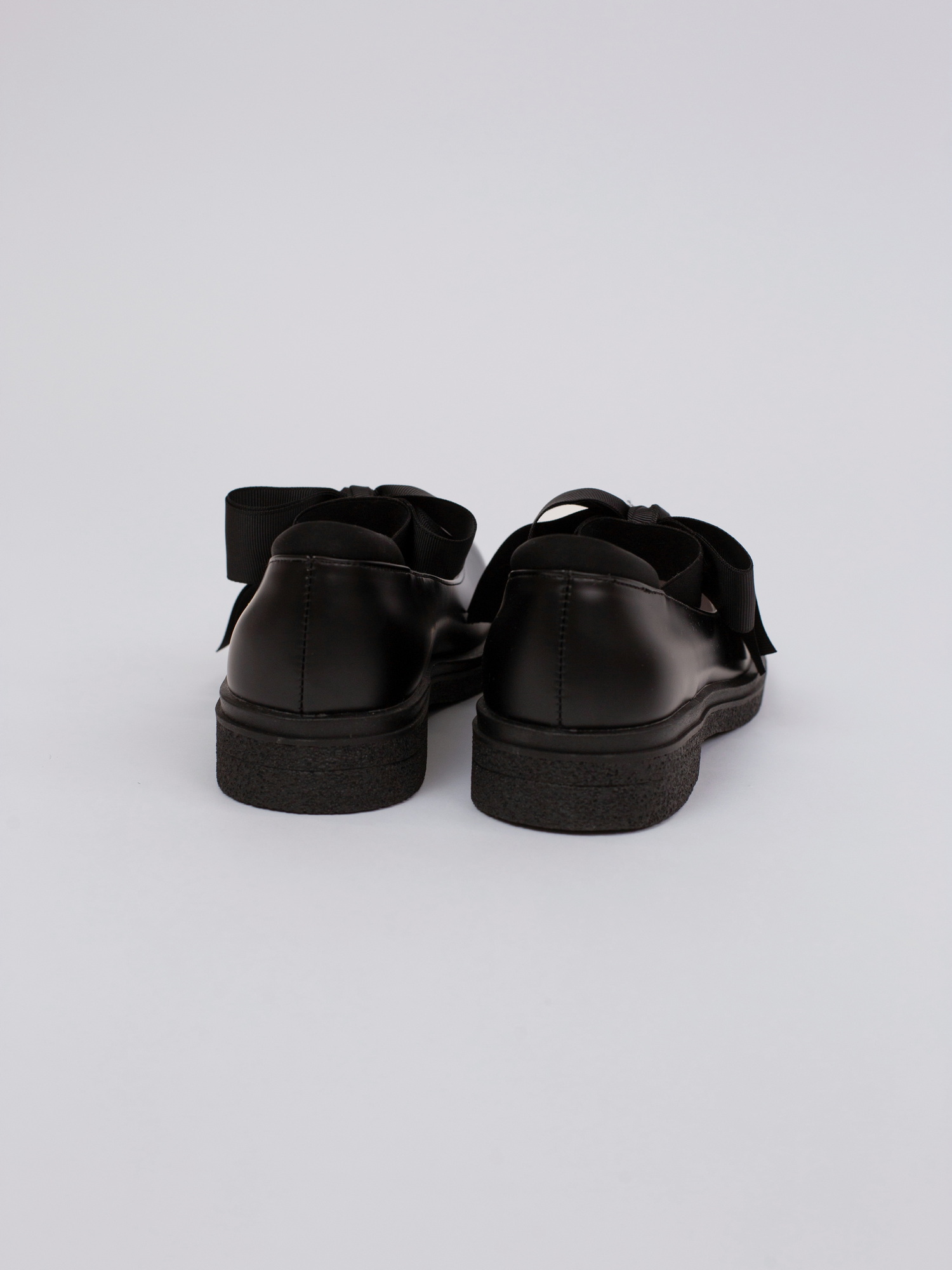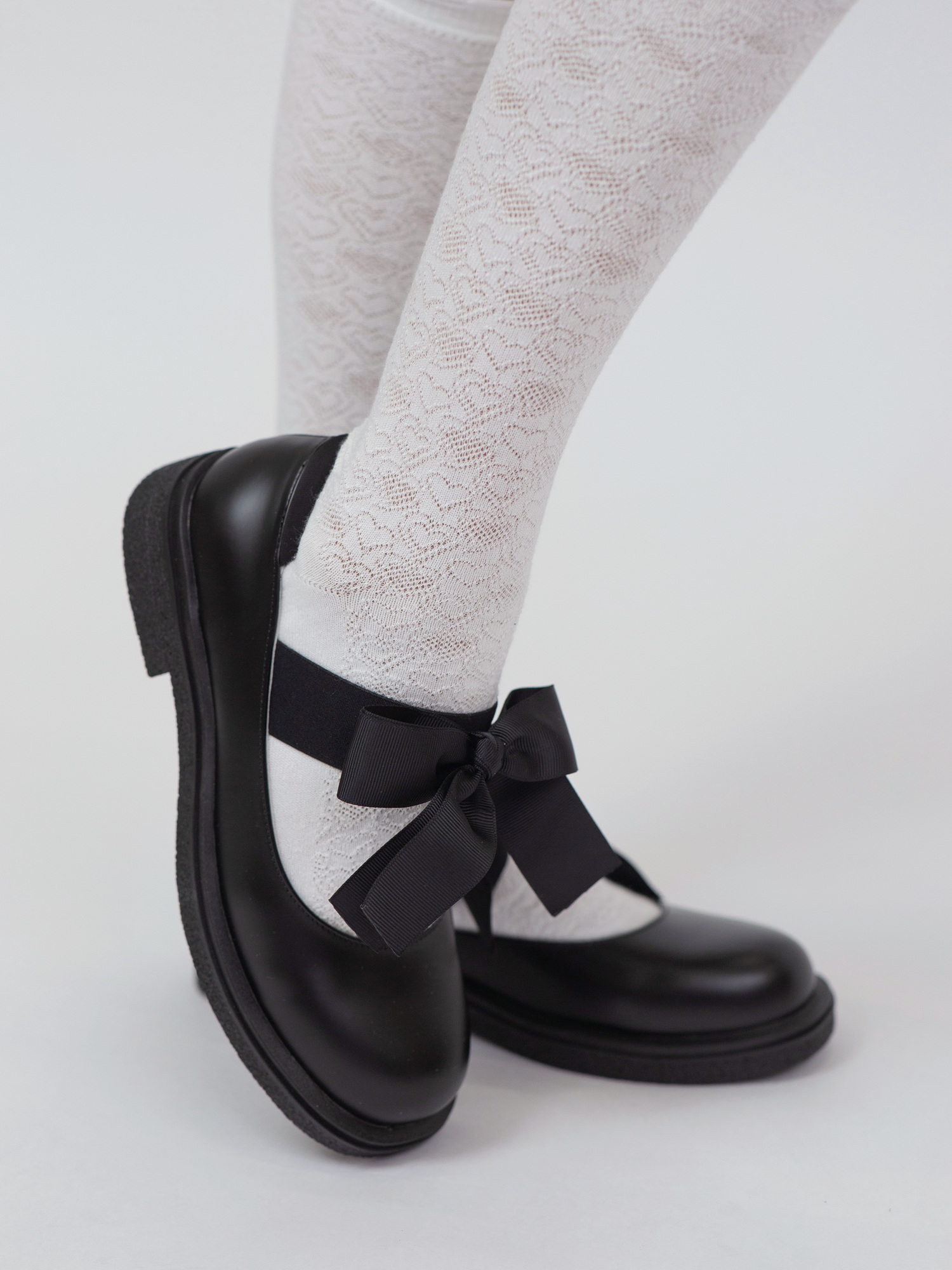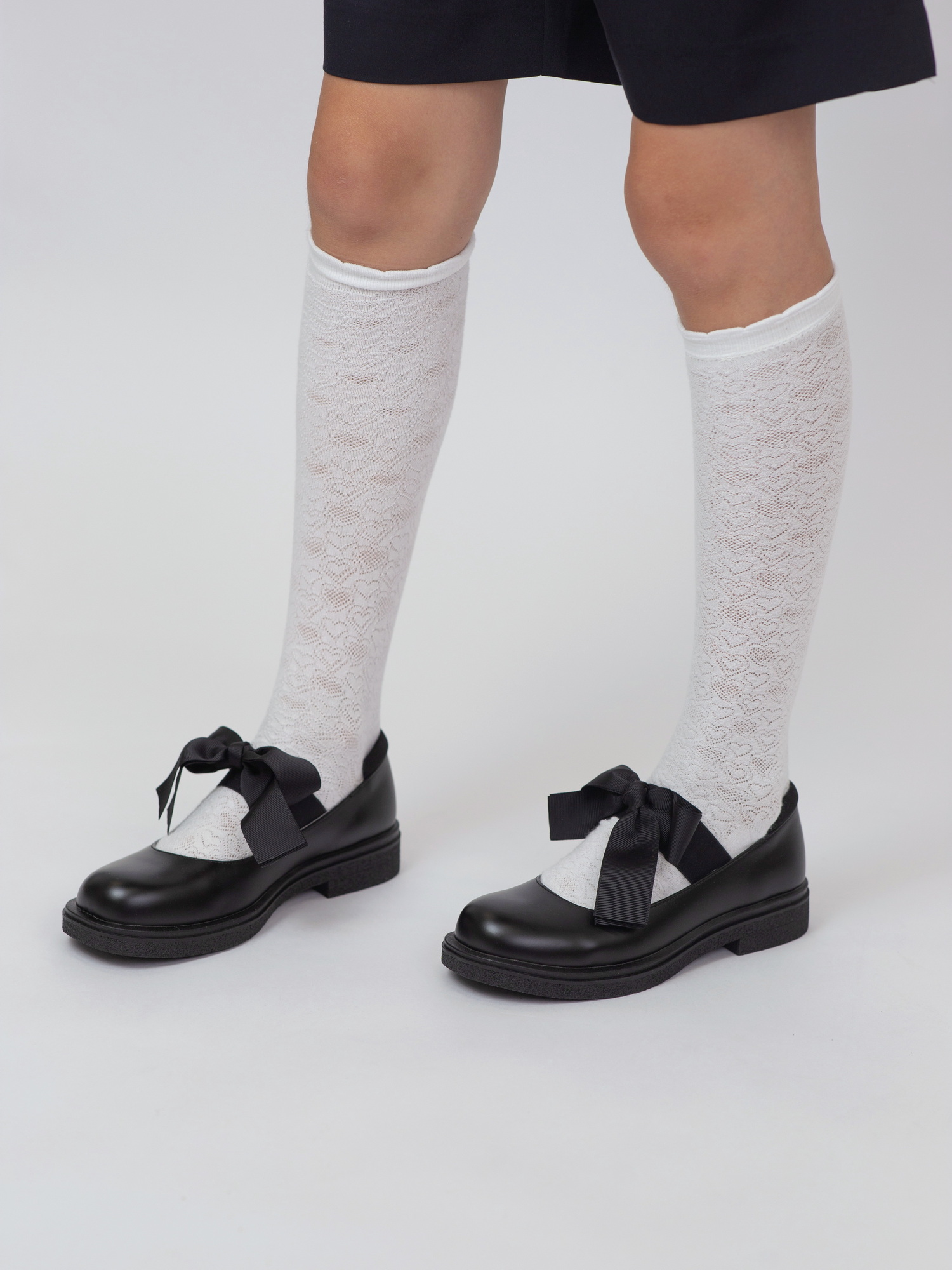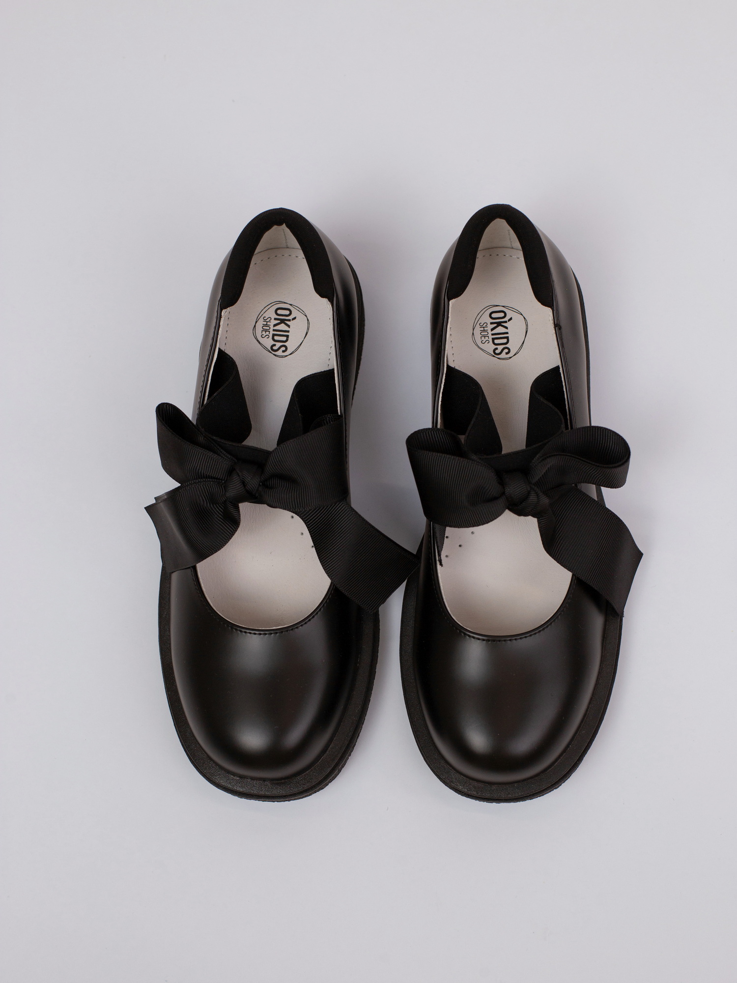 Туфли оснащены эластичной резинкой, расположенной по центру, которая облегчает надевание и обеспечивает хорошую фиксацию на ноге. Эластичная вставка дополнена аккуратным бантом, придающим обуви нежный и нарядный вид, оставаясь в рамках школьного стиля.