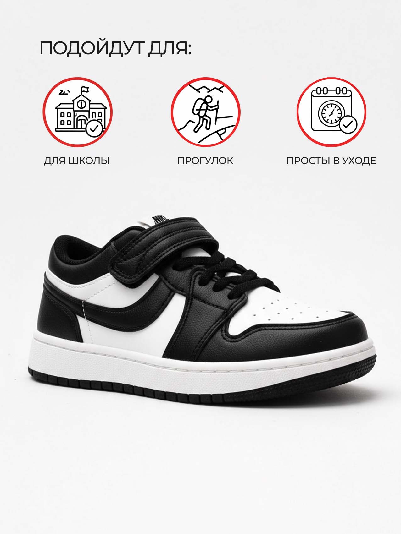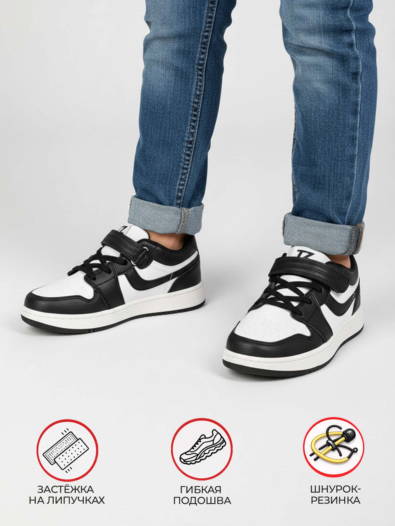Кроссовки для мальчика — практичная и стильная модель для активной повседневной носки. Контрастное сочетание чёрного и белого цветов придаёт обуви современный спортивный вид, который отлично подойдёт для школы, прогулок и игр на свежем воздухе.