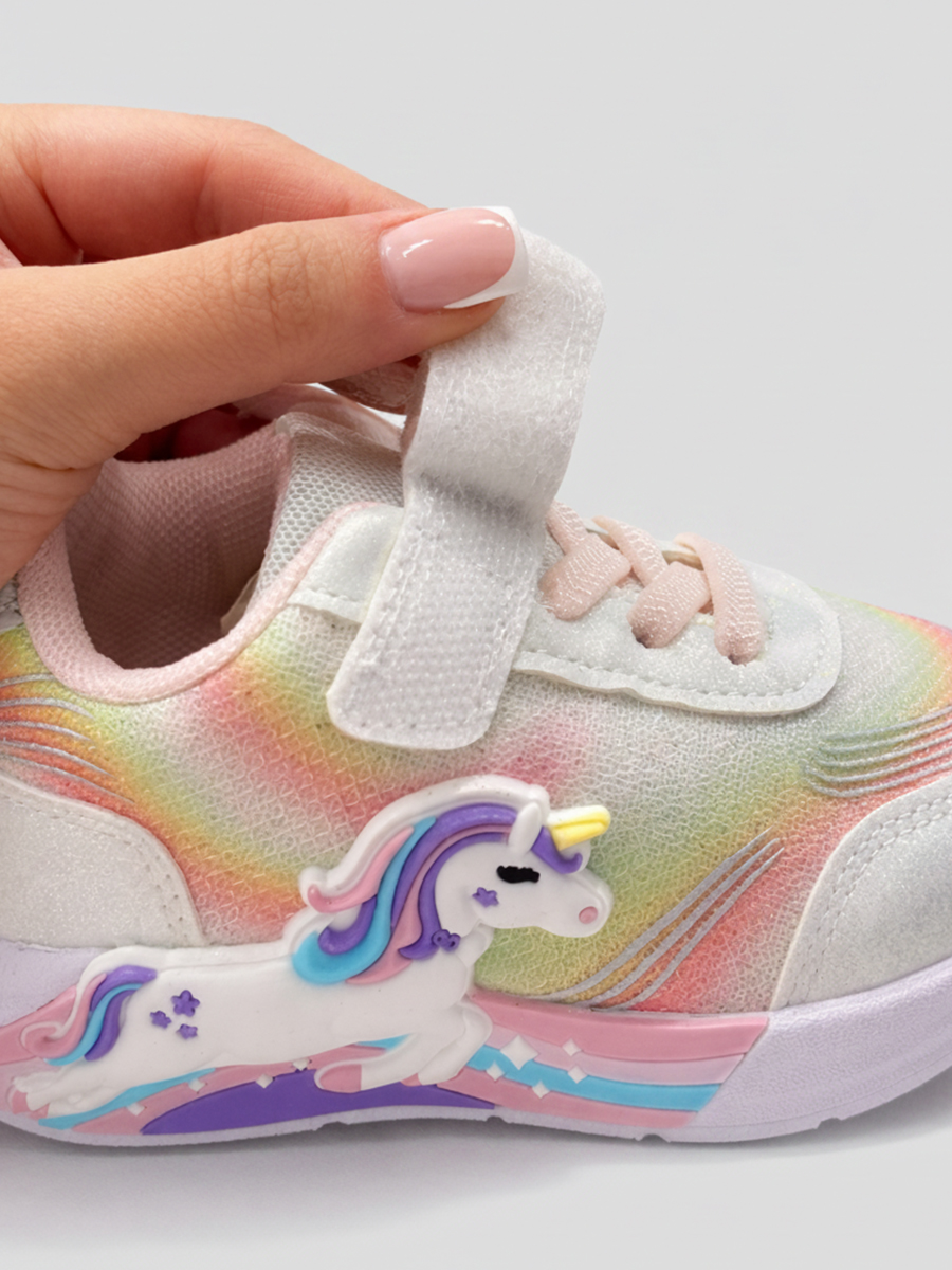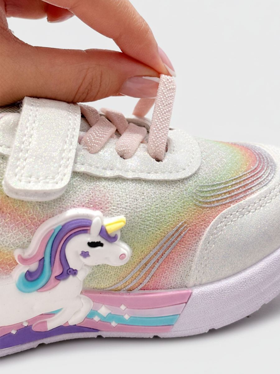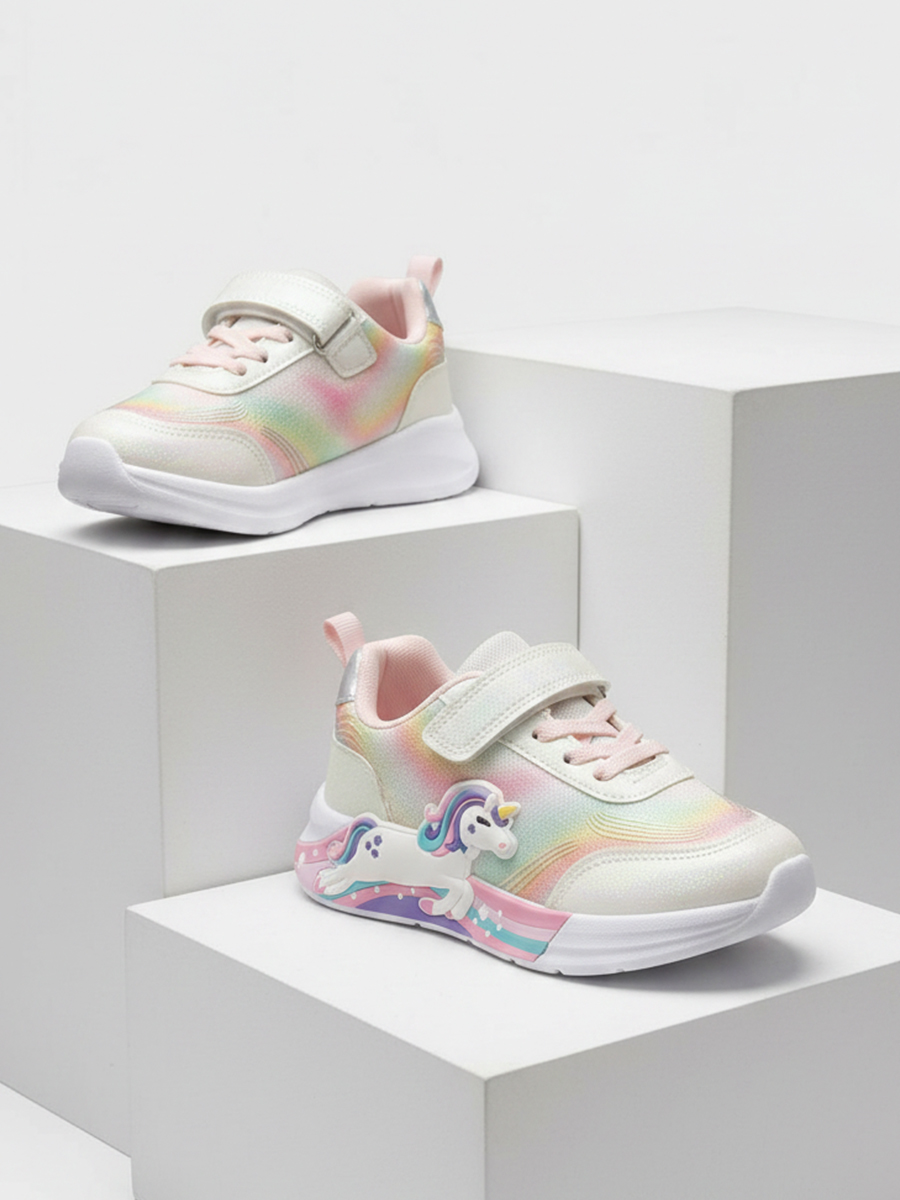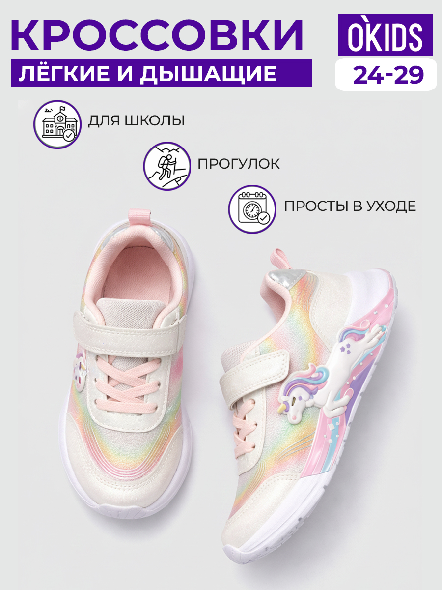 Очаровательные кроссовки для девочек, созданные для комфортных прогулок и активных игр. Нежный дизайн с переливами и декоративным элементом в виде единорога добавляет образу сказочного настроения и обязательно понравится ребёнку.