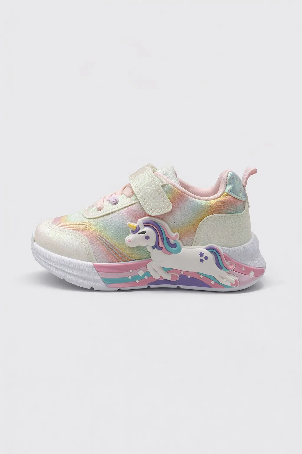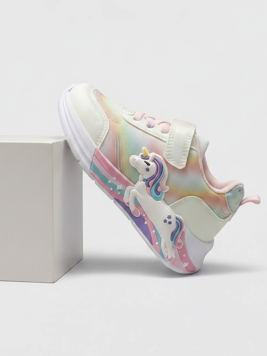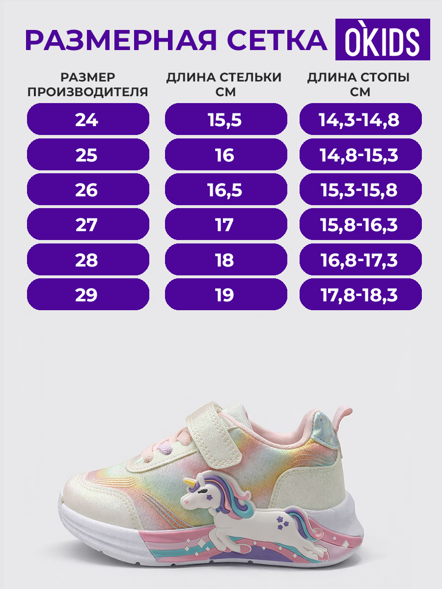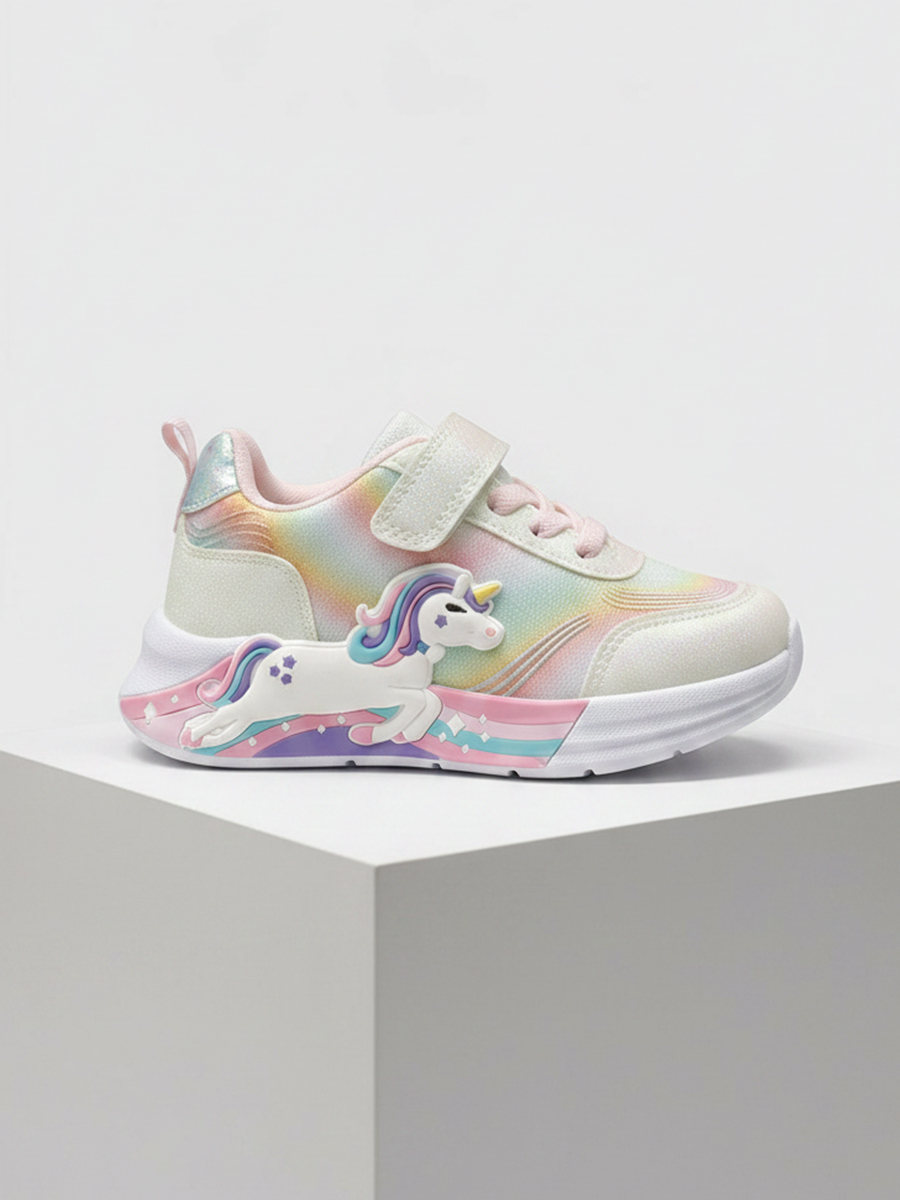 Очаровательные кроссовки для девочек, созданные для комфортных прогулок и активных игр. Нежный дизайн с переливами и декоративным элементом в виде единорога добавляет образу сказочного настроения и обязательно понравится ребёнку.