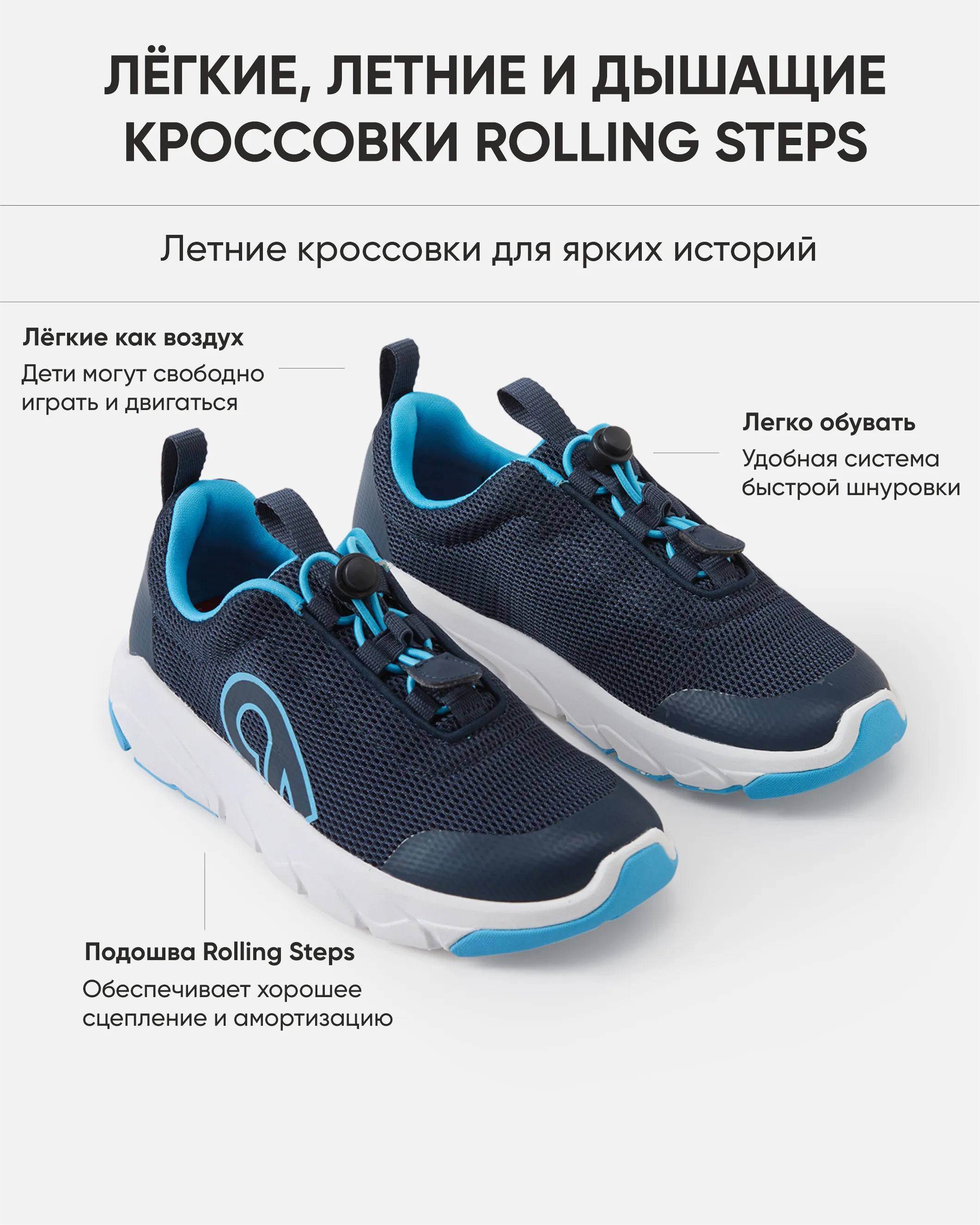 Удобные кроссовки подойдут для активного дня ребёнка, когда важны лёгкость, комфорт и свобода движений. Дышащие и лёгкие материалы помогают сохранять комфорт в течение дня, а эластичная шнуровка облегчает надевание и фиксацию на ноге. Гибкая подошва из ЭВА с резиновыми усилениями обеспечивает хорошее сцепление и амортизацию, а изогнутая конструкция Reima Rolling Steps способствует естественному перекату стопы и плавной походке. Съёмные стельки Happy Fit помогают легко подобрать правильный размер.