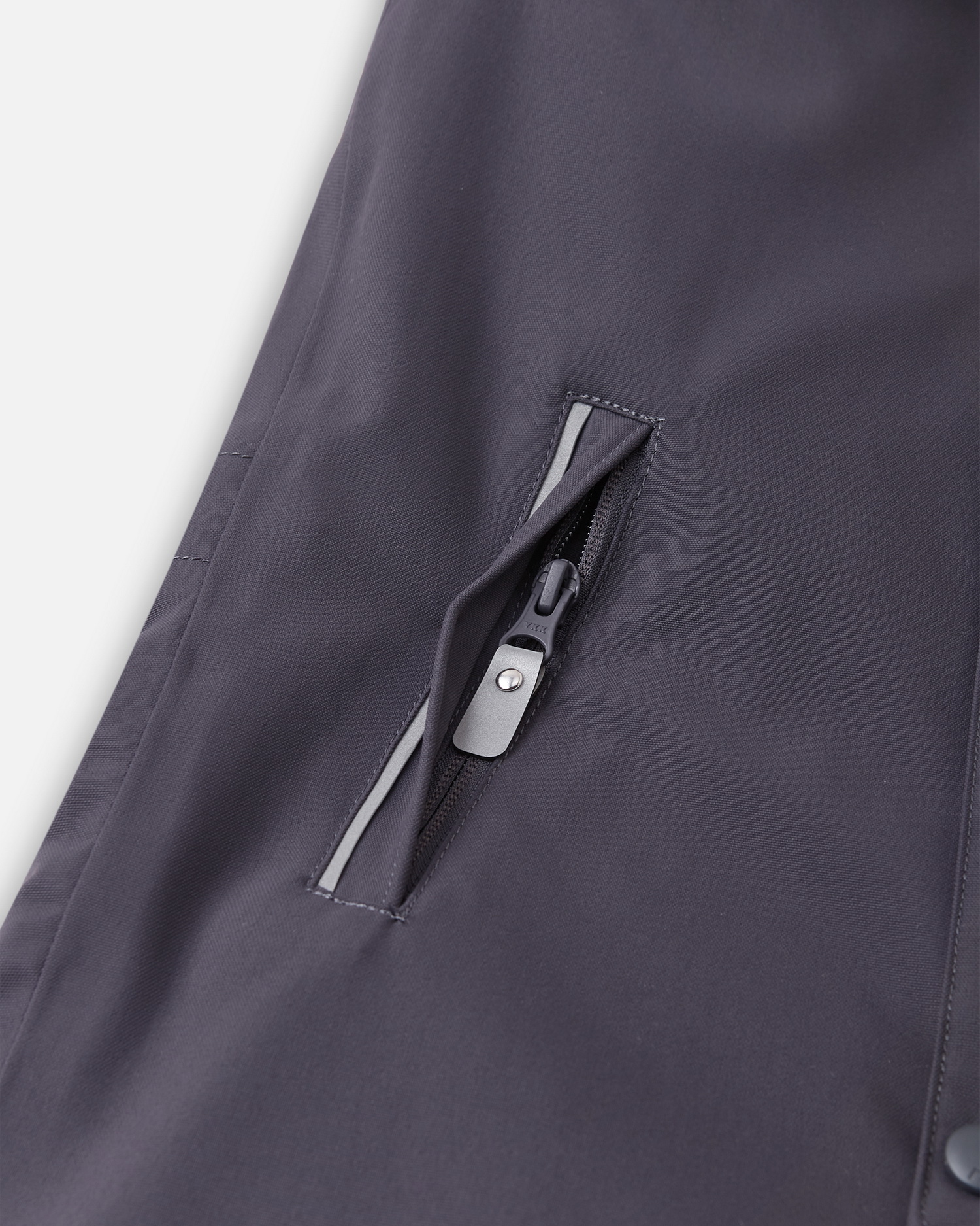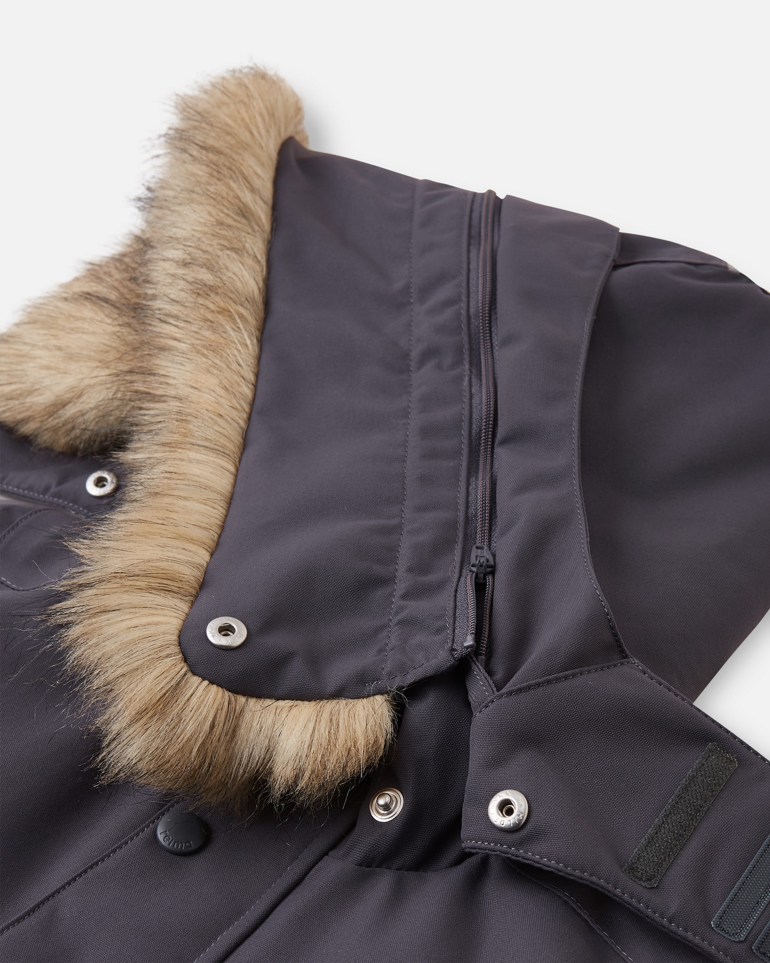 Изготовлен из износостойкой, водо- и ветронепроницаемой ткани с утеплителем, обеспечивающим комфорт без перегрева. Регулируемая талия гарантирует удобную посадку, а съёмный капюшон с искусственным мехом защищает от холода. Штрипки надёжно фиксируют штанины.