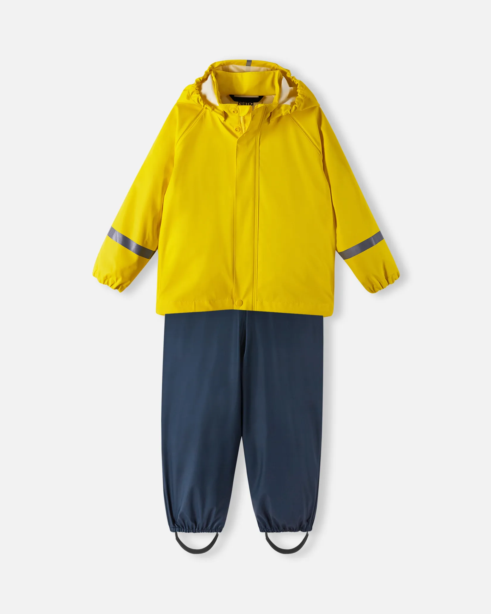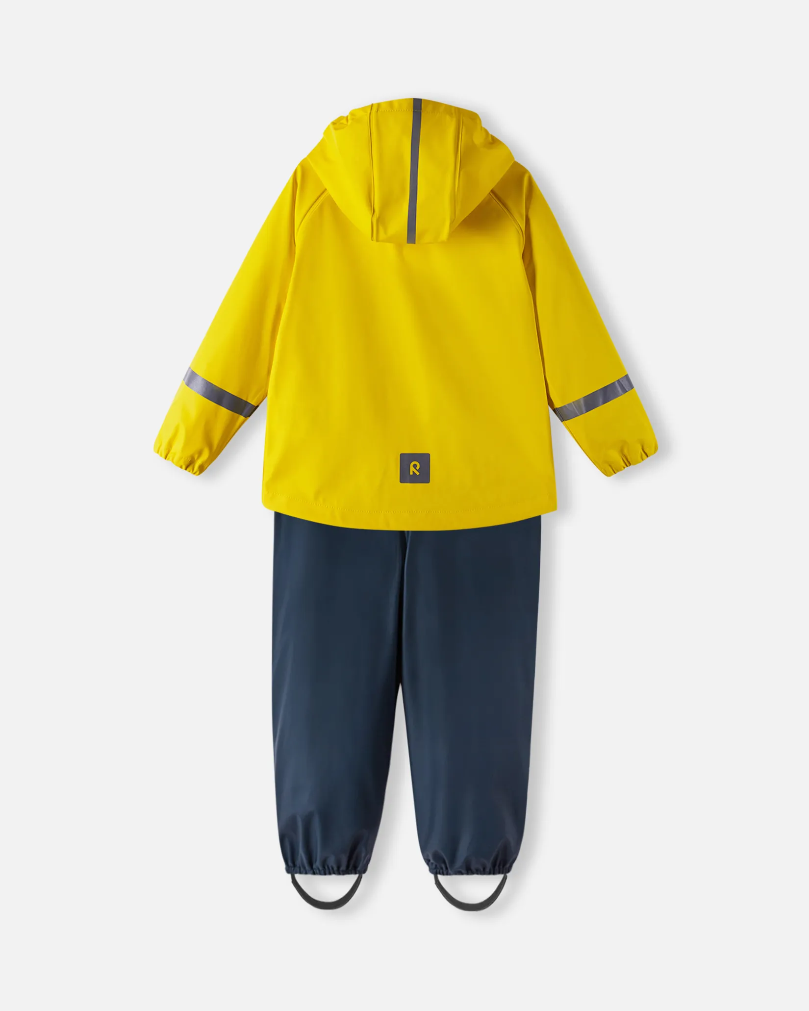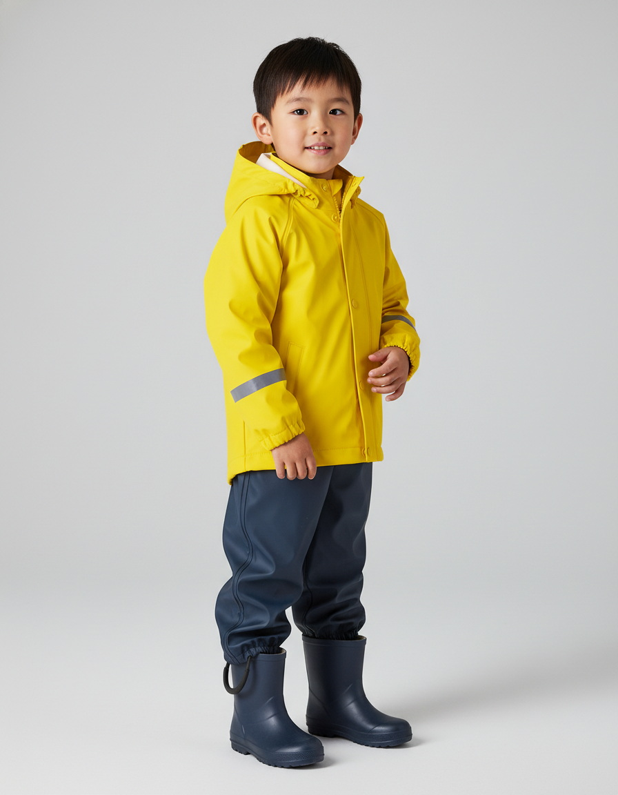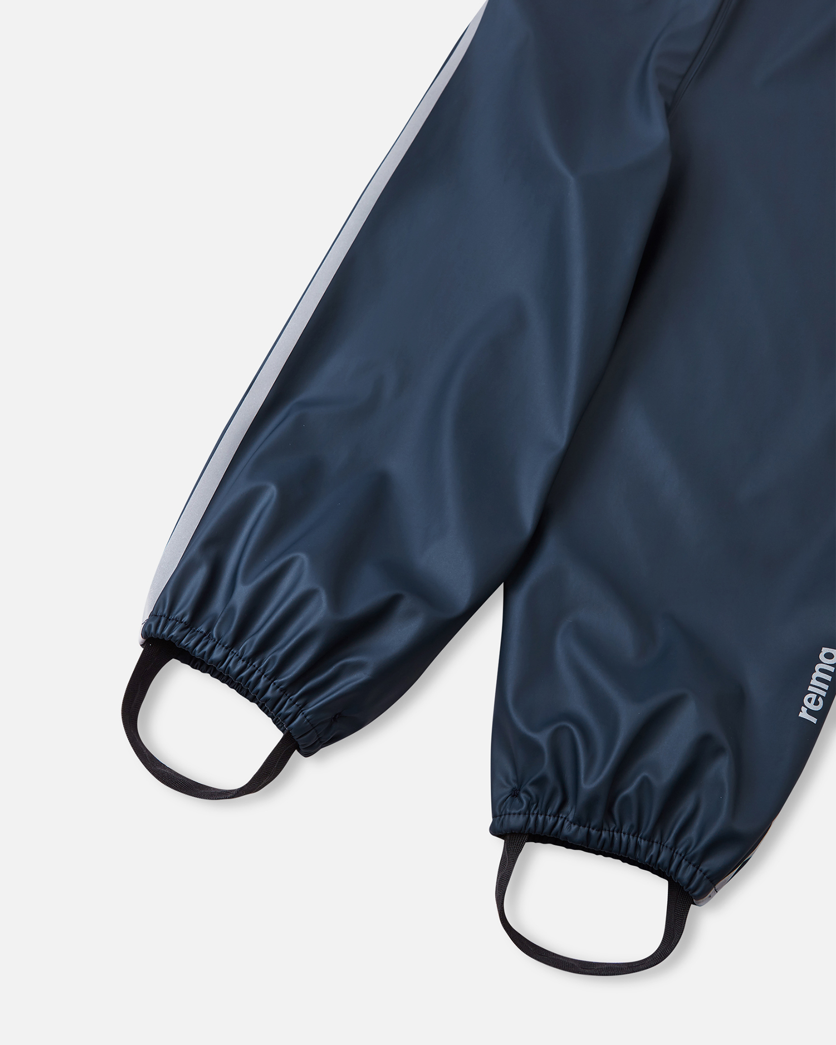 Комплект изготовлен без ПВХ и дополнен светоотражающими деталями для безопасности ребёнка даже в сумерках. Практичные элементы включают: регулируемые подтяжки и талию, эластичные концы штанин, съёмные штрипки и светоотражающие акценты.