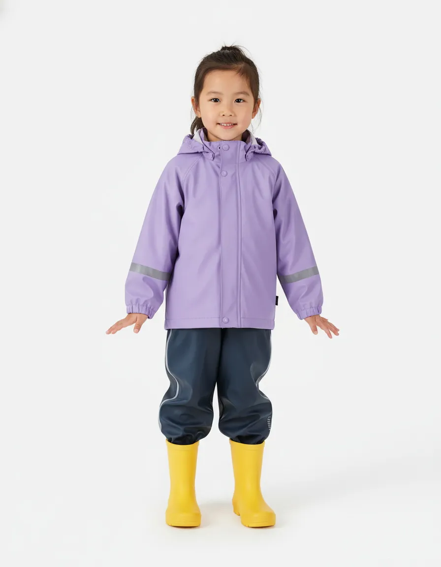Комплект изготовлен без ПВХ и дополнен светоотражающими деталями для безопасности ребёнка даже в сумерках. Практичные элементы включают: регулируемые подтяжки и талию, эластичные концы штанин, съёмные штрипки и светоотражающие акценты.