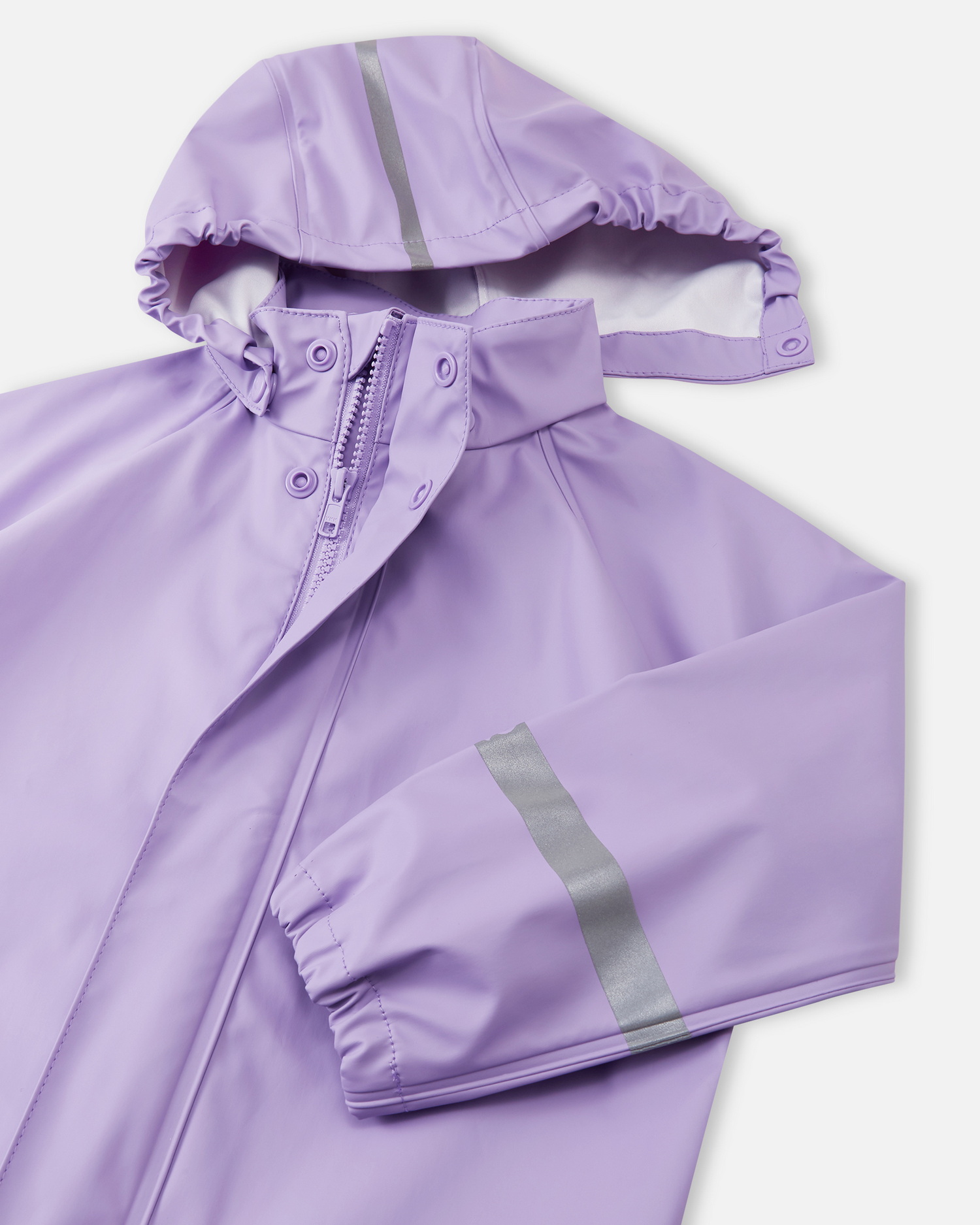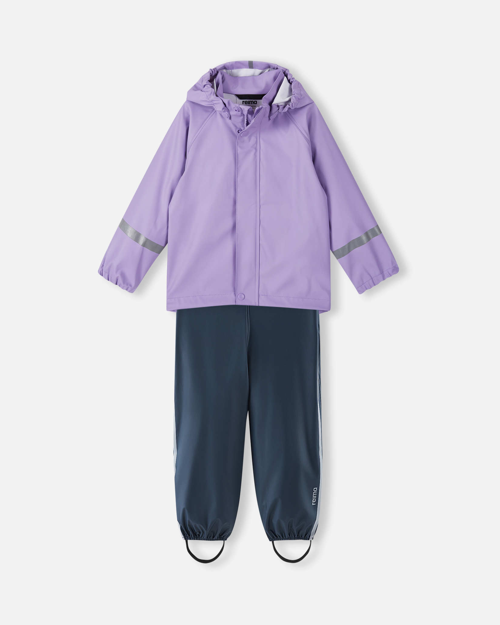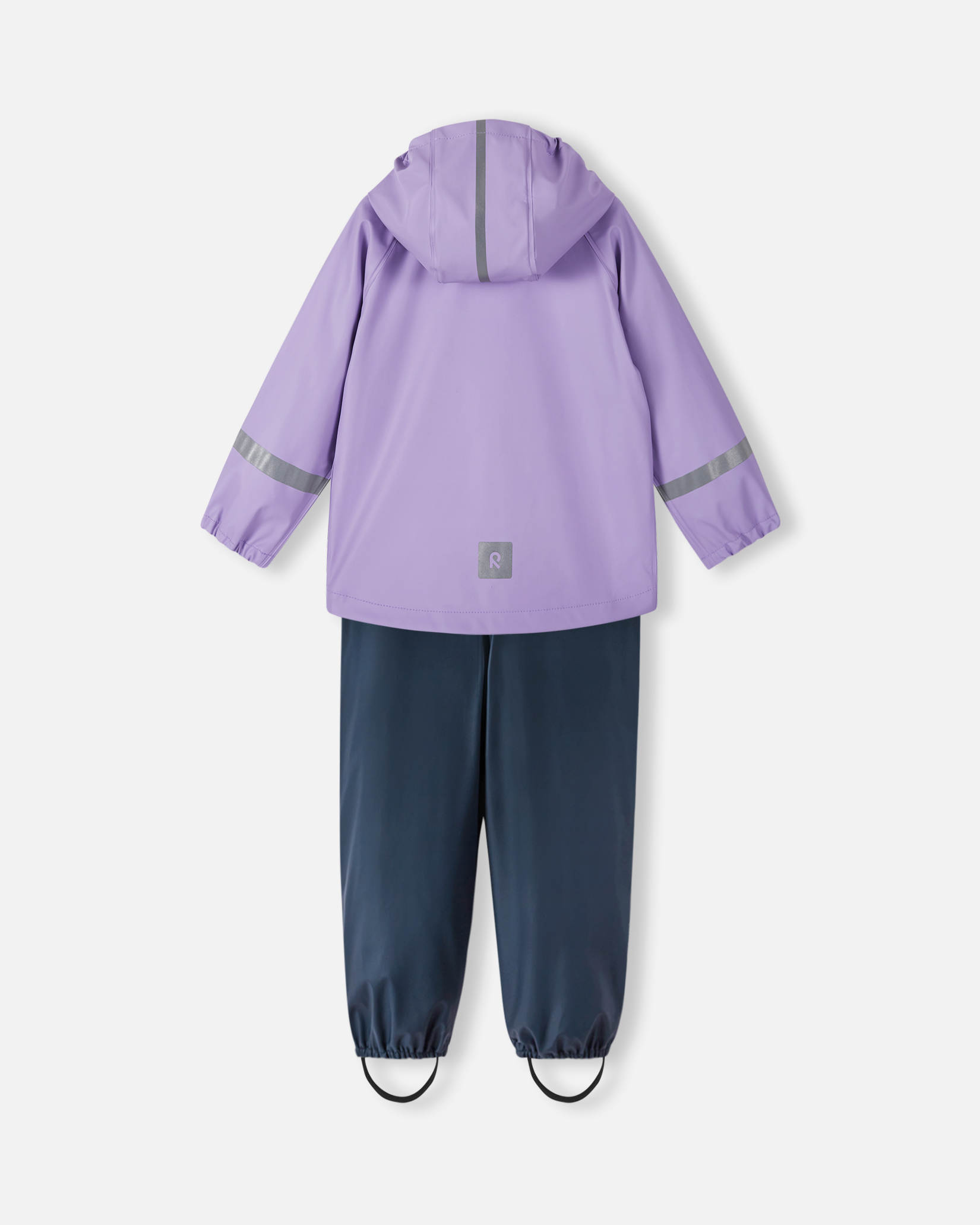 Комплект изготовлен без ПВХ и дополнен светоотражающими деталями для безопасности ребёнка даже в сумерках. Практичные элементы включают: регулируемые подтяжки и талию, эластичные концы штанин, съёмные штрипки и светоотражающие акценты.