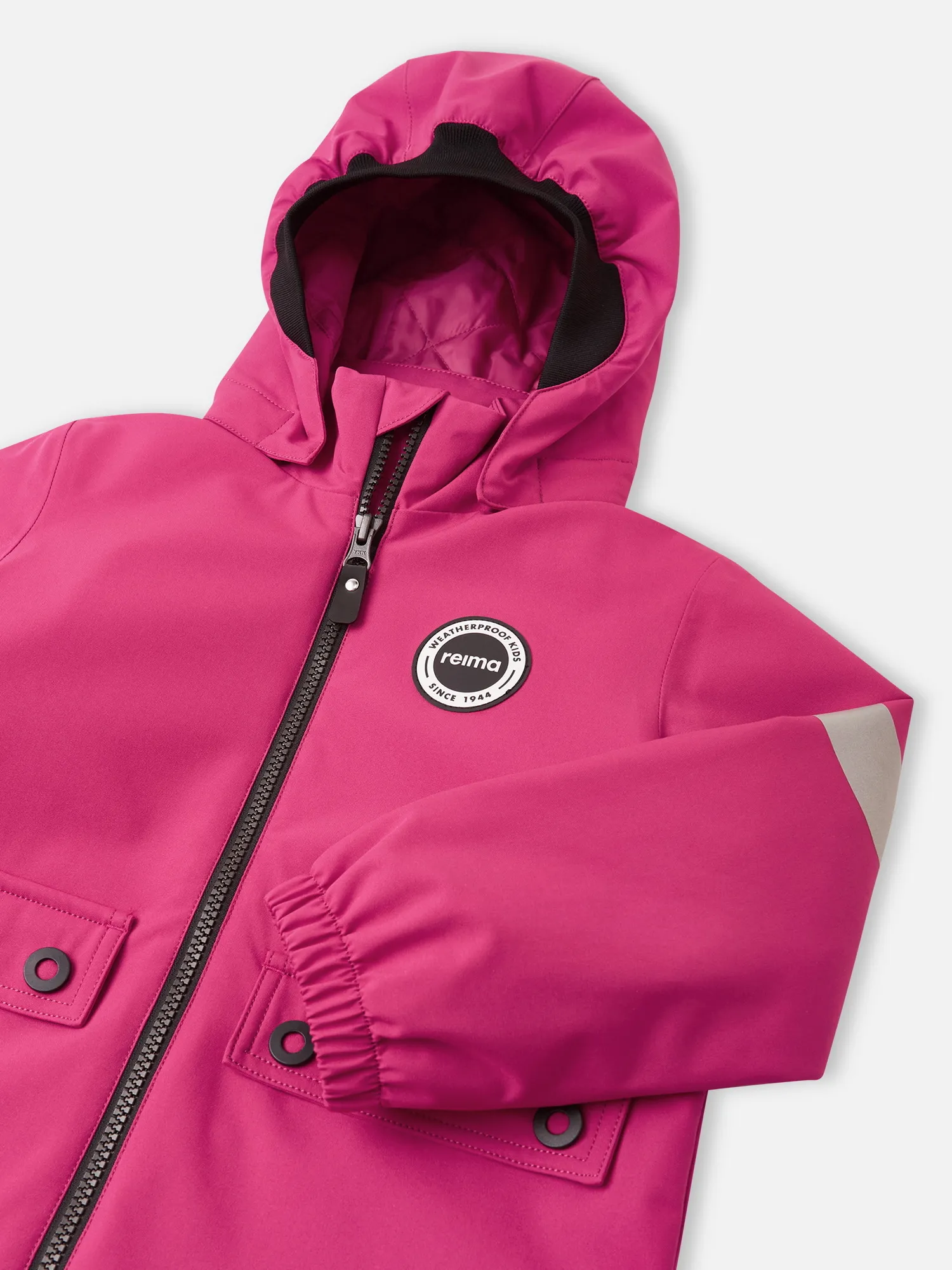 Безопасный съемный капюшон с резинкой по краю и эластичные манжеты для защиты от ветра и холода, а также большие карманы с клапанами для хранения найденных сокровищ. Теперь маленького искателя приключений не остановит переменчивая погода!