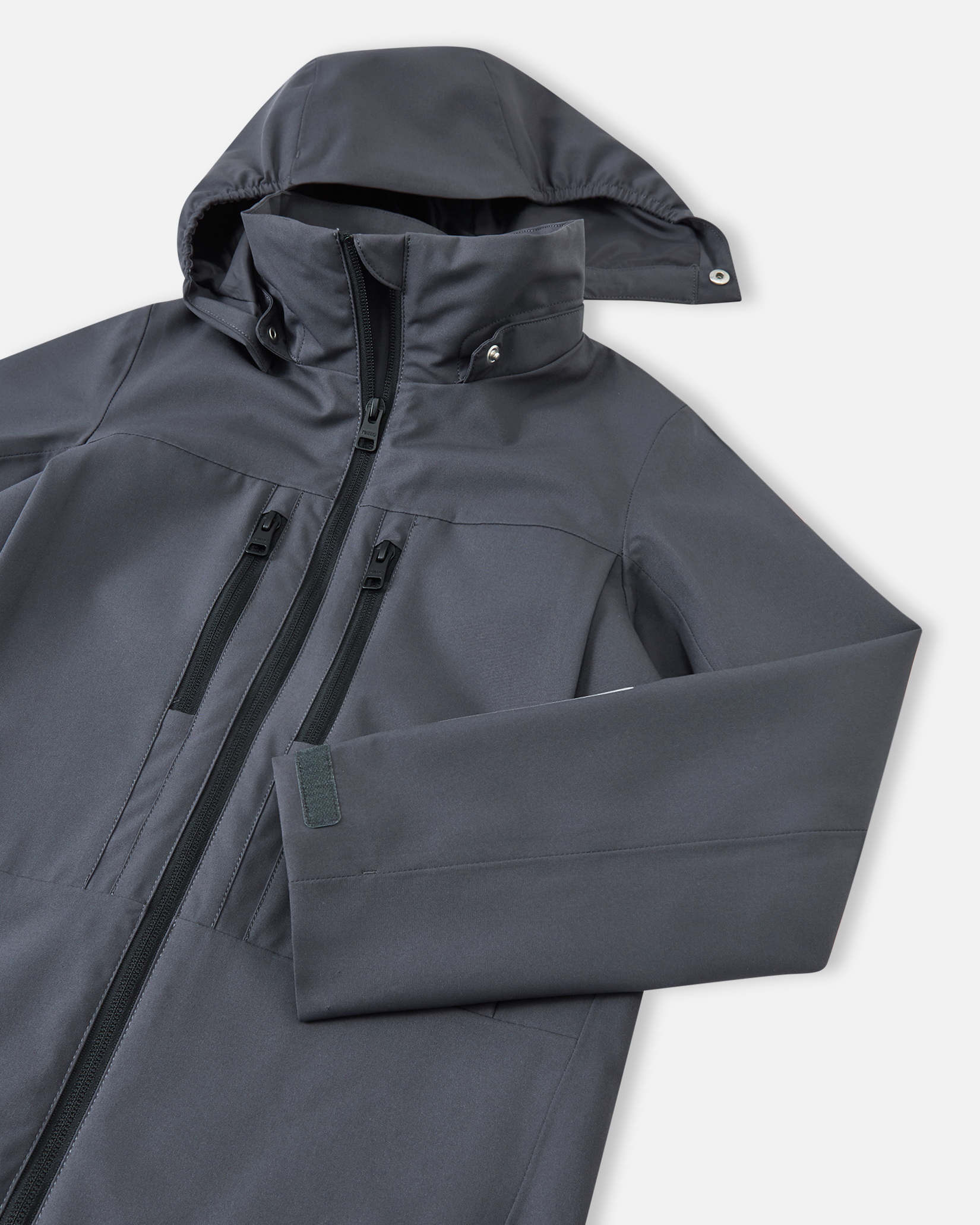 Модель дополнена приподнятым воротником для защиты от холода, съёмным капюшоном, регулируемыми манжетами на липучках и удобной молнией. Нагрудные карманы завершают функциональный дизайн.