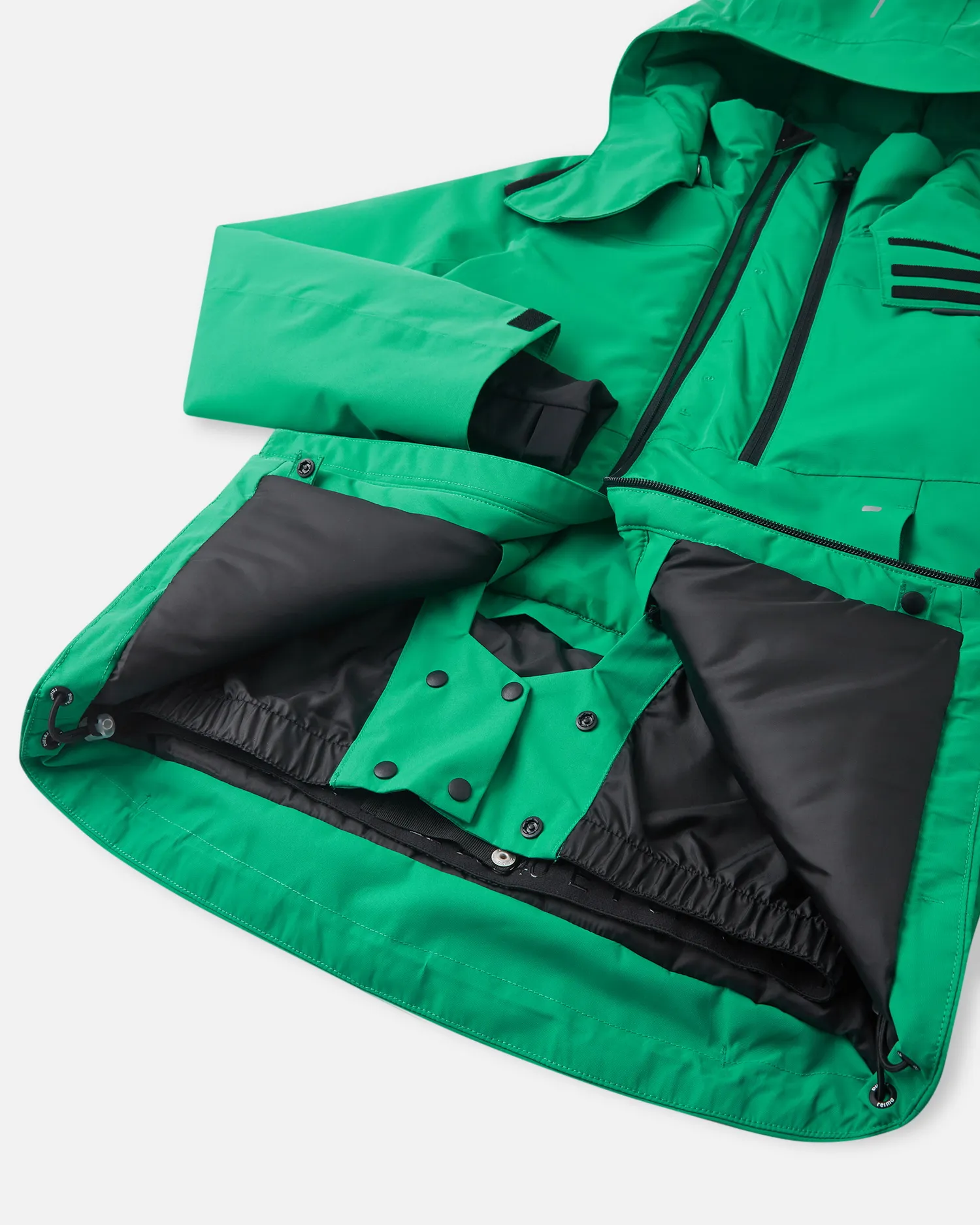 - Внутри встроенная снежная юбка обеспечивает дополнительную защиту от холода, а также предотвращает попадание снега под куртку даже в случае падения.