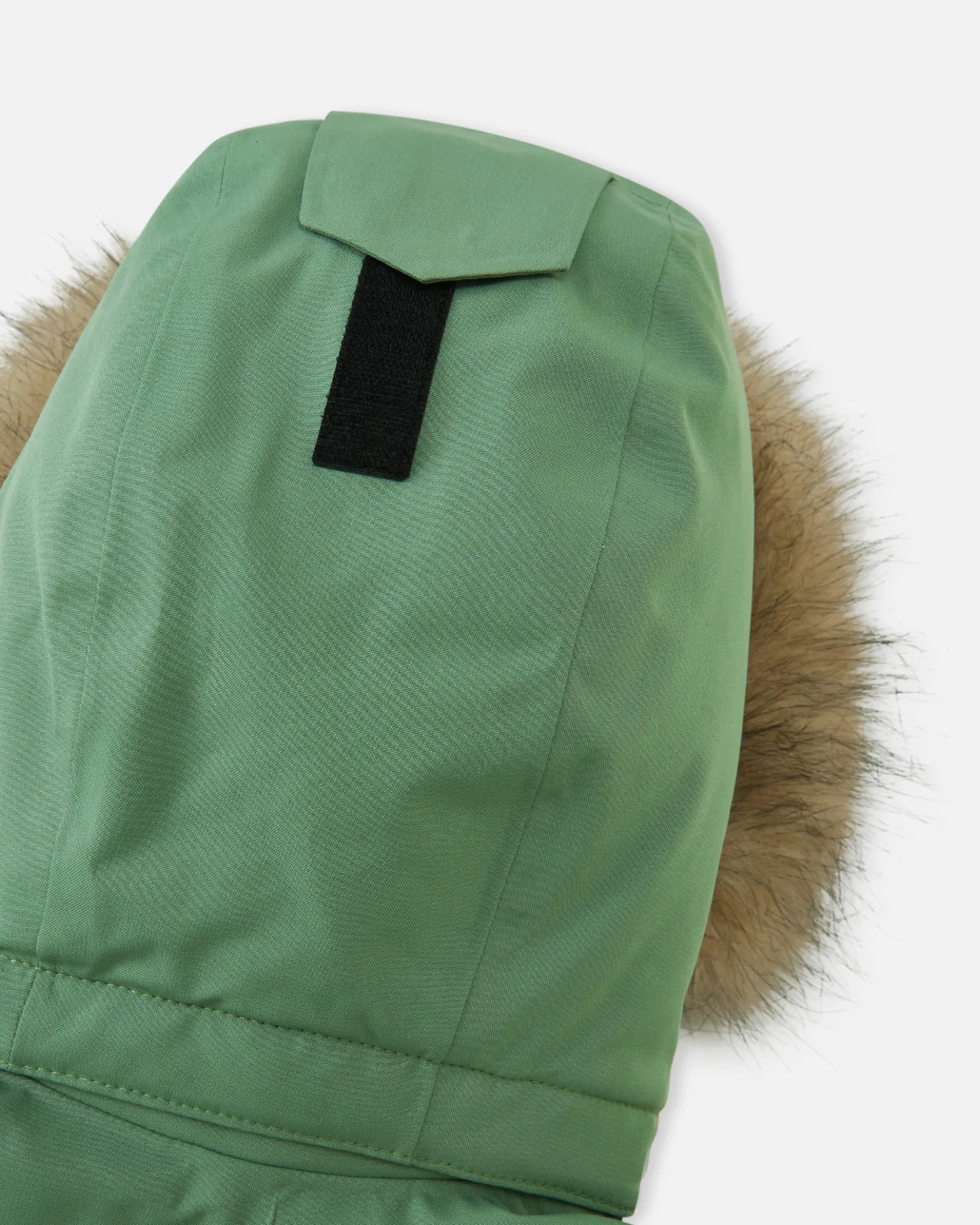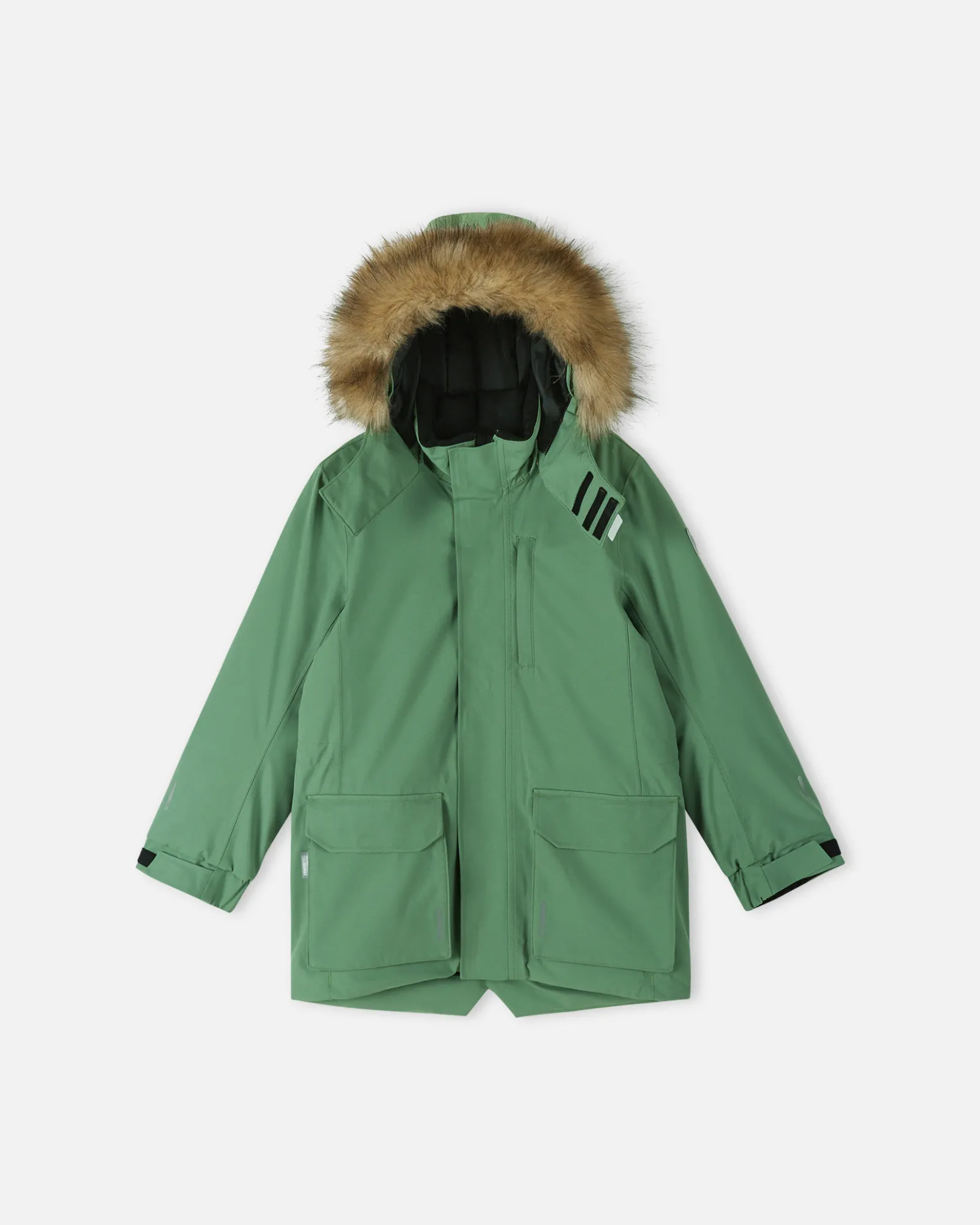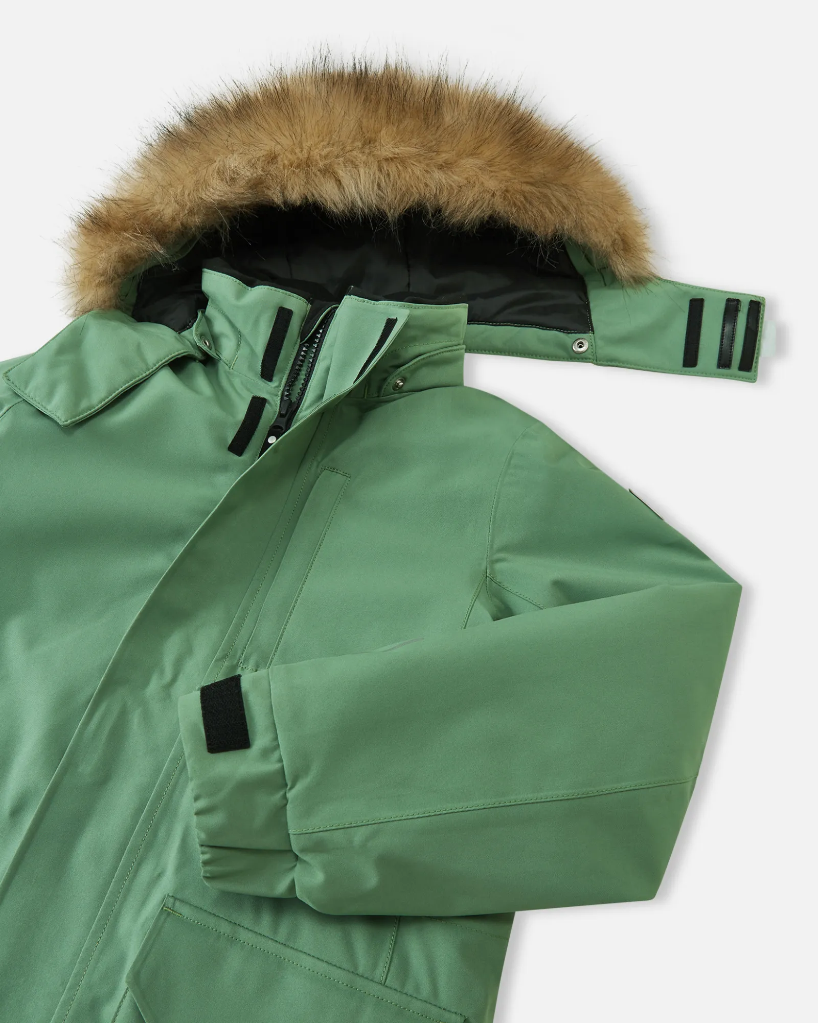 Зимняя парка изготовлена из водонепроницаемого материала с проклеенными швами и защищает от холода, гарантируя, что ваш ребенок останется в сухости и комфорте. Прочный материал хорошо дышит и устойчив к воде и грязи, что делает стирку легкой. 100% переработанный утеплитель обеспечивает приятное тепло. Для дополнительного комфорта парка имеет регулируемую талию, манжеты и безопасный съемный капюшон с отделкой из искусственного меха. Кроме того, эта модель имеет два удобных кармана с клапанами и нагрудный карман на молнии для маленьких сокровищ. Светоотражающие детали помогут сделать детей более заметными в темноте, а так же хорошей идеей будет повесить дополнительный светоотражатель на петлю, которая спрятана под правым клапаном переднего
