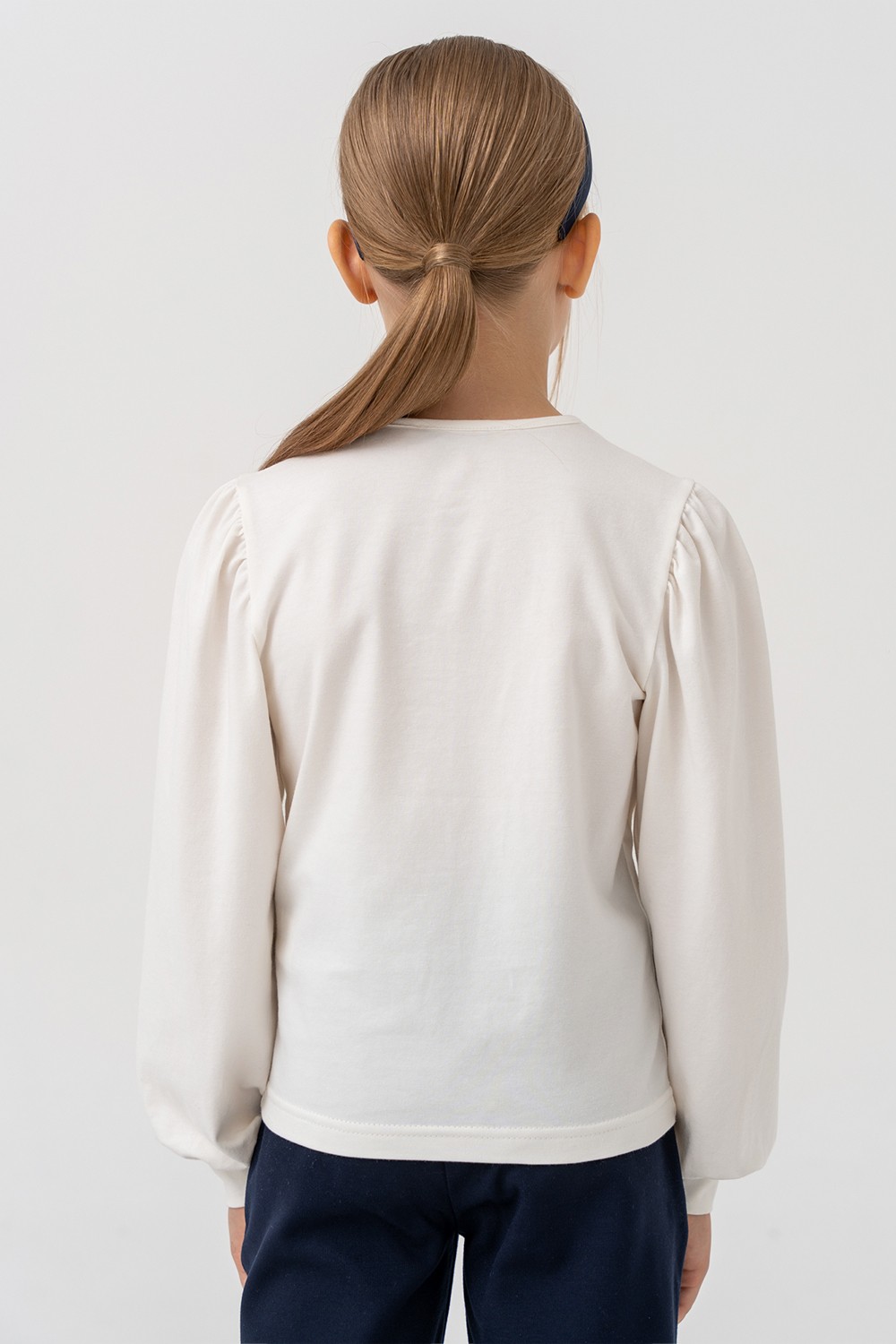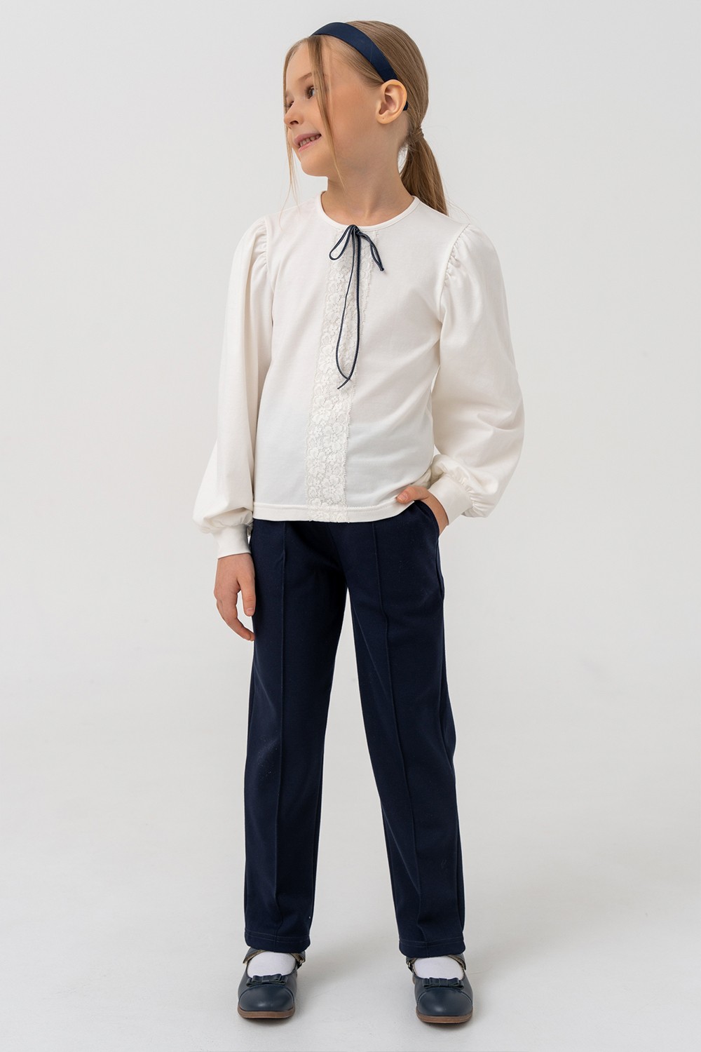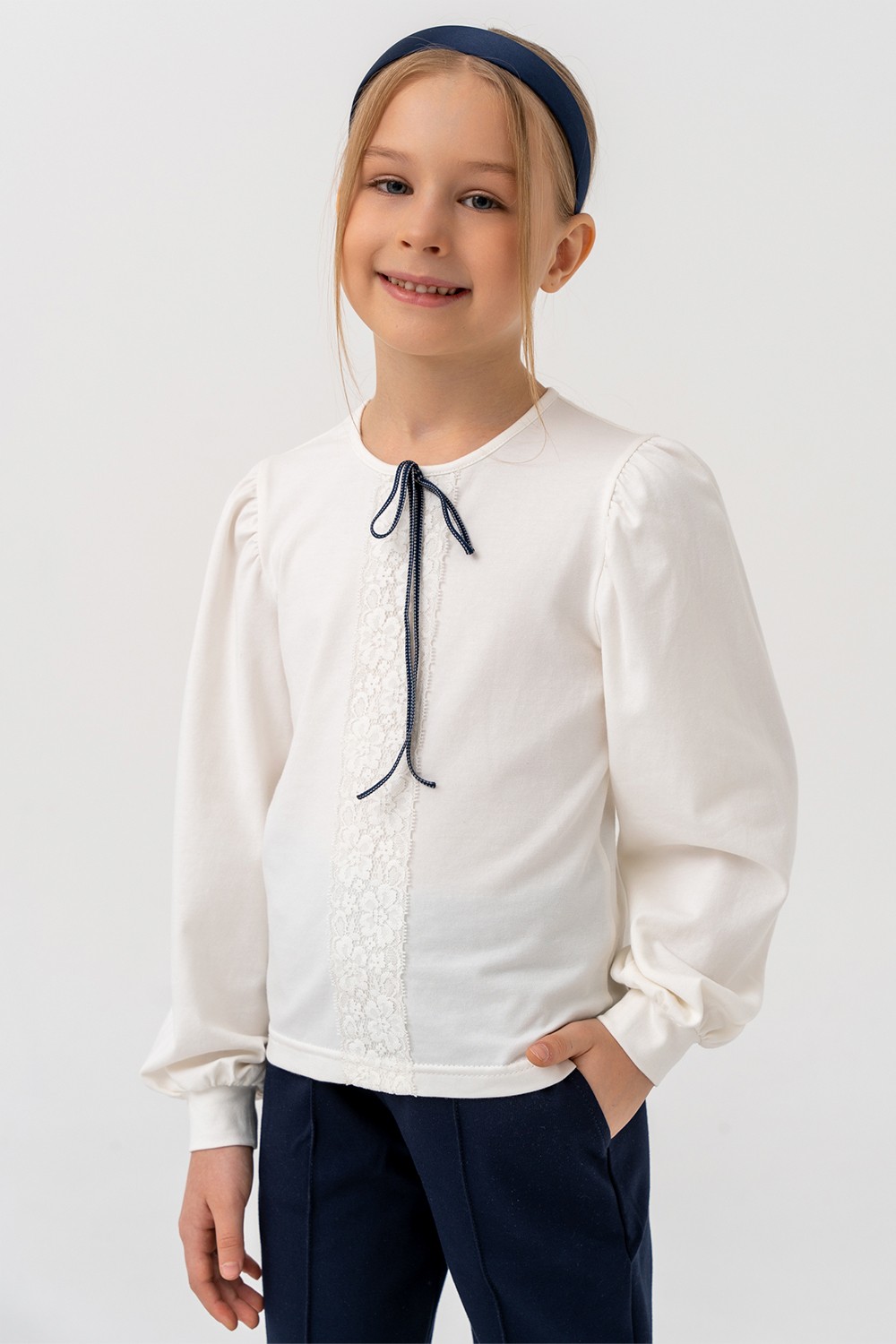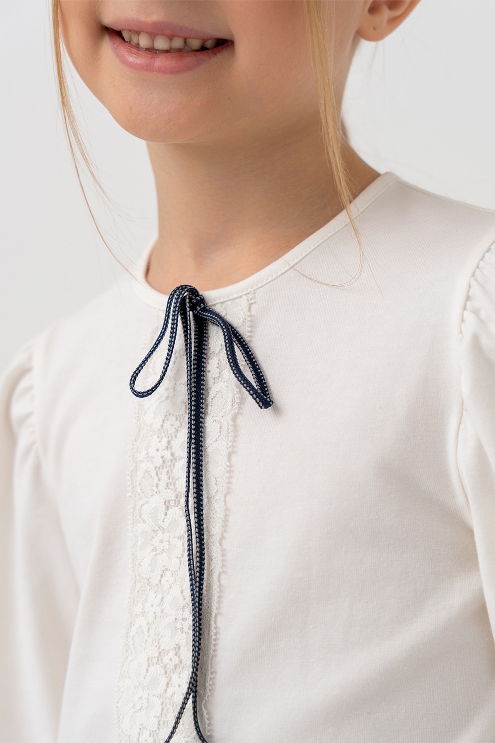 Белый лонгслив с объёмными рукавами и декоративной вставкой из кружева спереди. Аккуратный бантик из отделочной ленты подчёркивает образ. Манжеты выполнены из мягкого эластичного трикотажа для удобной посадки. Отличный вариант для школы и повседневной носки.