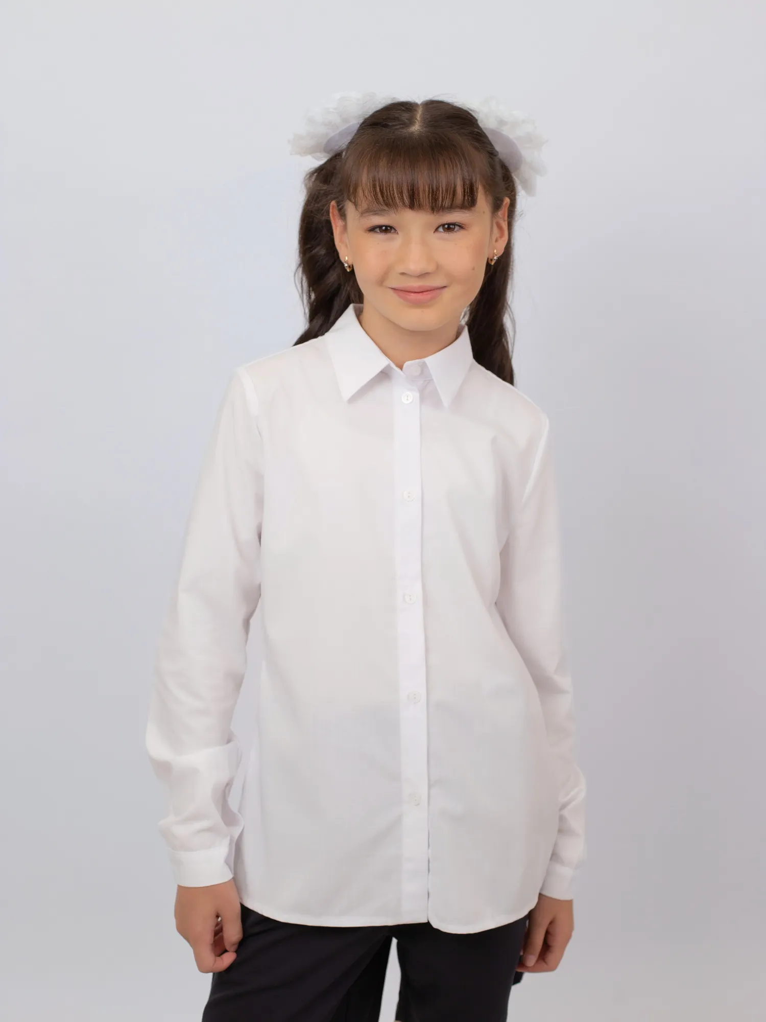 Блузка для девочек начальной и средней школы полуприлегающего силуэта. Лаконичный дизайн делает её универсальным вариантом для школы и повседневной носки. Классическая модель, которая легко сочетается с юбками, брюками и сарафанами.