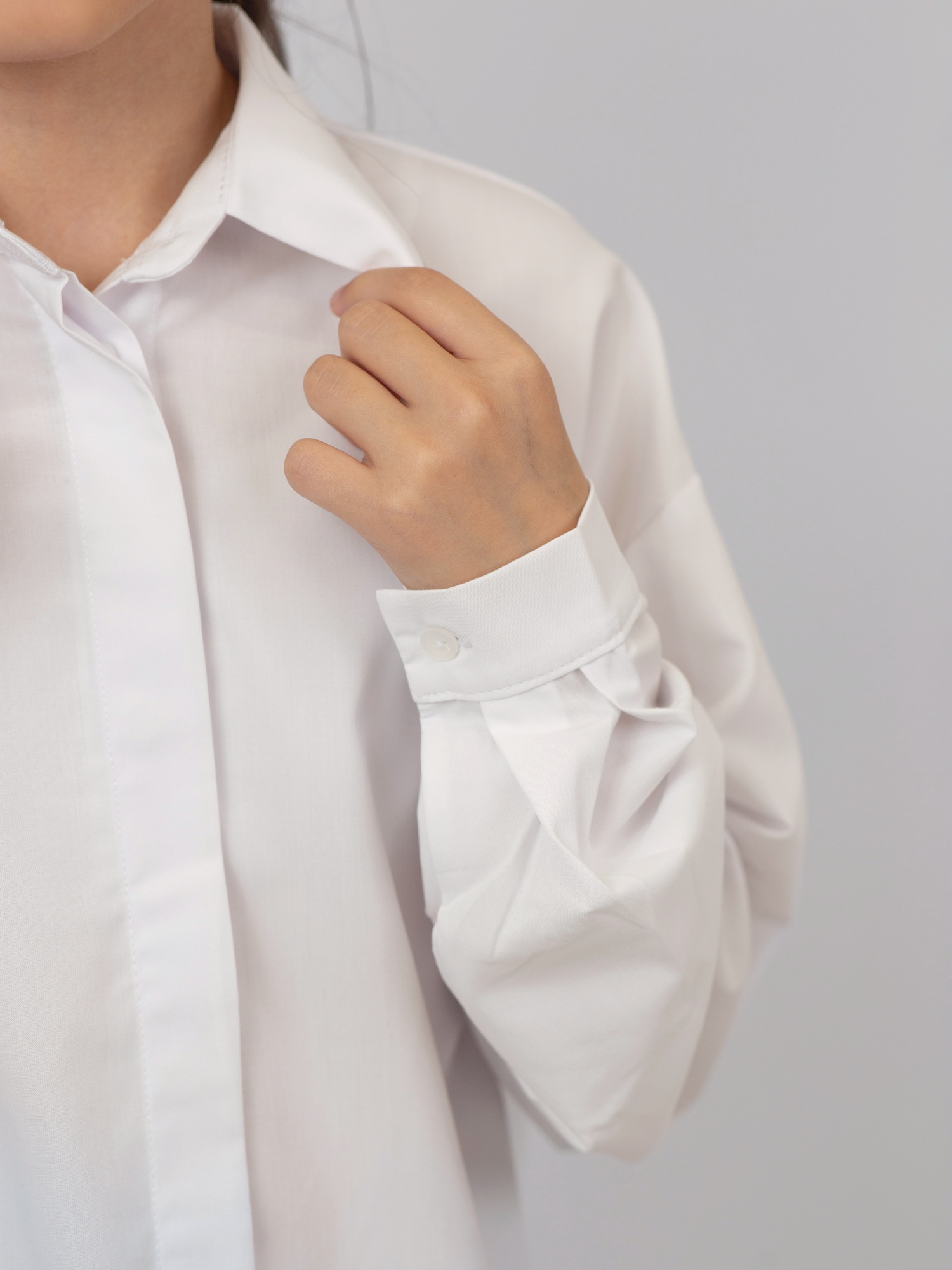 | Блузка для девочек в современном оверсайз-силуэте со спущенной линией плеча. Прямой крой и преувеличенный объем обеспечивают комфорт и свободу движений. Воротник-стойка дополнен контрастной черной пуговицей — стильный акцент в лаконичном дизайне. Отличный выбор для школьного гардероба и повседневных образов. |