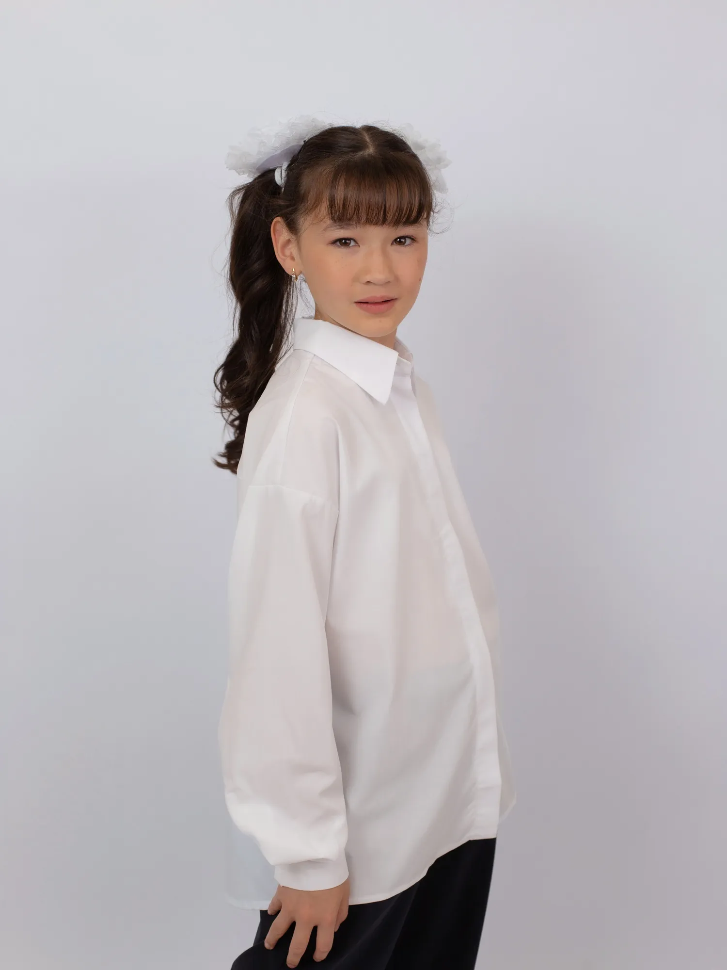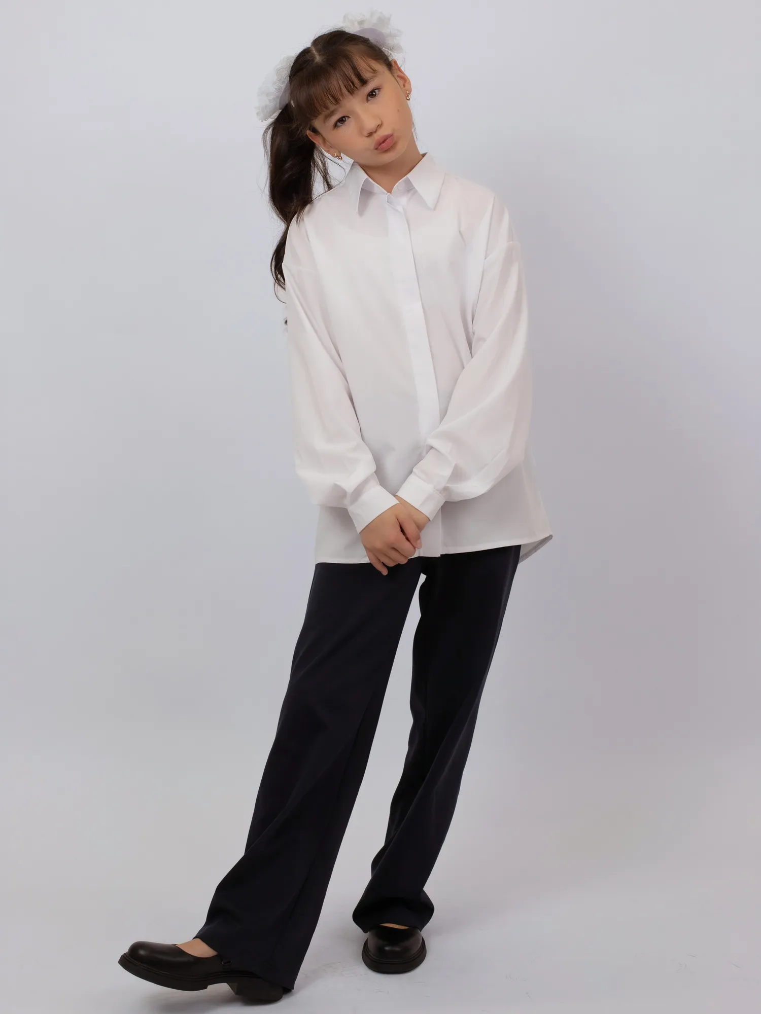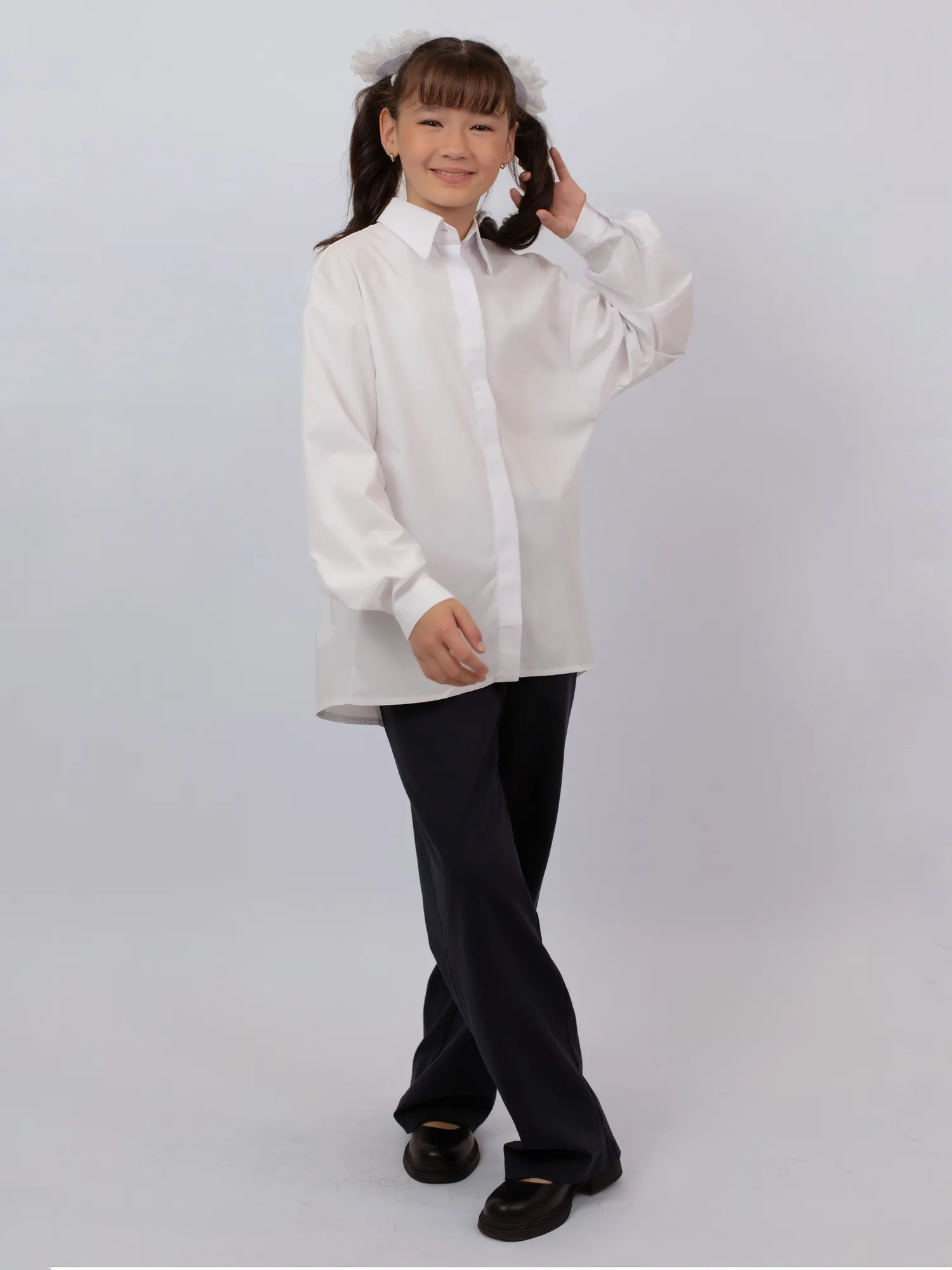 | Блузка для девочек в современном оверсайз-силуэте со спущенной линией плеча. Прямой крой и преувеличенный объем обеспечивают комфорт и свободу движений. Воротник-стойка дополнен контрастной черной пуговицей — стильный акцент в лаконичном дизайне. Отличный выбор для школьного гардероба и повседневных образов. |