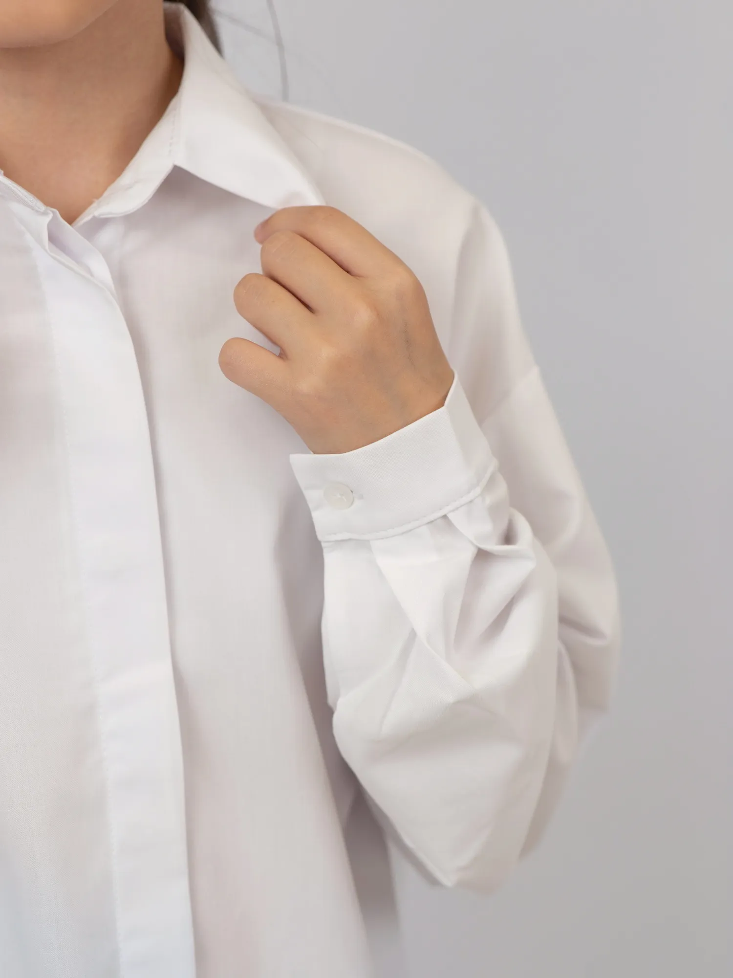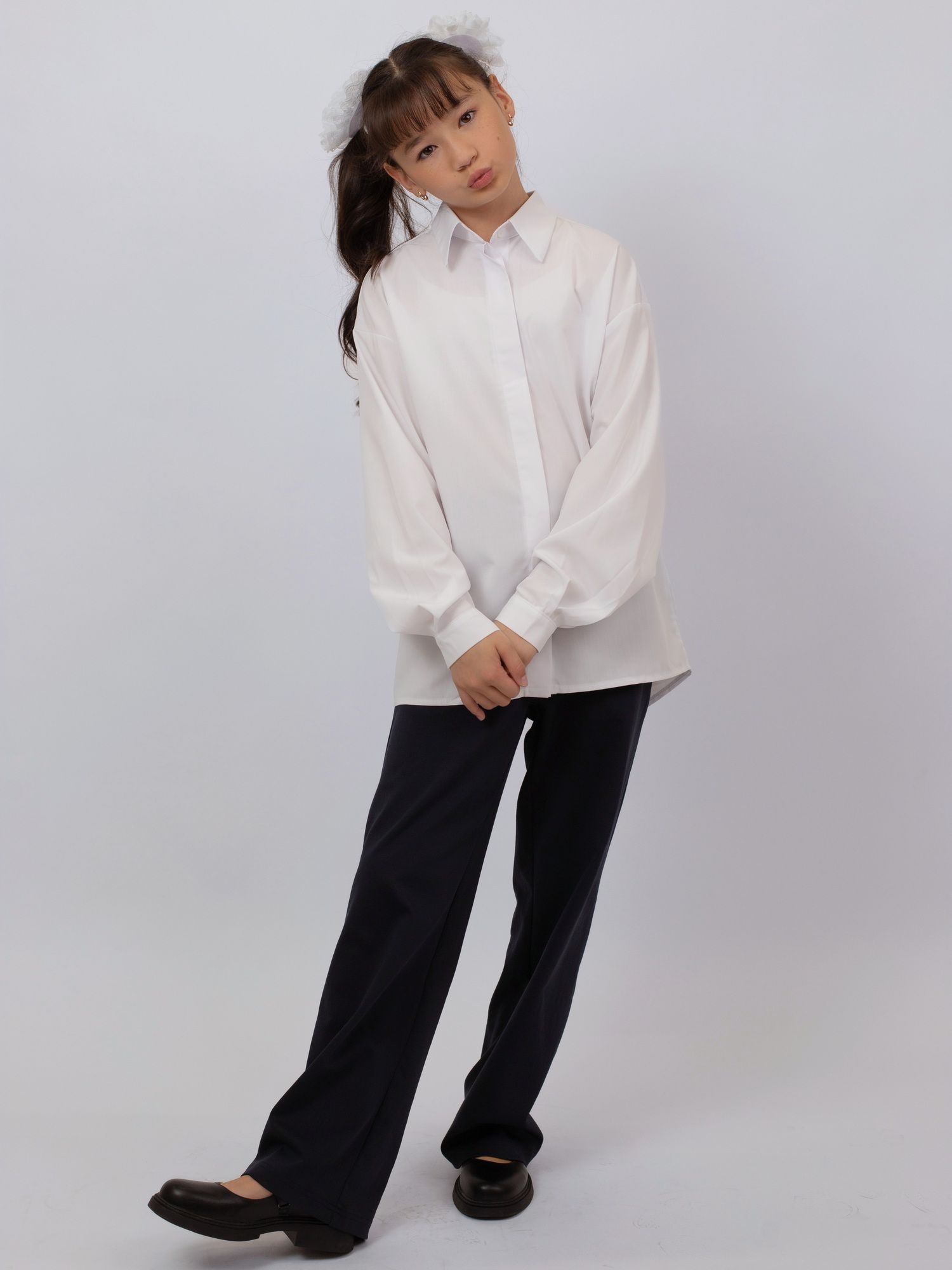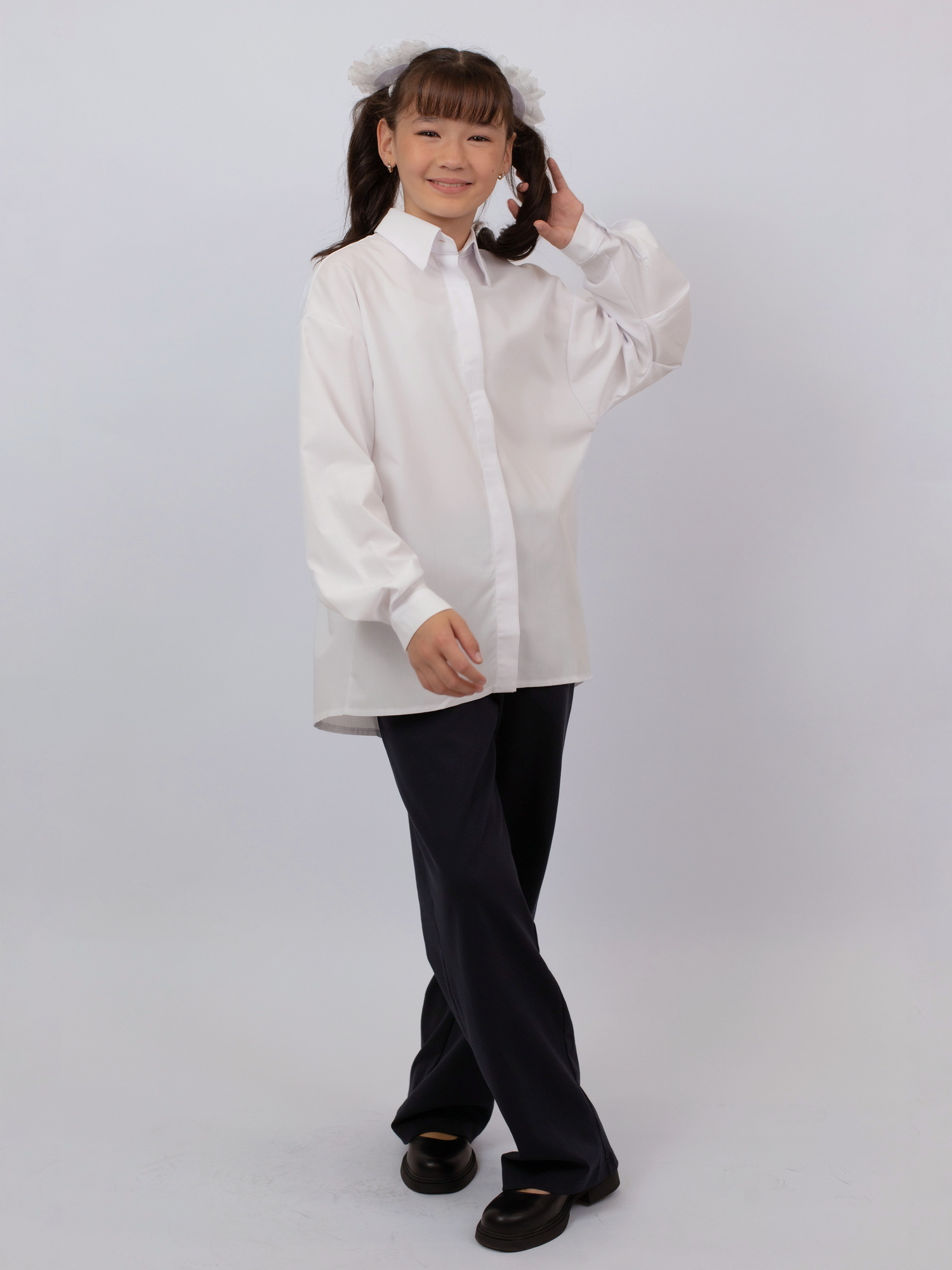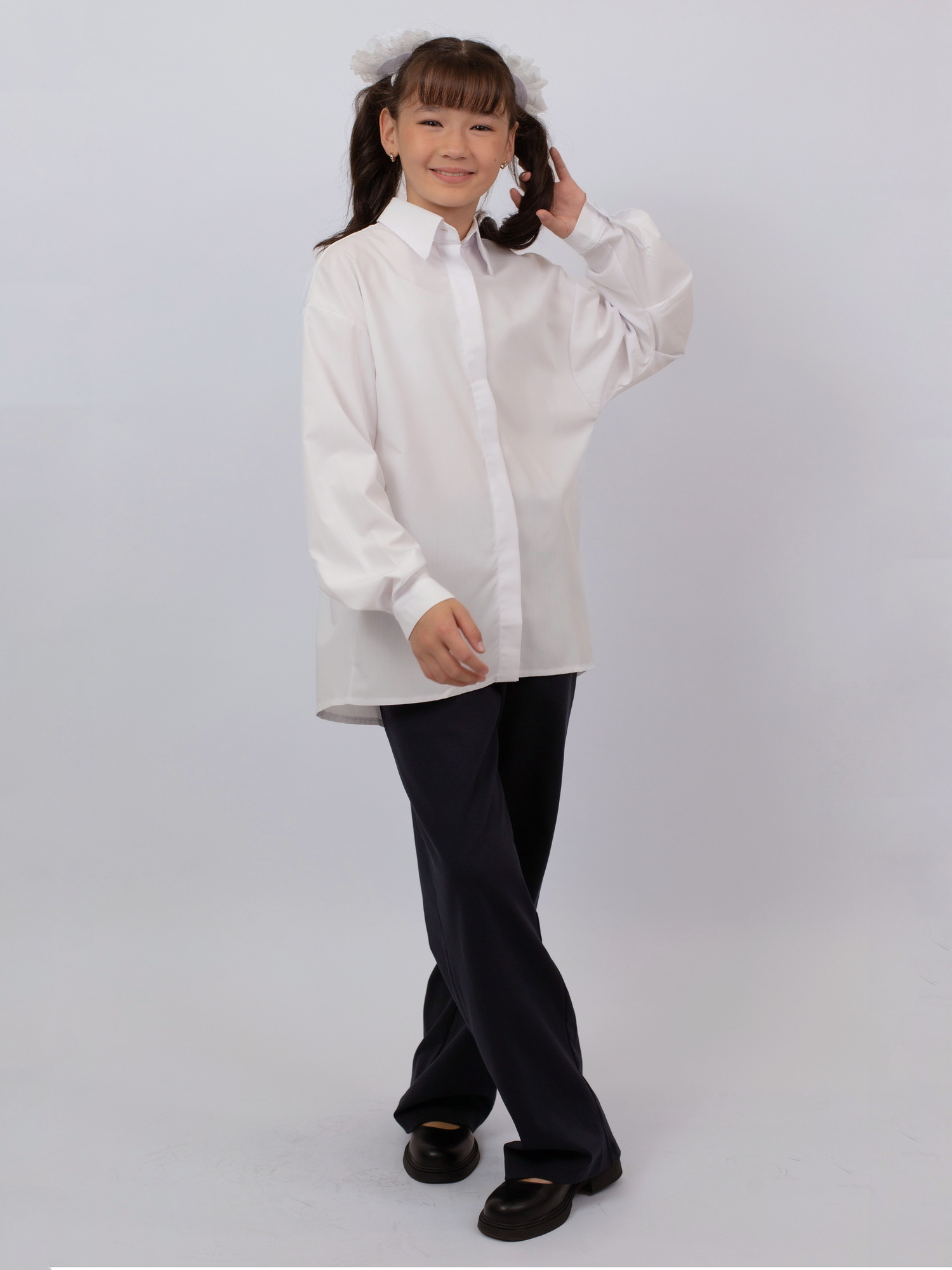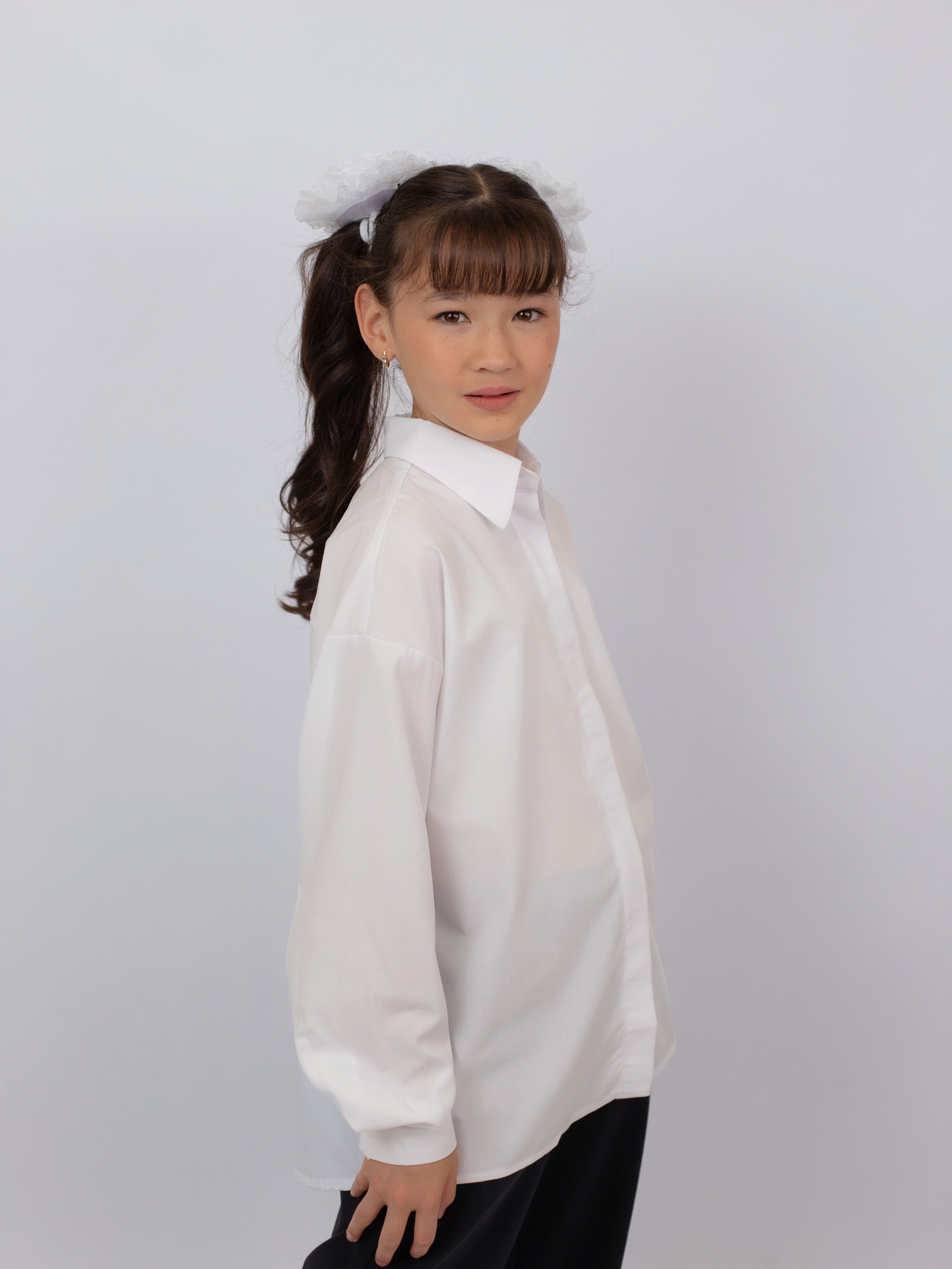 Блузка для девочек в современном оверсайз-силуэте со спущенной линией плеча. Прямой крой и преувеличенный объем обеспечивают комфорт и свободу движений. Воротник-стойка дополнен контрастной черной пуговицей — стильный акцент в лаконичном дизайне. Отличный выбор для школьного гардероба и повседневных образов.